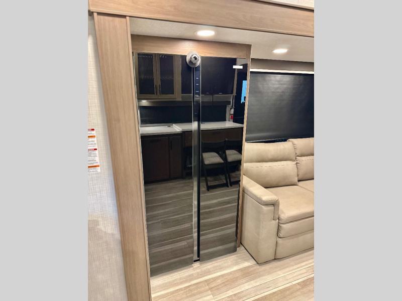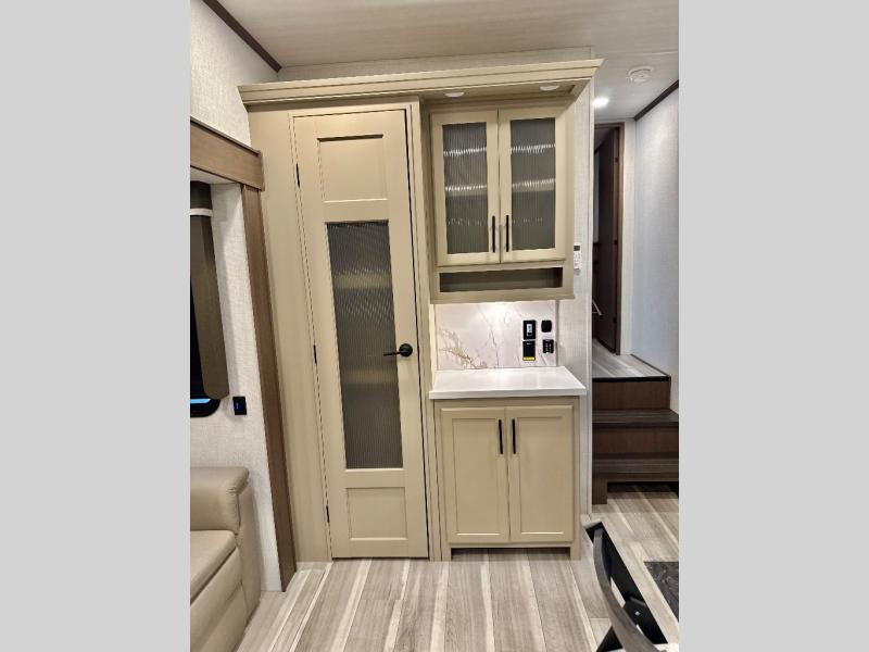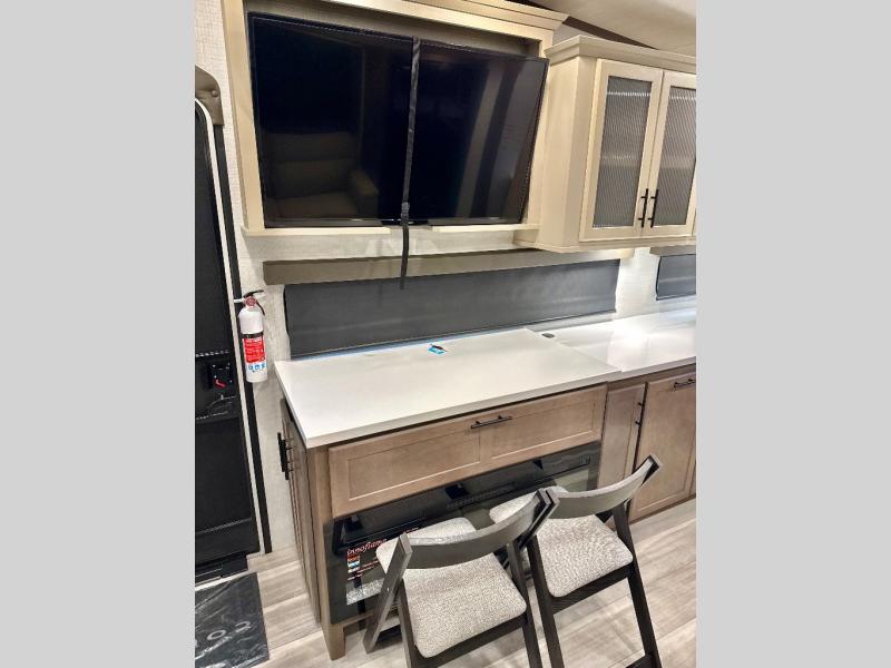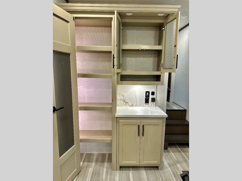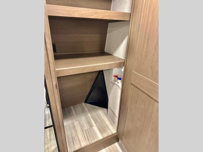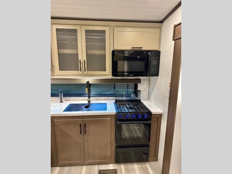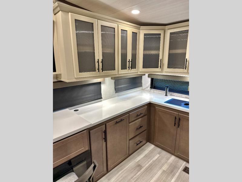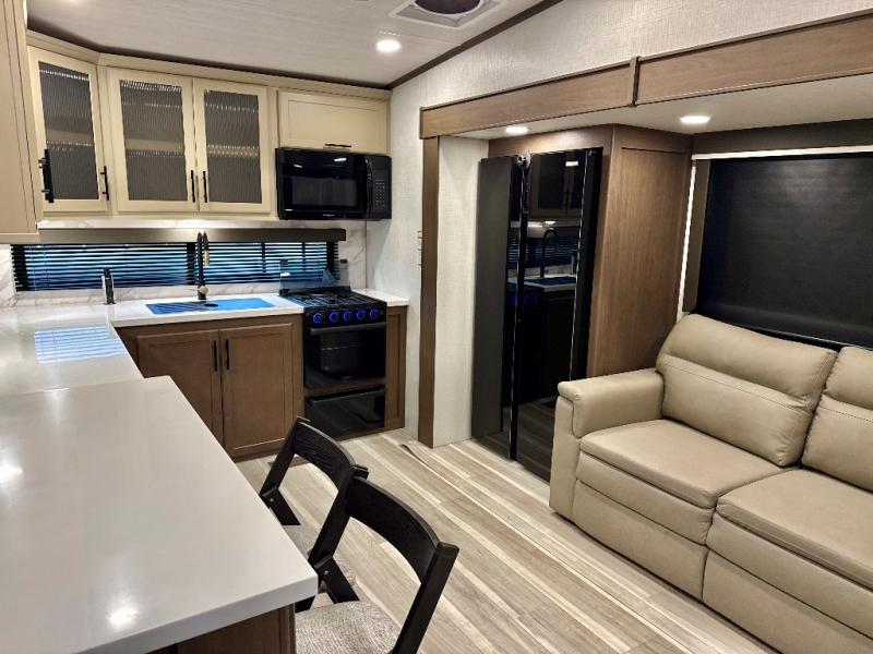 This fifth wheel is packed with premium features you won't want to camp without. You'll feel at home in the front private bedroom with its queen bed slide out with storage underneath, full-height wardrobe, plus a wardrobe with washer and dryer prep. There is even dresser with a sliding top with hidden storage for your valuables. If you have any guests, they can sleep on the tri-fold sleeper sofa within the living room slide, and there is a fireplace and LED HDTV here in perfect view for movie nights. This Cougar fifth wheel features a rear kitchen with tons of counter space, a convenient pull out trash can, and a high-rise chef's faucet and sprayer. The pull-out table in front of the fireplace will provide a place to dine at, or you can sit outdoors under the 20' power awning, and you'll also find an outside refrigerator to keep drinks stocked!