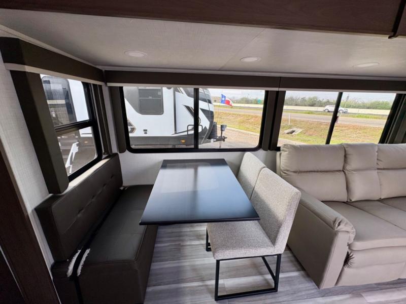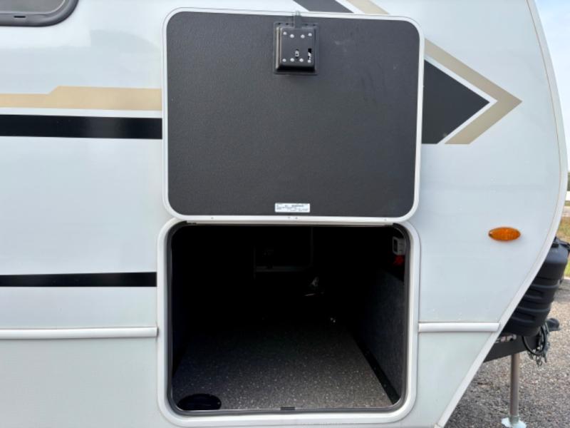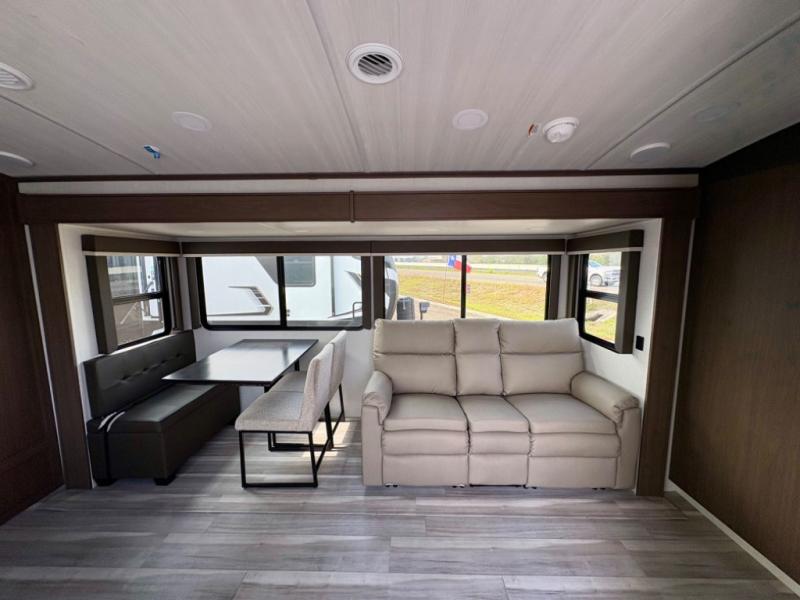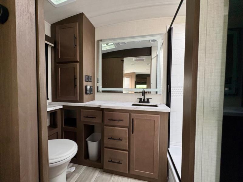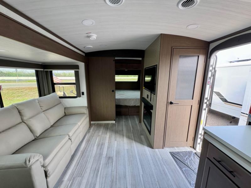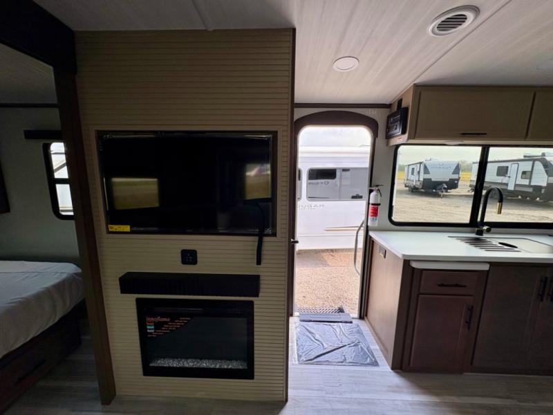 Wherever you decide to camp in this travel trailer, you'll be met with comfort and convenience! The full rear bath includes a space saving sliding door, toilet, sink, and linen closet for towels. A large slide out provides more space to move about, and here you'll enjoy the tri-fold sleeper sofa and booth dinette with storage drawers. There is also a fireplace and TV across from the furniture to enjoy movie nights! The chef of your group can make meals on the cooktop or in the microwave, and there is a pull-out countertop for extra counter space. Up front, a private bedroom includes a king bed, dual nightstands, and washer and dryer prep.