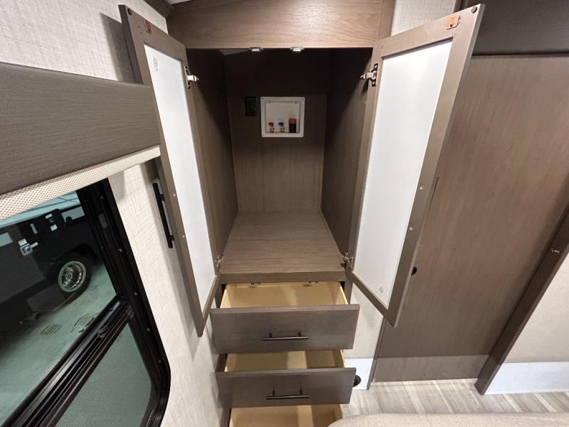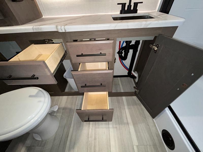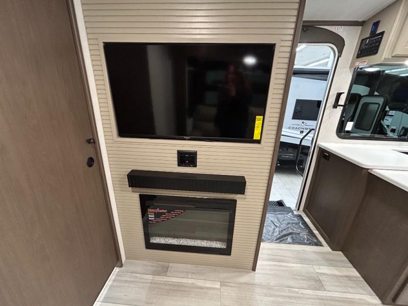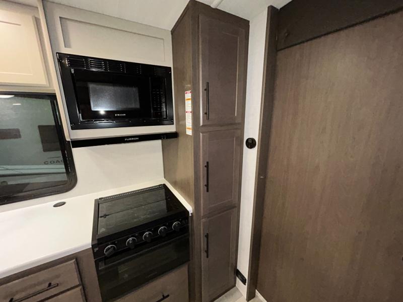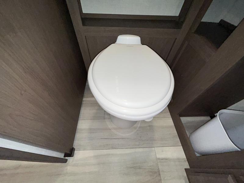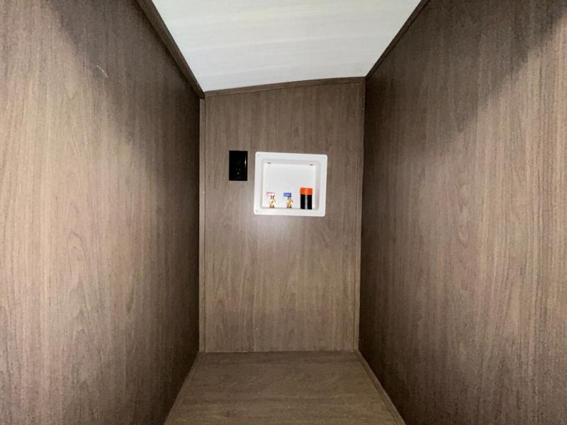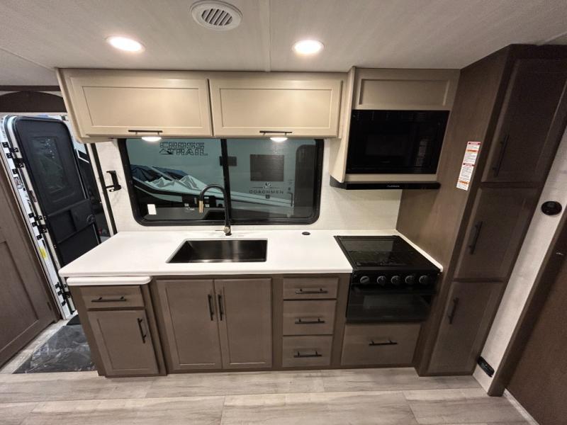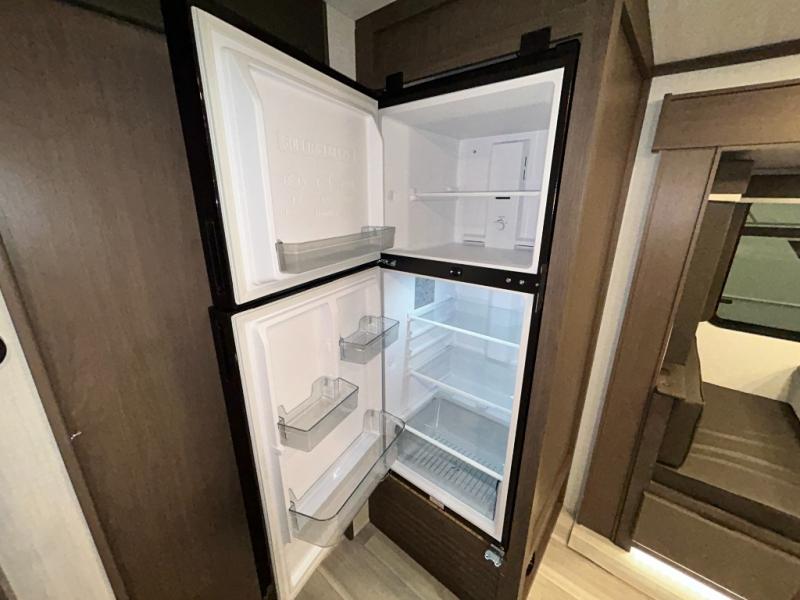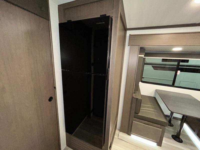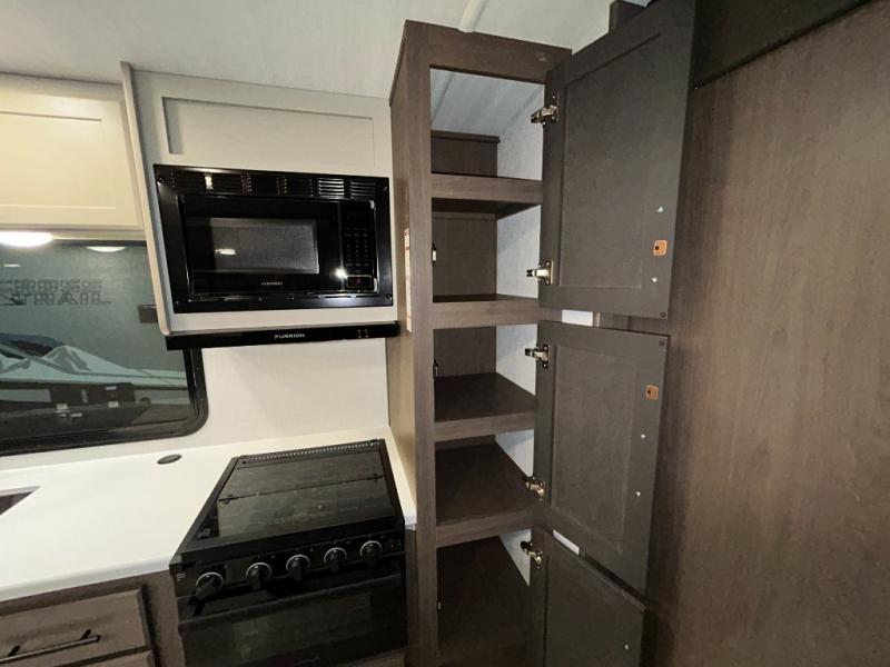 Wherever you decide to camp in this travel trailer, you'll be met with comfort and convenience! The full rear bath includes a space saving sliding door, toilet, sink, and linen closet for towels. A large slide out provides more space to move about, and here you'll enjoy the tri-fold sleeper sofa and booth dinette with storage drawers. There is also a fireplace and TV across from the furniture to enjoy movie nights! The chef of your group can make meals on the cooktop or in the microwave, and there is a pull-out countertop for extra counter space. Up front, a private bedroom includes a king bed, dual nightstands, and washer and dryer prep.