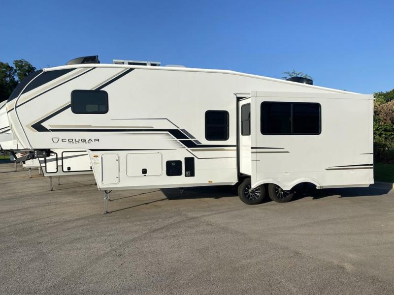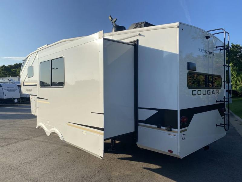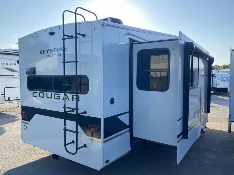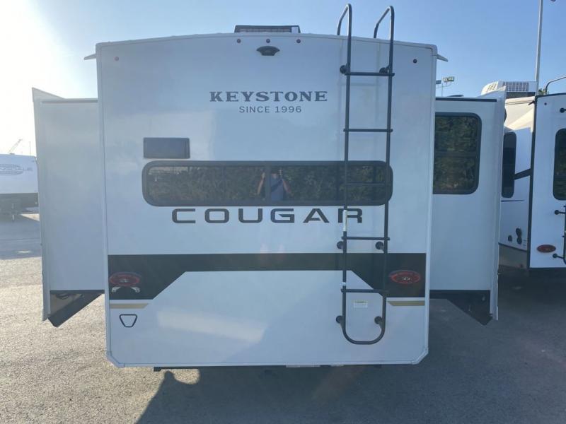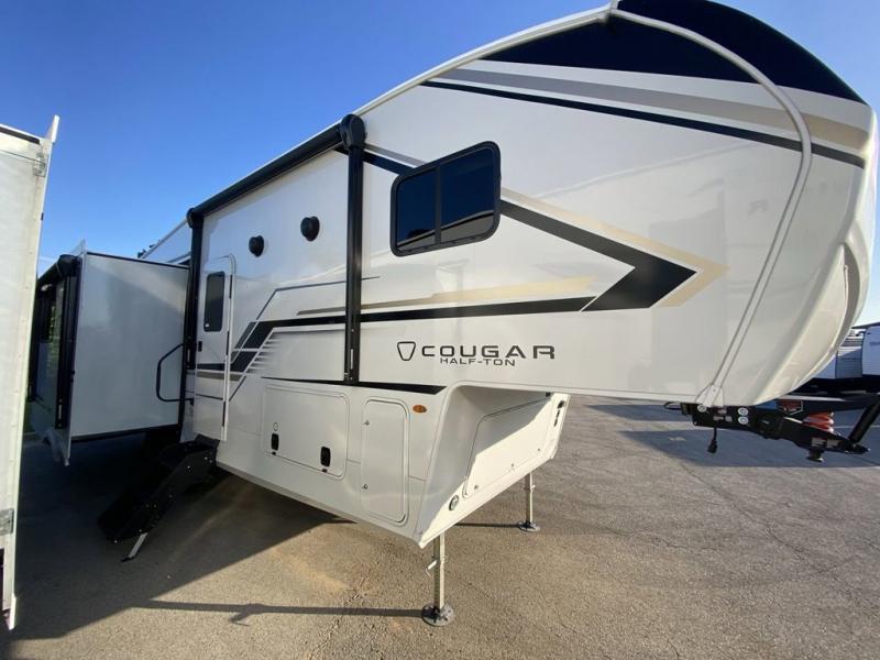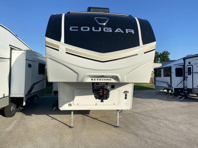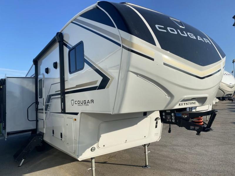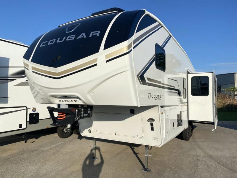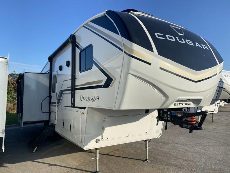 The Keystone Cougar Half-Ton fifth wheel and travel trailers are known as one of America's favorites for a reason! Some of those reasons are the exclusive features that come from Keystone, like the Winegard Air 360+ omni-directional rooftop antenna, the in-floor heating ducts, and the HyperCore composite wall construction with Vixen Fibrogloss high-gloss finish. The Cougar Half-Ton has a Climate Guard protection package with heat-deflecting white sidewalls, two roof attic vents, PEX plumbing and more to enjoy four season camping. Inside, you'll love the dimmable lighting, night roller shades throughout, shower skylight, and bedside USB outlets to keep your electronics charged.