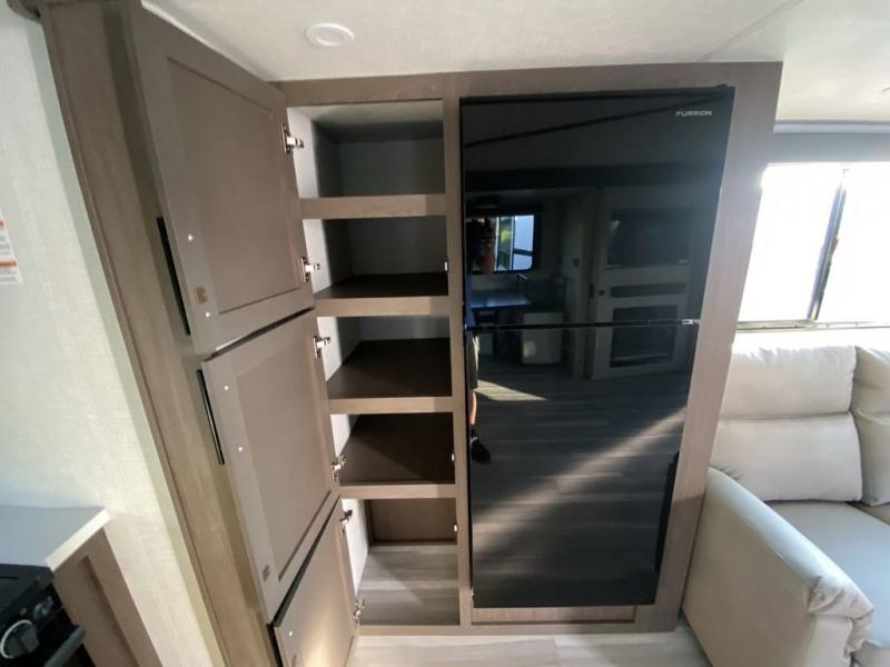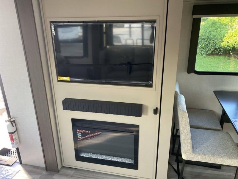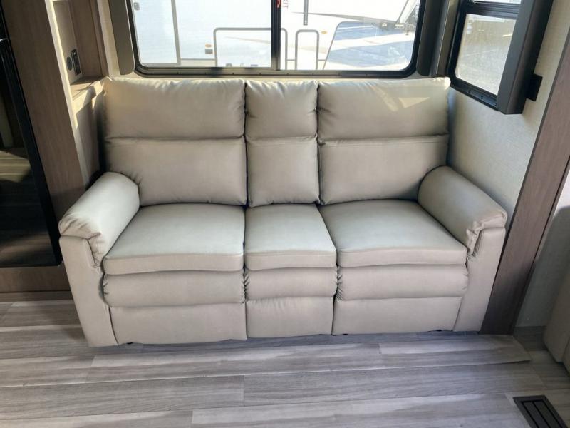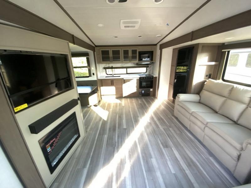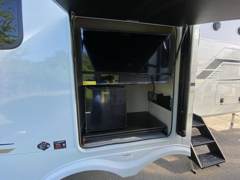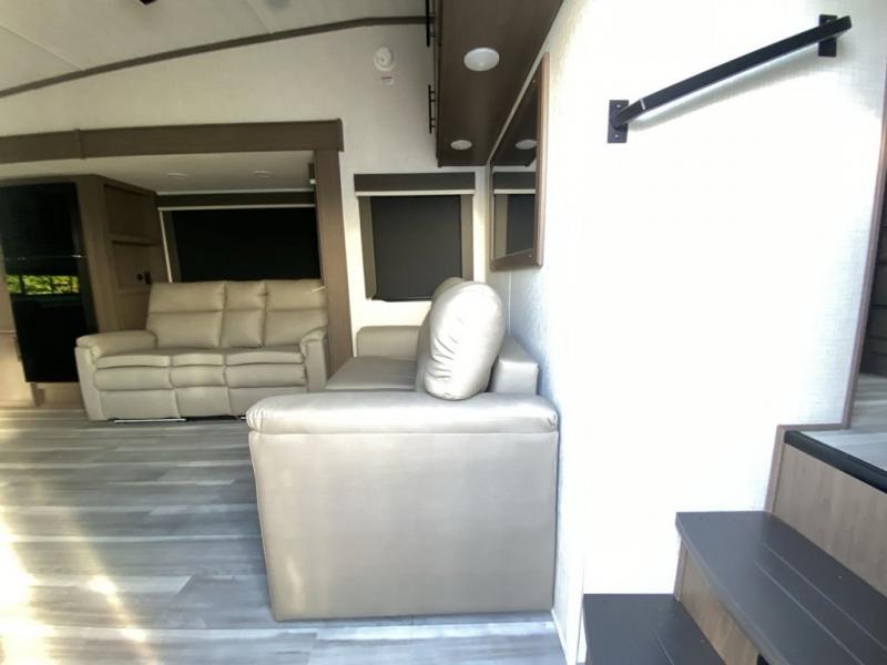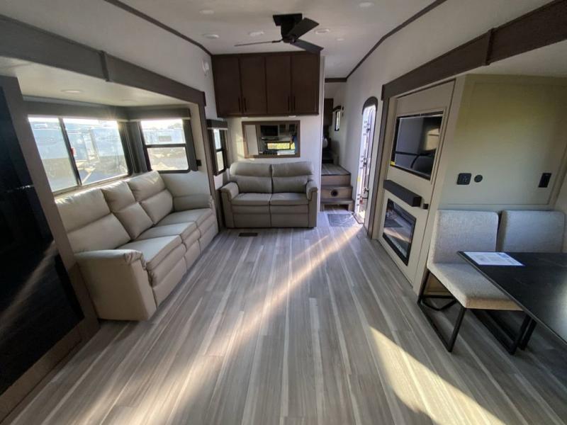 Time spent at the campground in this fifth wheel will be time well spent! Once you arrive, you can unload the unobstructed pass-thru storage, put out the two power awnings, and grab a cold drink from the outdoor mini refrigerator. Head inside to relax on the tri-fold sleeper sofa or theater seating across from the LED HDTV. The rear kitchen includes everything you need to make meals each day, including a pull-out countertop for more space plus a pantry and 12V refrigerator for food storage. The full bath with a 30" x 36" shower will let you freshen up before bed, and speaking of bedtime, the king bed in the front private bedroom is sure to bring a great night's rest. There are also dual wardrobes and nightstands here for your things, plus a third wardrobe with washer and dryer prep if you want to add these appliances.
