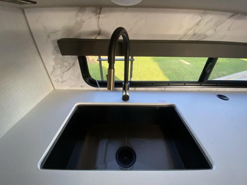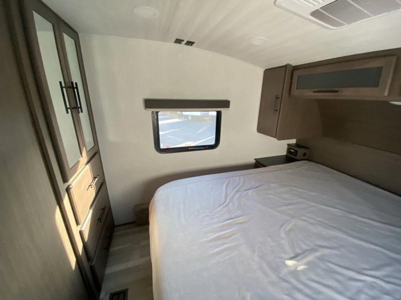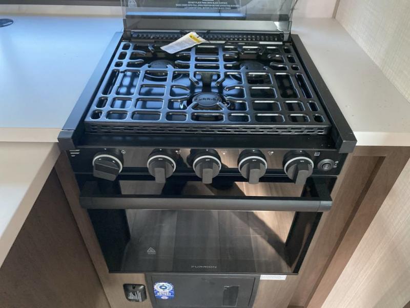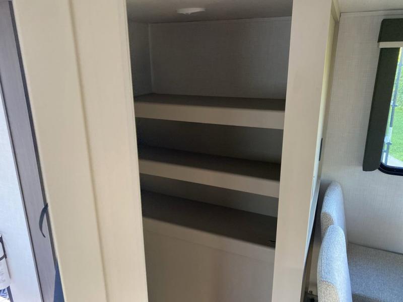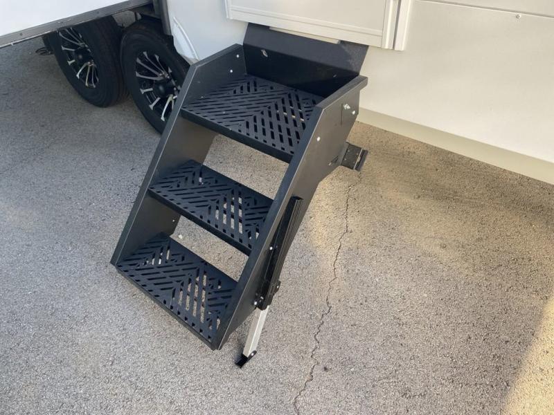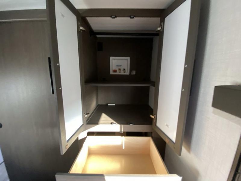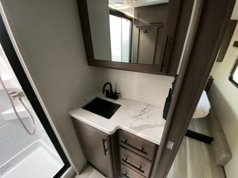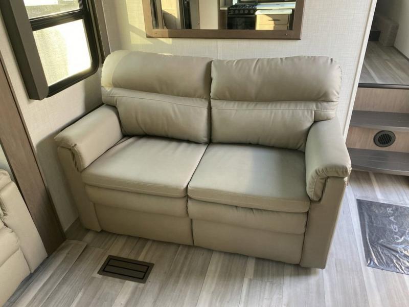 Time spent at the campground in this fifth wheel will be time well spent! Once you arrive, you can unload the unobstructed pass-thru storage, put out the two power awnings, and grab a cold drink from the outdoor mini refrigerator. Head inside to relax on the tri-fold sleeper sofa or theater seating across from the LED HDTV. The rear kitchen includes everything you need to make meals each day, including a pull-out countertop for more space plus a pantry and 12V refrigerator for food storage. The full bath with a 30" x 36" shower will let you freshen up before bed, and speaking of bedtime, the king bed in the front private bedroom is sure to bring a great night's rest. There are also dual wardrobes and nightstands here for your things, plus a third wardrobe with washer and dryer prep if you want to add these appliances.