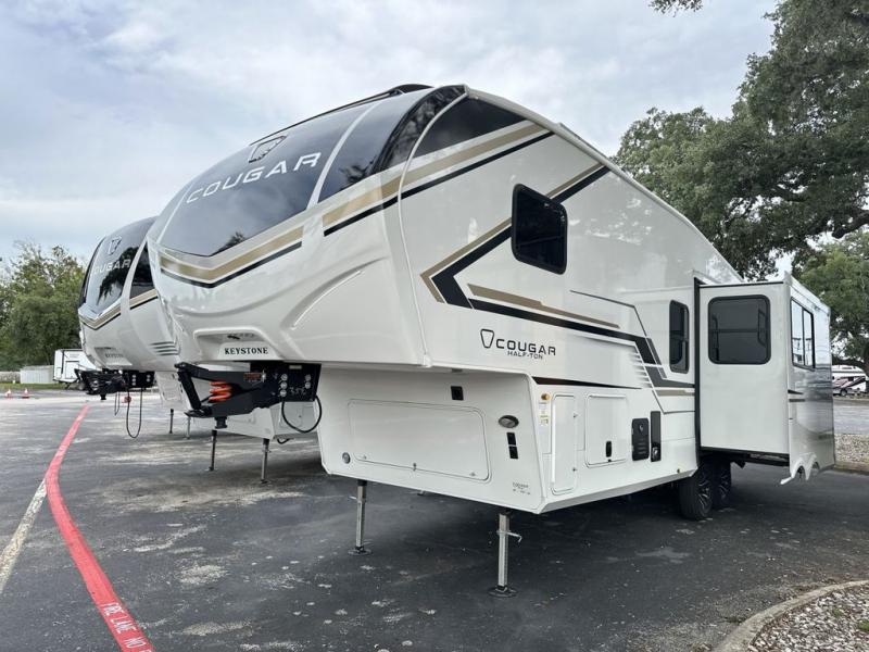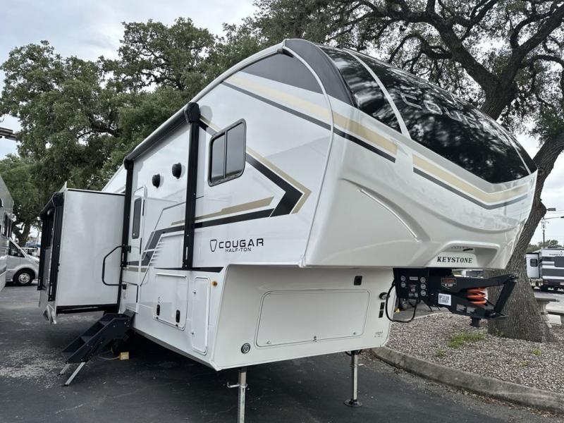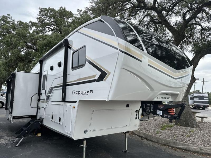 The Keystone Cougar Half-Ton fifth wheel and travel trailers are known as one of America's favorites for a reason! Some of those reasons are the exclusive features that come from Keystone, like the Winegard Air 360+ omni-directional rooftop antenna, the in-floor heating ducts, and the HyperCore composite wall construction with Vixen Fibrogloss high-gloss finish. The Cougar Half-Ton has a Climate Guard protection package with heat-deflecting white sidewalls, two roof attic vents, PEX plumbing and more to enjoy four season camping. Inside, you'll love the dimmable lighting, night roller shades throughout, shower skylight, and bedside USB outlets to keep your electronics charged.
