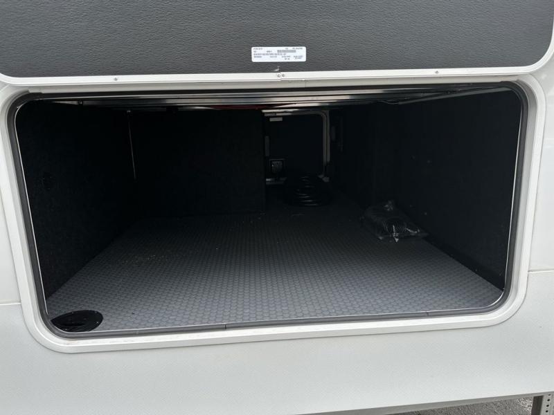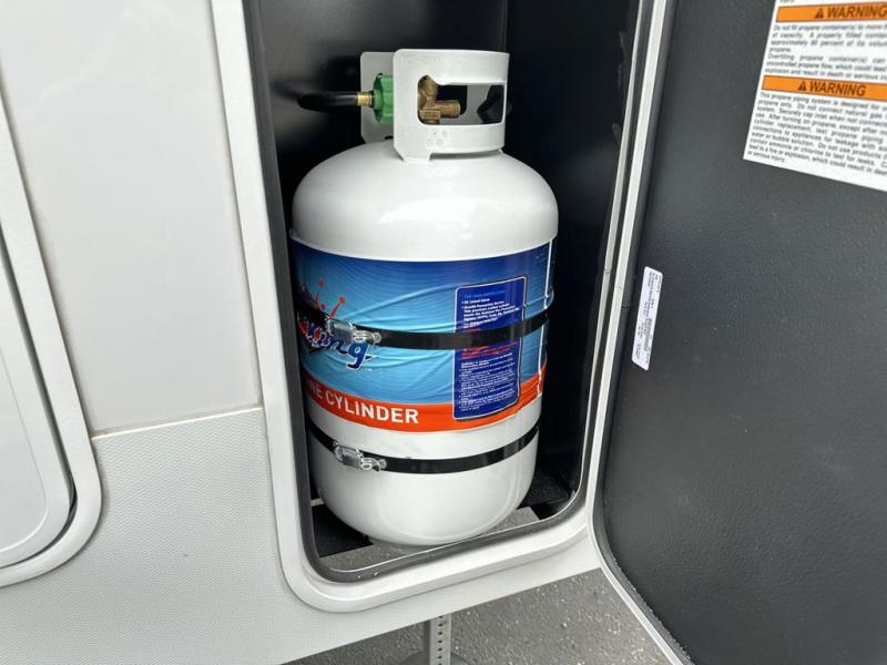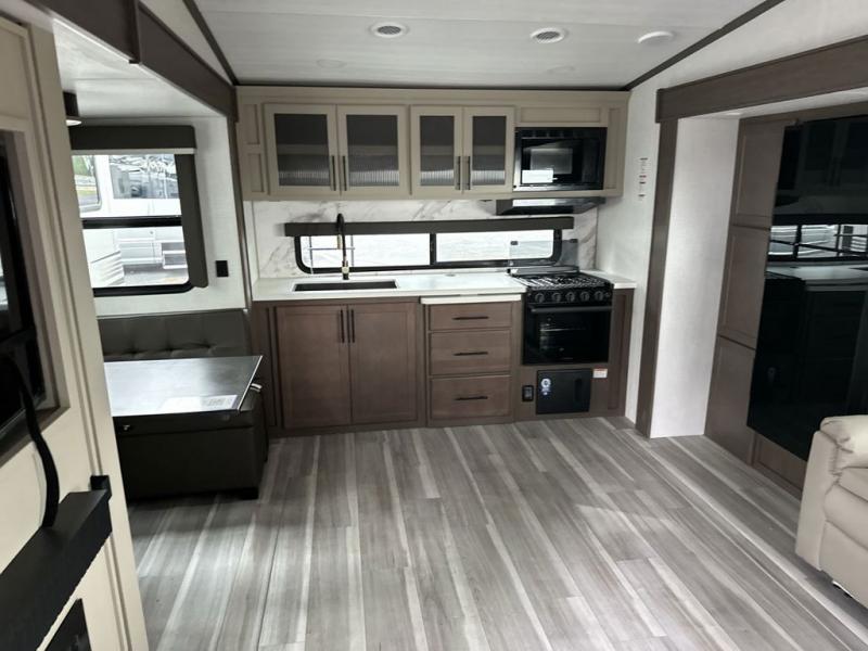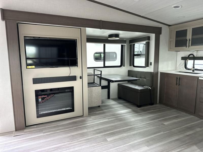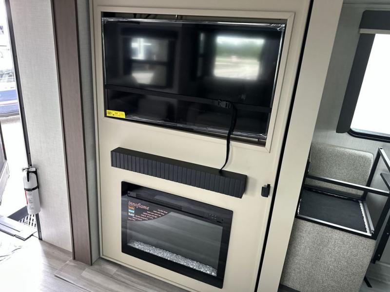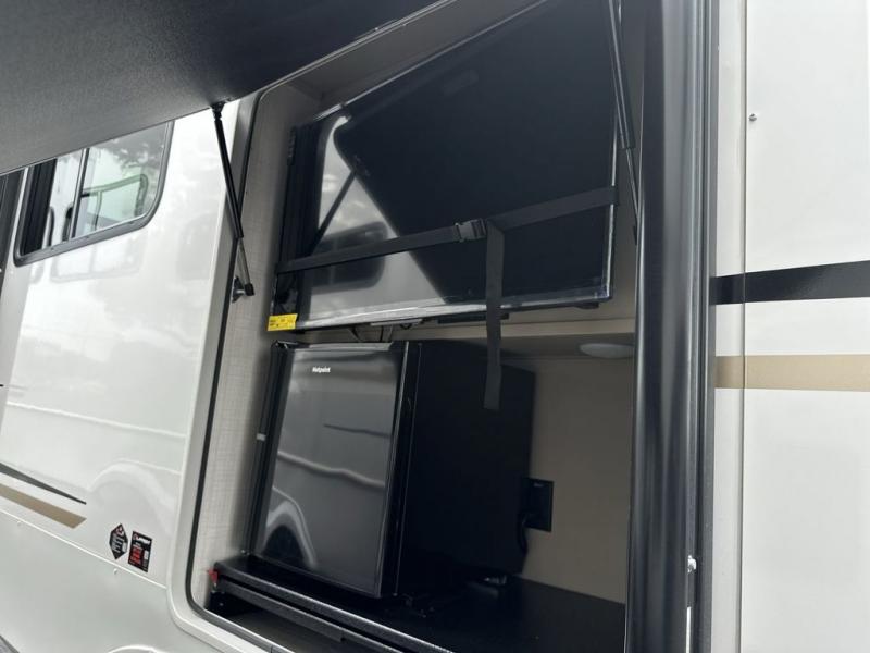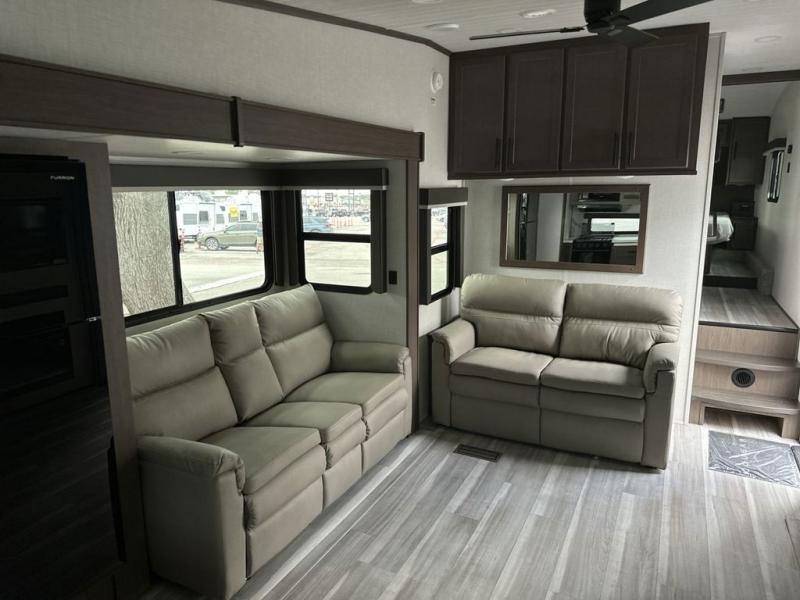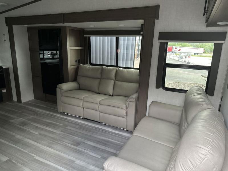 Time spent at the campground in this fifth wheel will be time well spent! Once you arrive, you can unload the unobstructed pass-thru storage, put out the two power awnings, and grab a cold drink from the outdoor mini refrigerator. Head inside to relax on the tri-fold sleeper sofa or theater seating across from the LED HDTV. The rear kitchen includes everything you need to make meals each day, including a pull-out countertop for more space plus a pantry and 12V refrigerator for food storage. The full bath with a 30" x 36" shower will let you freshen up before bed, and speaking of bedtime, the king bed in the front private bedroom is sure to bring a great night's rest. There are also dual wardrobes and nightstands here for your things, plus a third wardrobe with washer and dryer prep if you want to add these appliances.