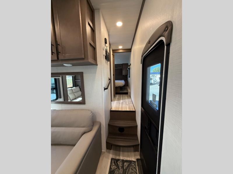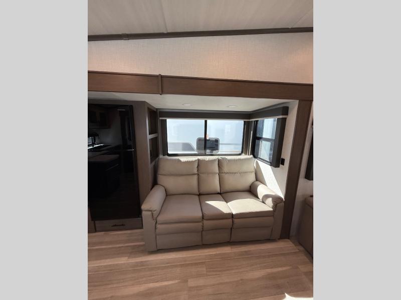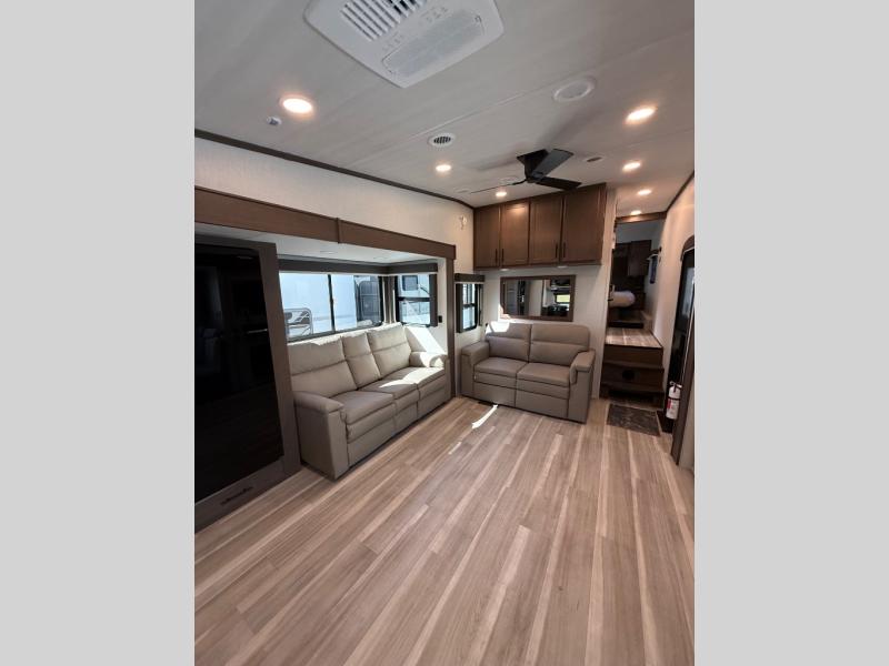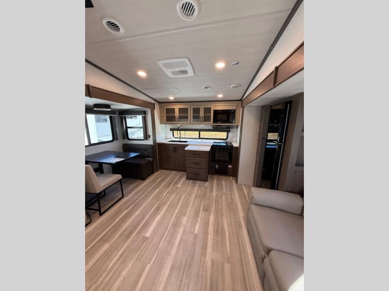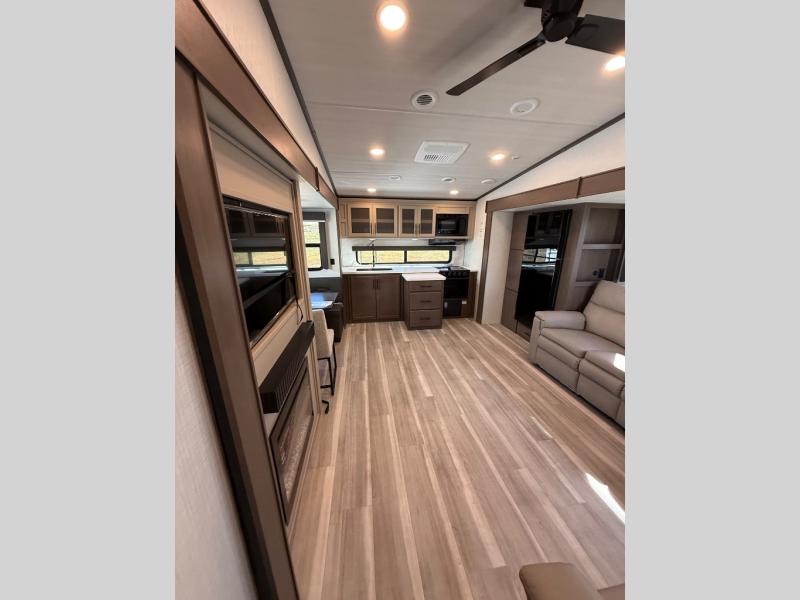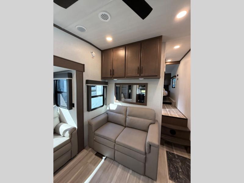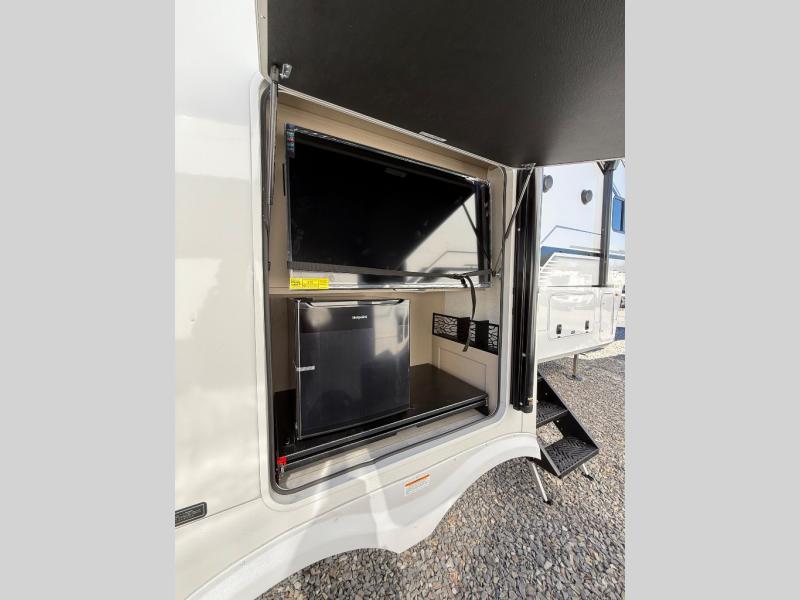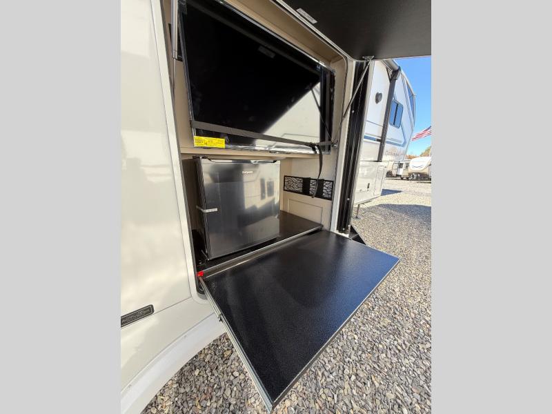 Time spent at the campground in this fifth wheel will be time well spent! Once you arrive, you can unload the unobstructed pass-thru storage, put out the two power awnings, and grab a cold drink from the outdoor mini refrigerator. Head inside to relax on the tri-fold sleeper sofa or theater seating across from the LED HDTV. The rear kitchen includes everything you need to make meals each day, including a pull-out countertop for more space plus a pantry and 12V refrigerator for food storage. The full bath with a 30" x 36" shower will let you freshen up before bed, and speaking of bedtime, the king bed in the front private bedroom is sure to bring a great night's rest. There are also dual wardrobes and nightstands here for your things, plus a third wardrobe with washer and dryer prep if you want to add these appliances.
