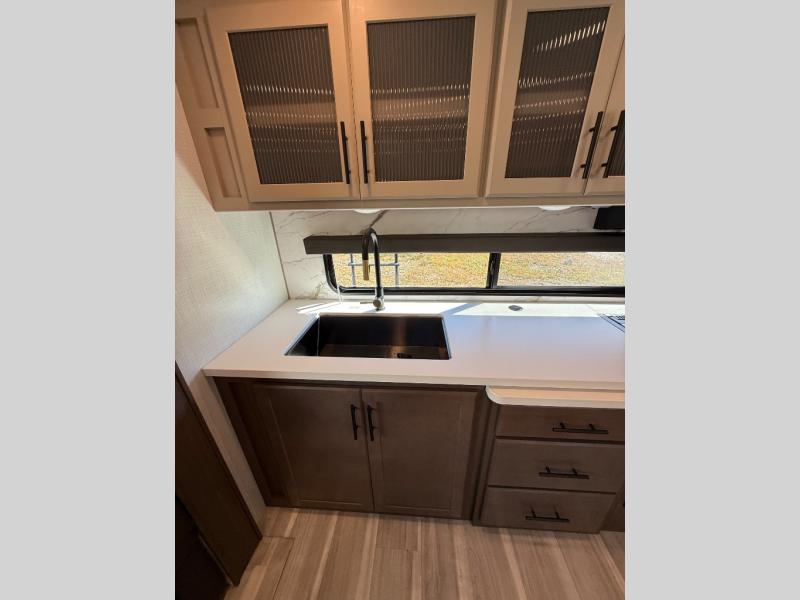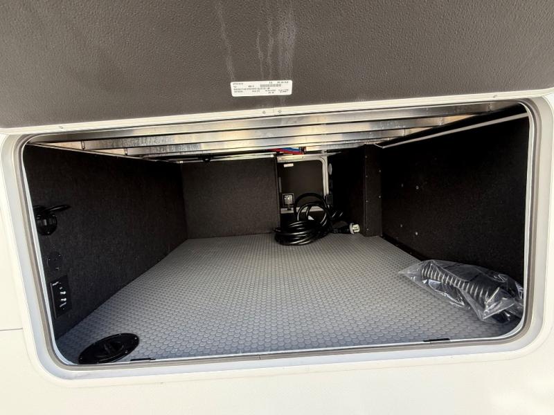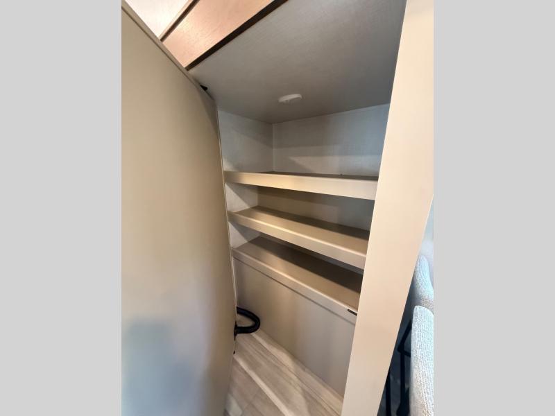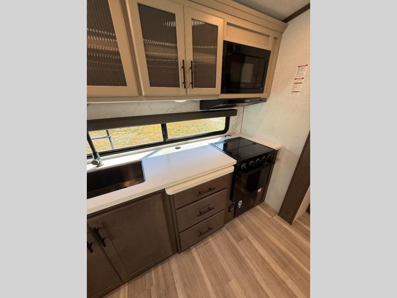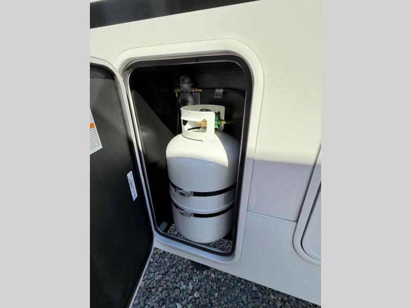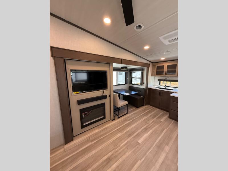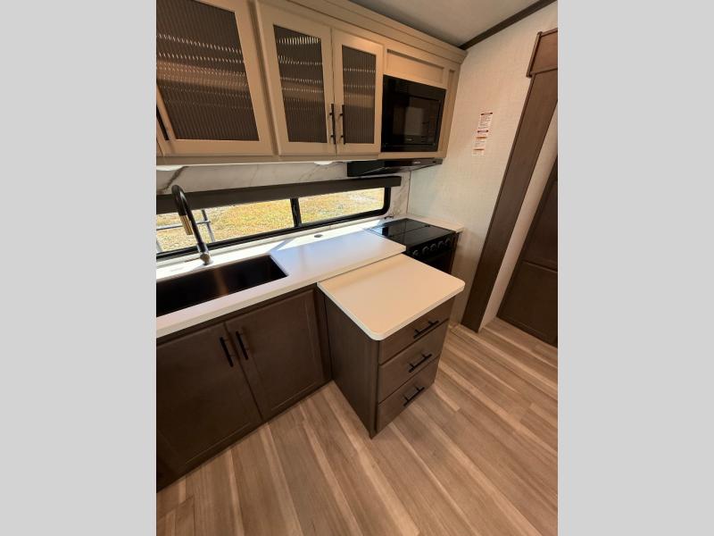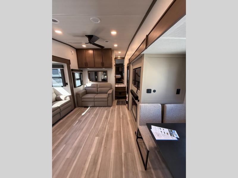 Time spent at the campground in this fifth wheel will be time well spent! Once you arrive, you can unload the unobstructed pass-thru storage, put out the two power awnings, and grab a cold drink from the outdoor mini refrigerator. Head inside to relax on the tri-fold sleeper sofa or theater seating across from the LED HDTV. The rear kitchen includes everything you need to make meals each day, including a pull-out countertop for more space plus a pantry and 12V refrigerator for food storage. The full bath with a 30" x 36" shower will let you freshen up before bed, and speaking of bedtime, the king bed in the front private bedroom is sure to bring a great night's rest. There are also dual wardrobes and nightstands here for your things, plus a third wardrobe with washer and dryer prep if you want to add these appliances.