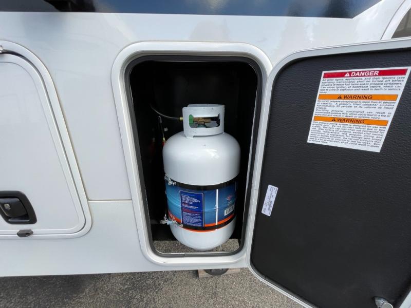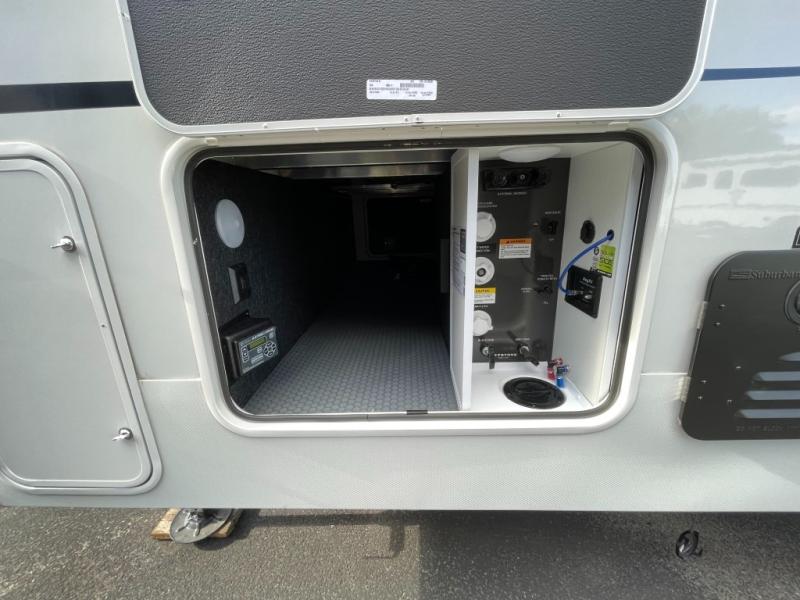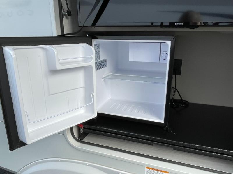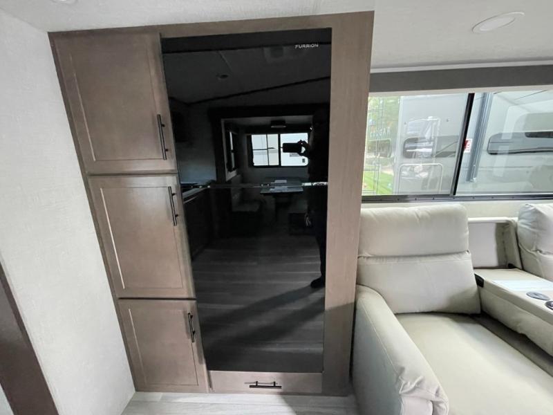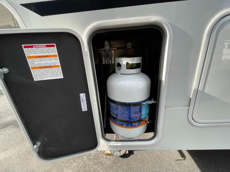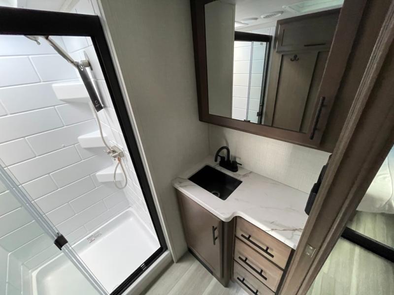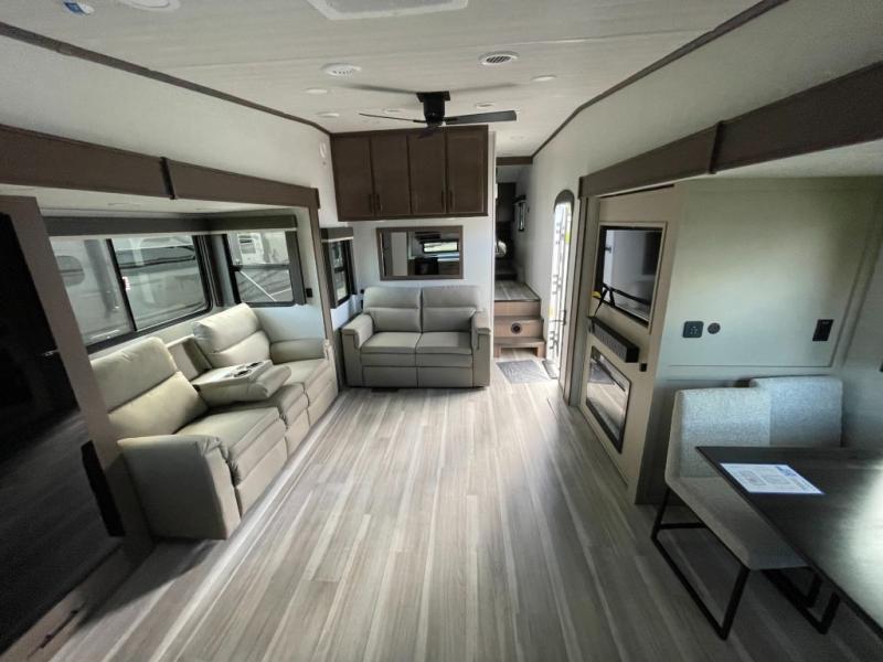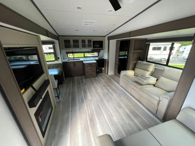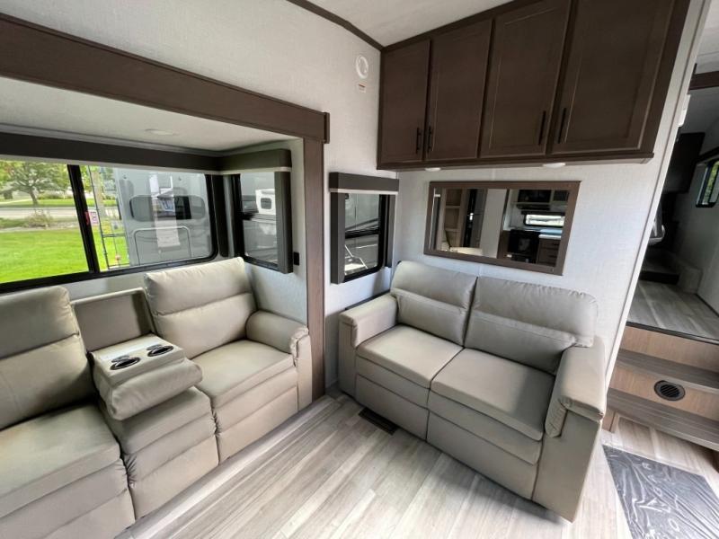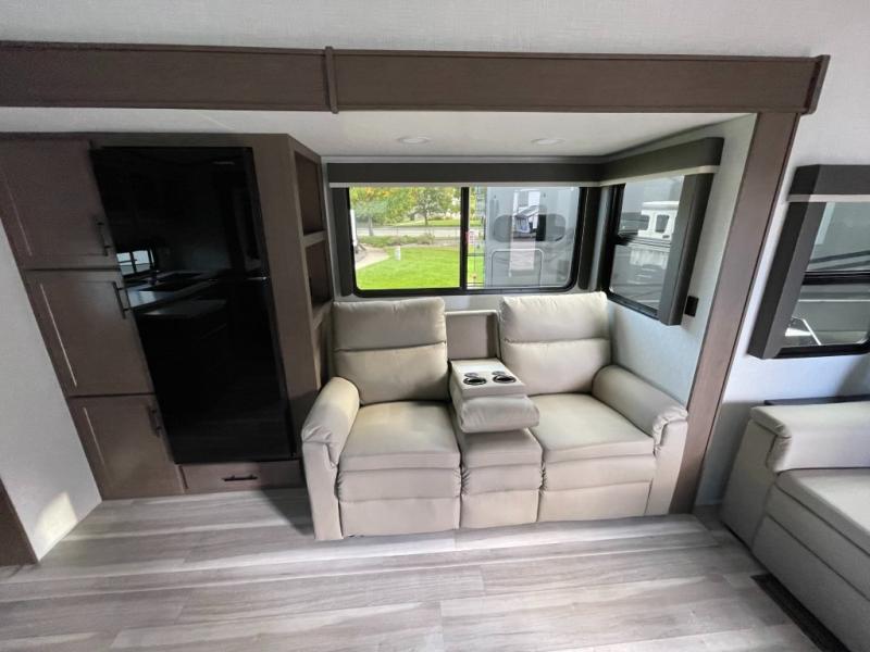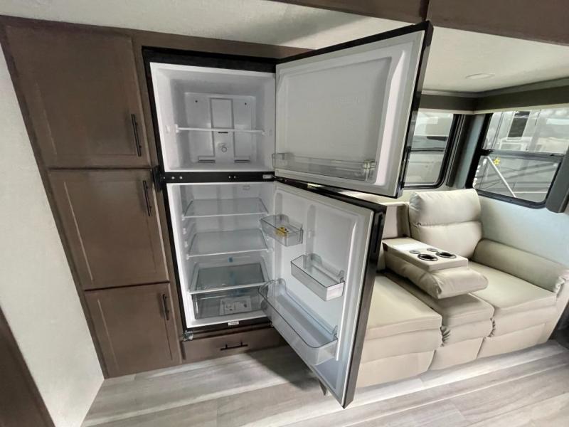 Time spent at the campground in this fifth wheel will be time well spent! Once you arrive, you can unload the unobstructed pass-thru storage, put out the two power awnings, and grab a cold drink from the outdoor mini refrigerator. Head inside to relax on the tri-fold sleeper sofa or theater seating across from the LED HDTV. The rear kitchen includes everything you need to make meals each day, including a pull-out countertop for more space plus a pantry and 12V refrigerator for food storage. The full bath with a 30" x 36" shower will let you freshen up before bed, and speaking of bedtime, the king bed in the front private bedroom is sure to bring a great night's rest. There are also dual wardrobes and nightstands here for your things, plus a third wardrobe with washer and dryer prep if you want to add these appliances.