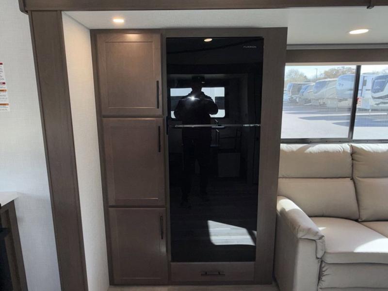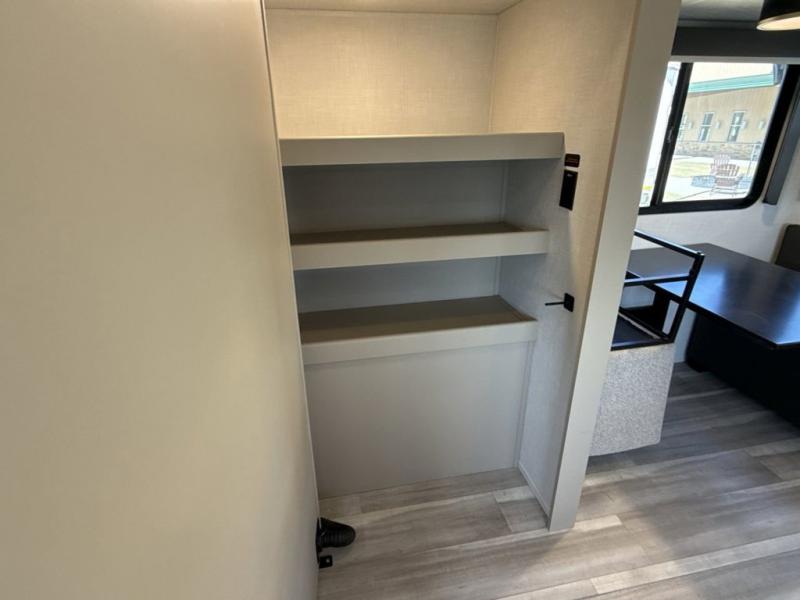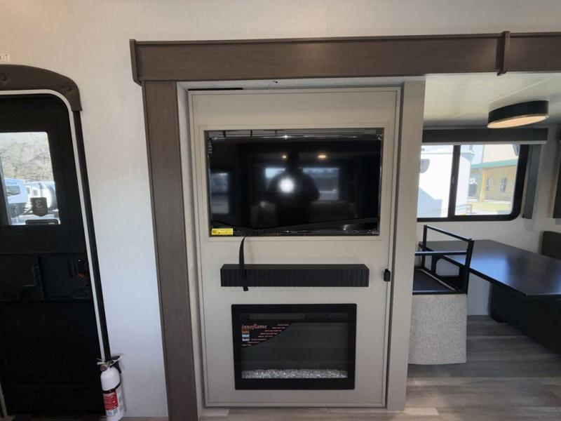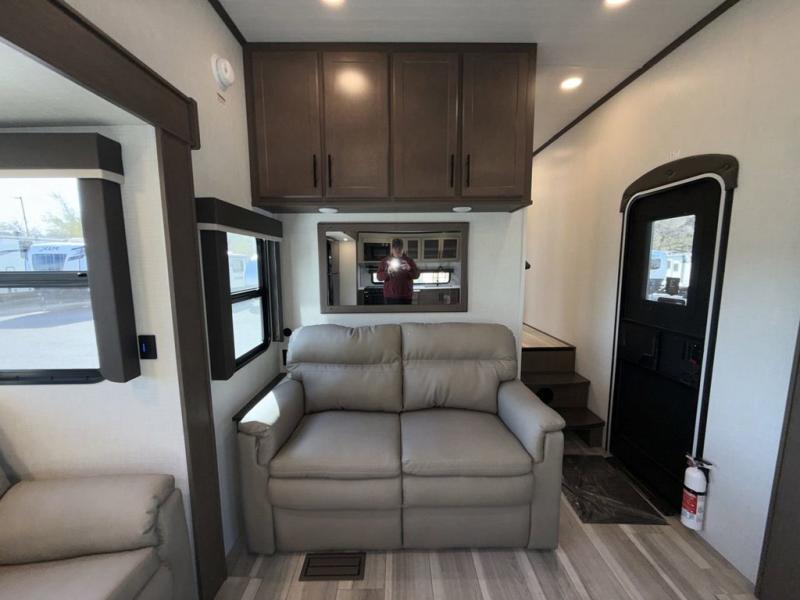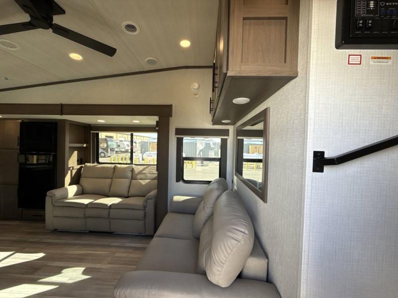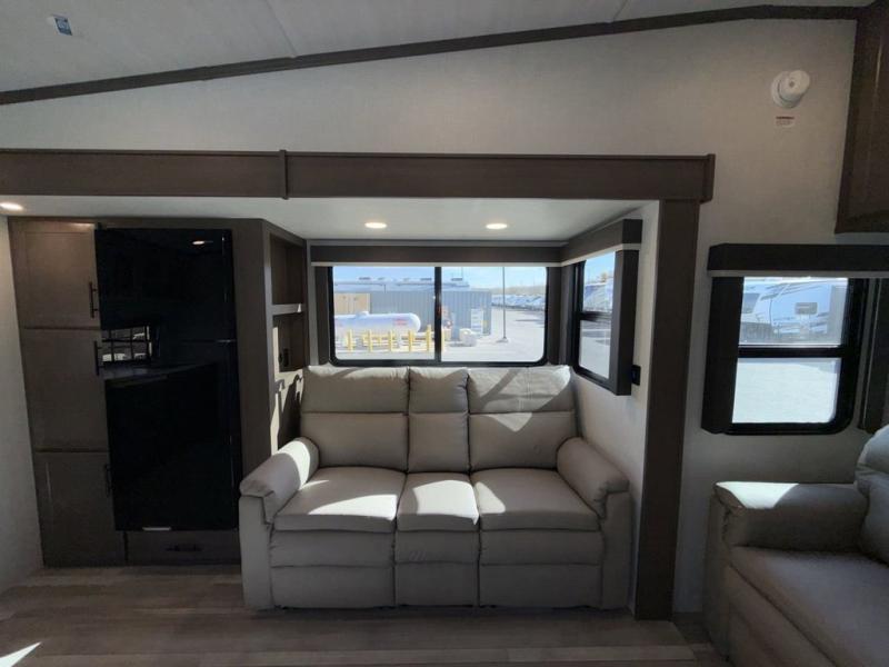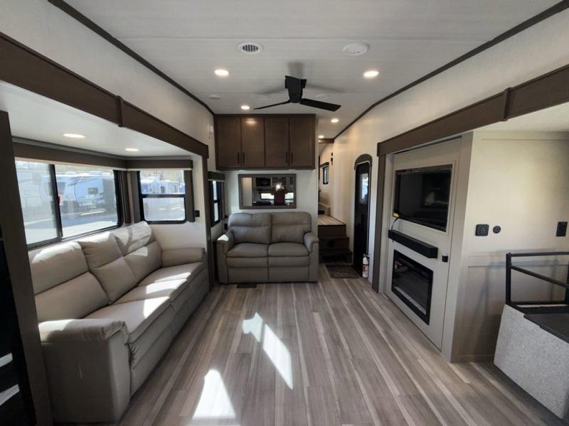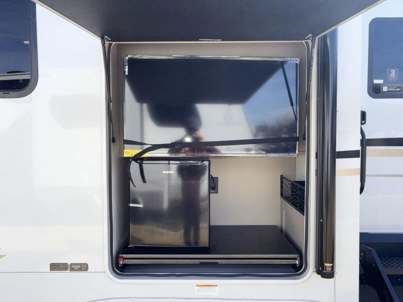 Time spent at the campground in this fifth wheel will be time well spent! Once you arrive, you can unload the unobstructed pass-thru storage, put out the two power awnings, and grab a cold drink from the outdoor mini refrigerator. Head inside to relax on the tri-fold sleeper sofa or theater seating across from the LED HDTV. The rear kitchen includes everything you need to make meals each day, including a pull-out countertop for more space plus a pantry and 12V refrigerator for food storage. The full bath with a 30" x 36" shower will let you freshen up before bed, and speaking of bedtime, the king bed in the front private bedroom is sure to bring a great night's rest. There are also dual wardrobes and nightstands here for your things, plus a third wardrobe with washer and dryer prep if you want to add these appliances.