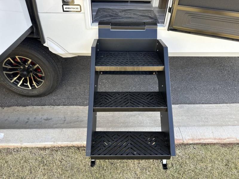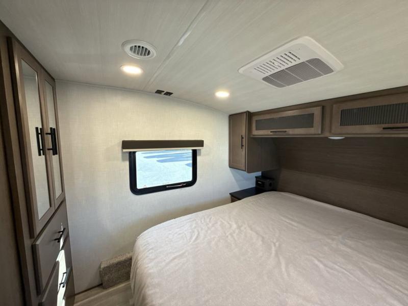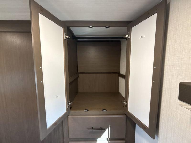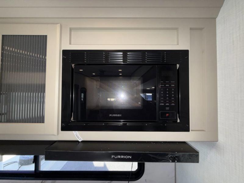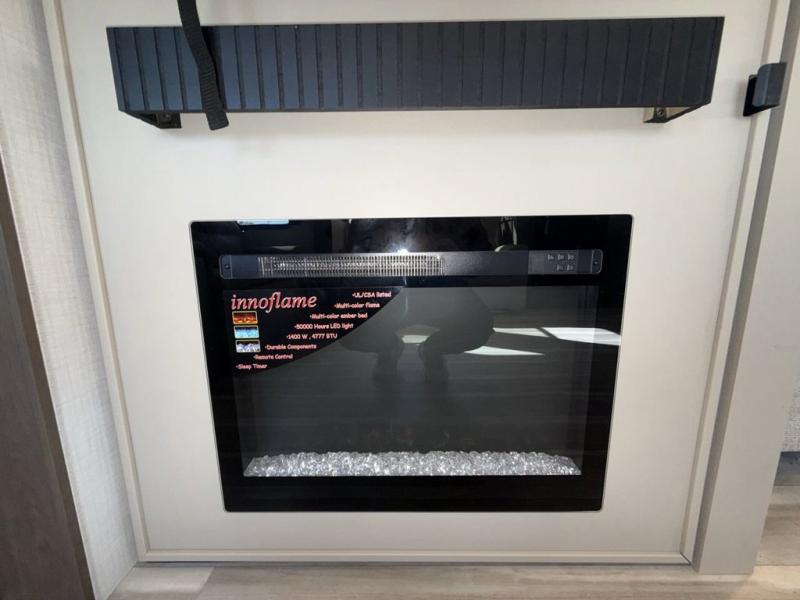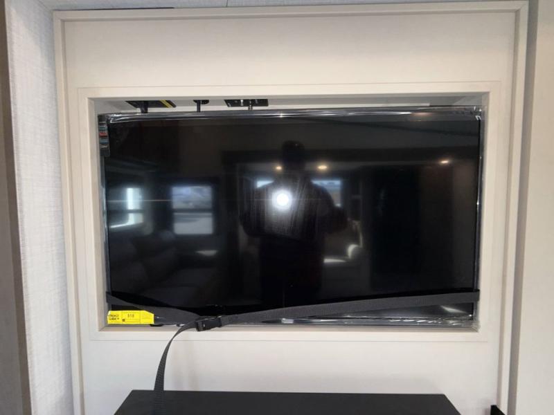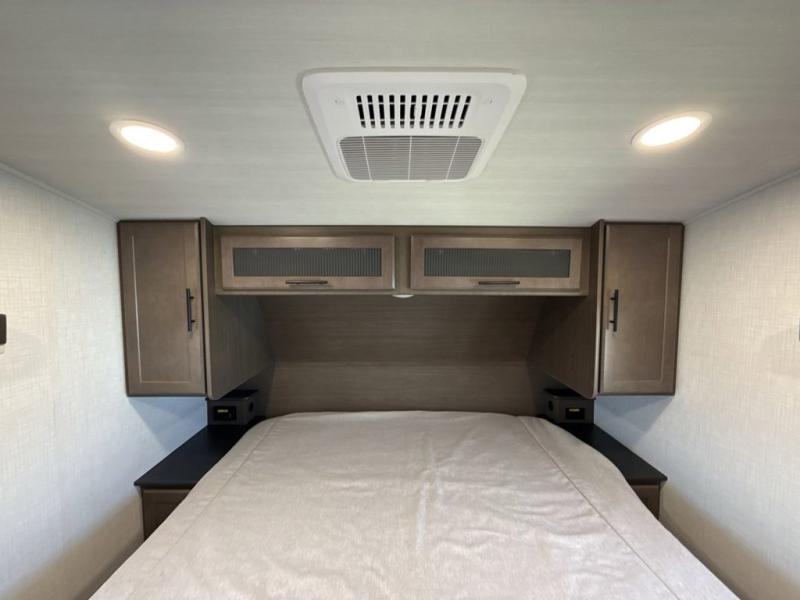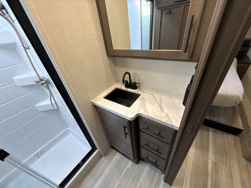Time spent at the campground in this fifth wheel will be time well spent! Once you arrive, you can unload the unobstructed pass-thru storage, put out the two power awnings, and grab a cold drink from the outdoor mini refrigerator. Head inside to relax on the tri-fold sleeper sofa or theater seating across from the LED HDTV. The rear kitchen includes everything you need to make meals each day, including a pull-out countertop for more space plus a pantry and 12V refrigerator for food storage. The full bath with a 30" x 36" shower will let you freshen up before bed, and speaking of bedtime, the king bed in the front private bedroom is sure to bring a great night's rest. There are also dual wardrobes and nightstands here for your things, plus a third wardrobe with washer and dryer prep if you want to add these appliances.