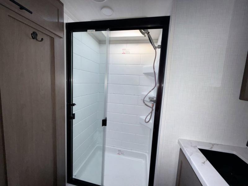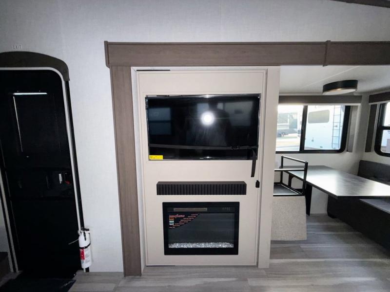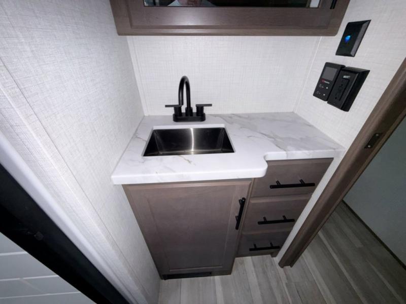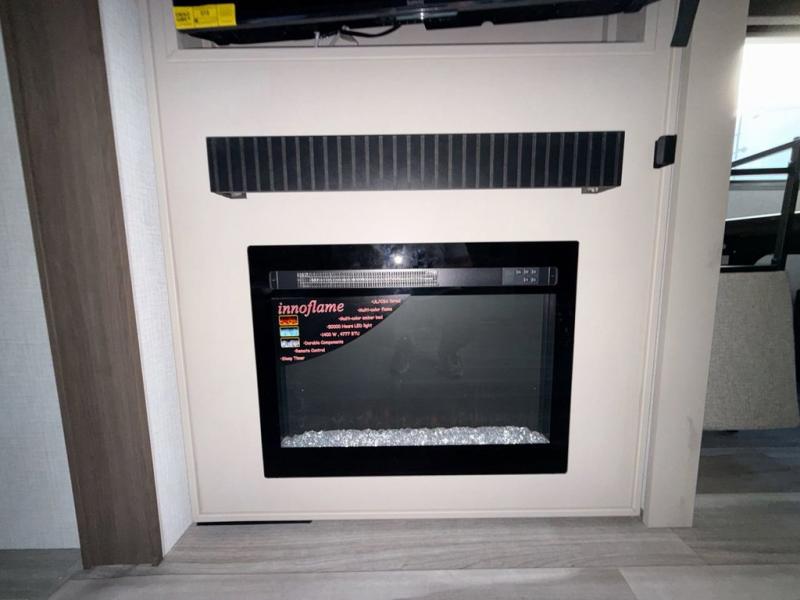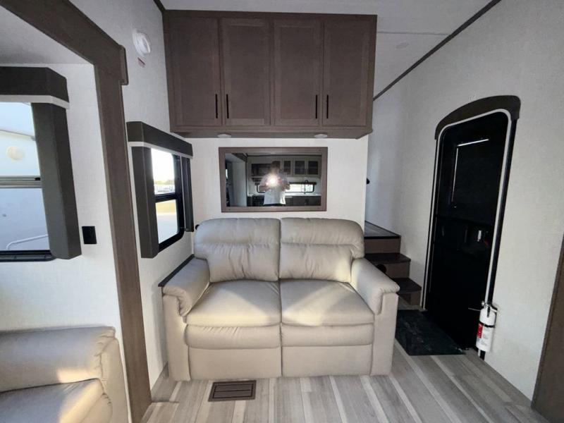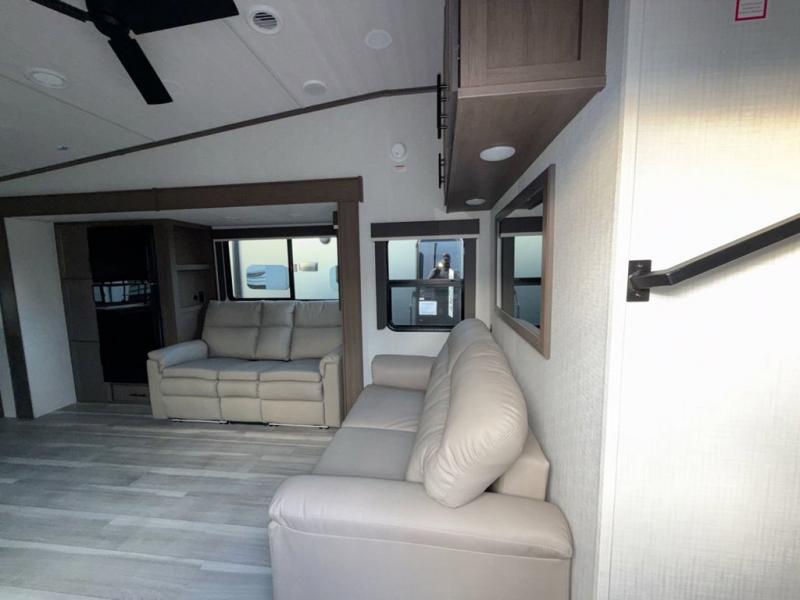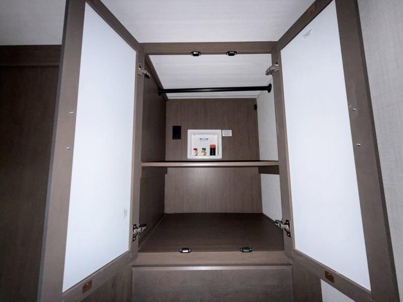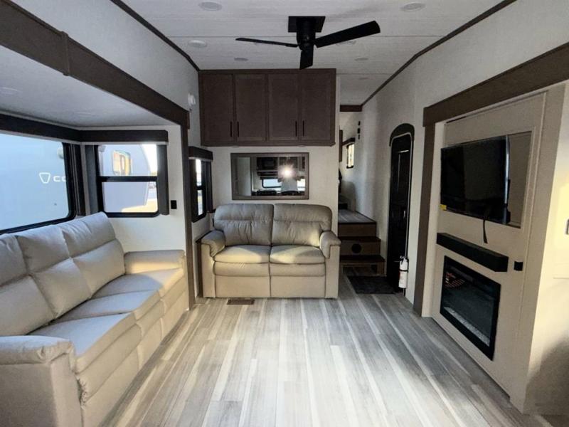 Time spent at the campground in this fifth wheel will be time well spent! Once you arrive, you can unload the unobstructed pass-thru storage, put out the two power awnings, and grab a cold drink from the outdoor mini refrigerator. Head inside to relax on the tri-fold sleeper sofa or theater seating across from the LED HDTV. The rear kitchen includes everything you need to make meals each day, including a pull-out countertop for more space plus a pantry and 12V refrigerator for food storage. The full bath with a 30" x 36" shower will let you freshen up before bed, and speaking of bedtime, the king bed in the front private bedroom is sure to bring a great night's rest. There are also dual wardrobes and nightstands here for your things, plus a third wardrobe with washer and dryer prep if you want to add these appliances.