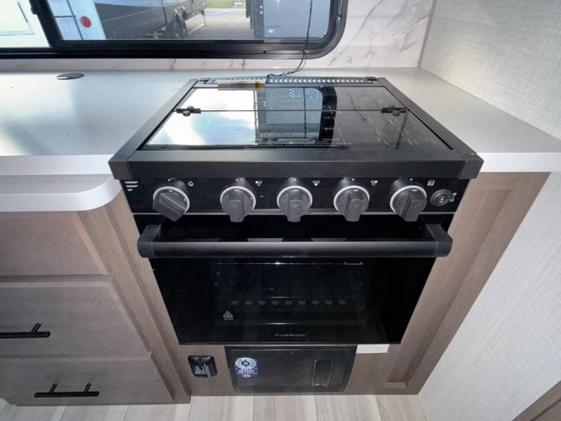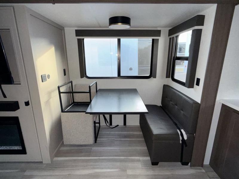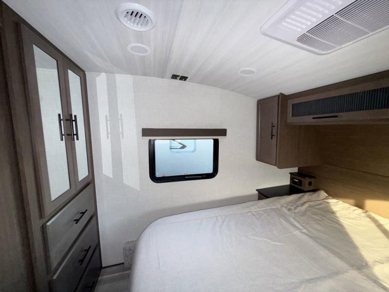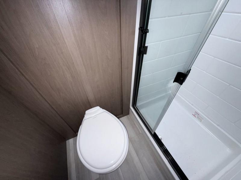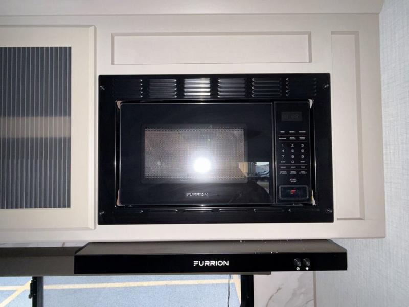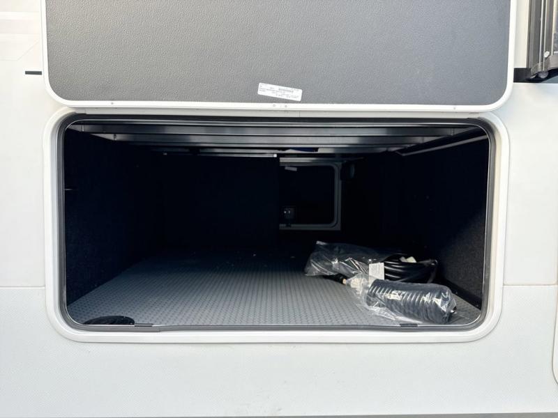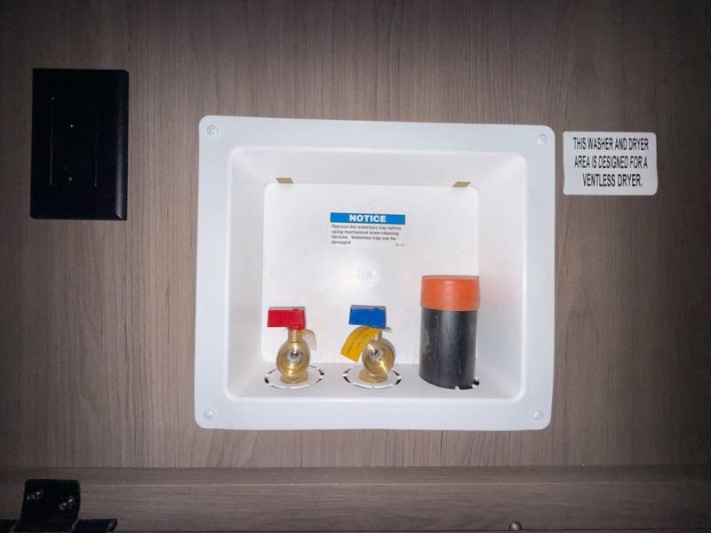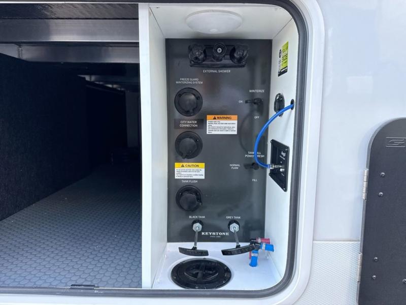 Time spent at the campground in this fifth wheel will be time well spent! Once you arrive, you can unload the unobstructed pass-thru storage, put out the two power awnings, and grab a cold drink from the outdoor mini refrigerator. Head inside to relax on the tri-fold sleeper sofa or theater seating across from the LED HDTV. The rear kitchen includes everything you need to make meals each day, including a pull-out countertop for more space plus a pantry and 12V refrigerator for food storage. The full bath with a 30" x 36" shower will let you freshen up before bed, and speaking of bedtime, the king bed in the front private bedroom is sure to bring a great night's rest. There are also dual wardrobes and nightstands here for your things, plus a third wardrobe with washer and dryer prep if you want to add these appliances.