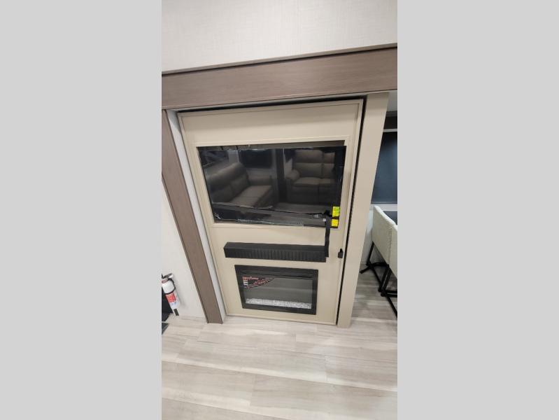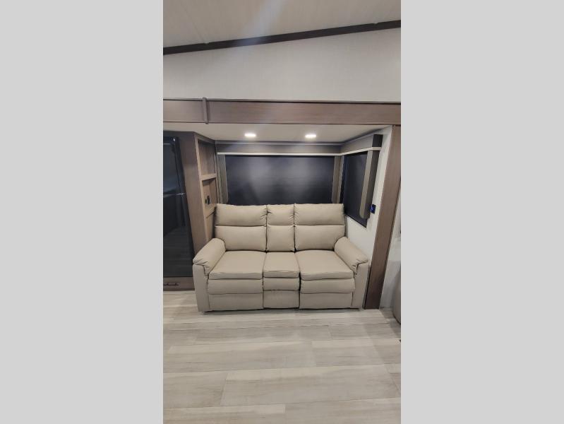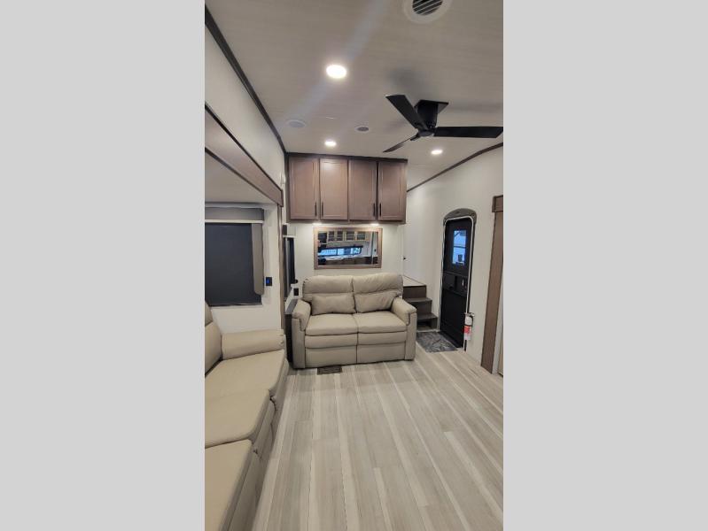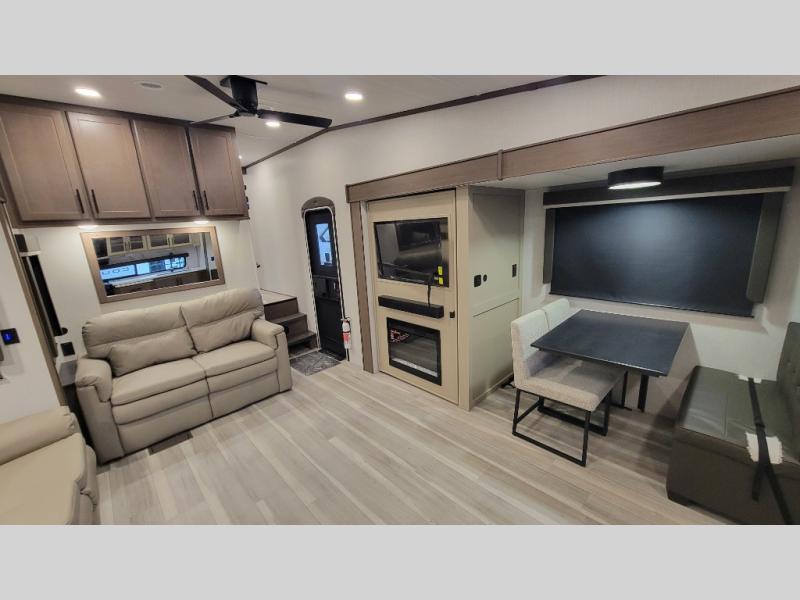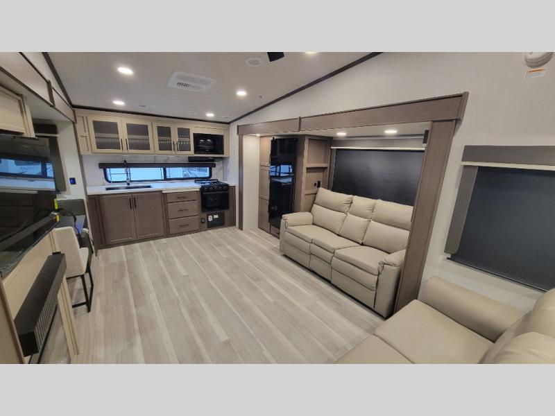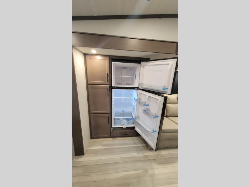 Time spent at the campground in this fifth wheel will be time well spent! Once you arrive, you can unload the unobstructed pass-thru storage, put out the two power awnings, and grab a cold drink from the outdoor mini refrigerator. Head inside to relax on the tri-fold sleeper sofa or theater seating across from the LED HDTV. The rear kitchen includes everything you need to make meals each day, including a pull-out countertop for more space plus a pantry and 12V refrigerator for food storage. The full bath with a 30" x 36" shower will let you freshen up before bed, and speaking of bedtime, the king bed in the front private bedroom is sure to bring a great night's rest. There are also dual wardrobes and nightstands here for your things, plus a third wardrobe with washer and dryer prep if you want to add these appliances.
