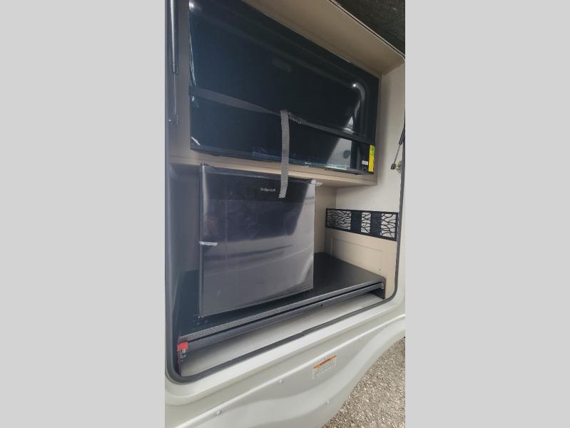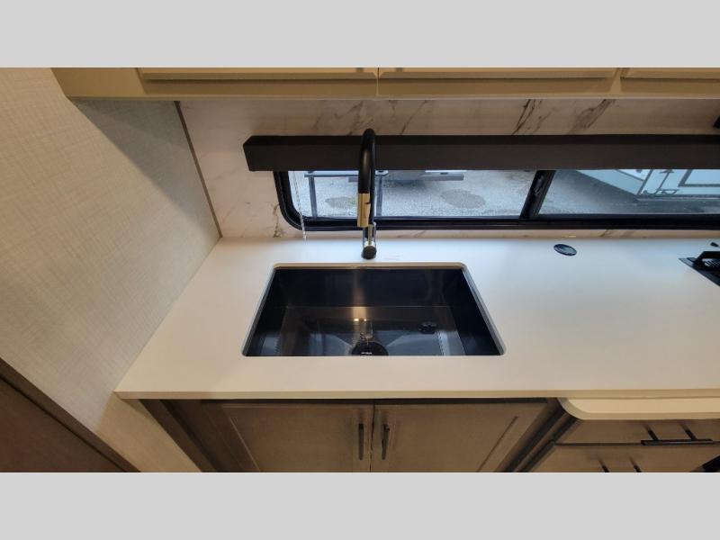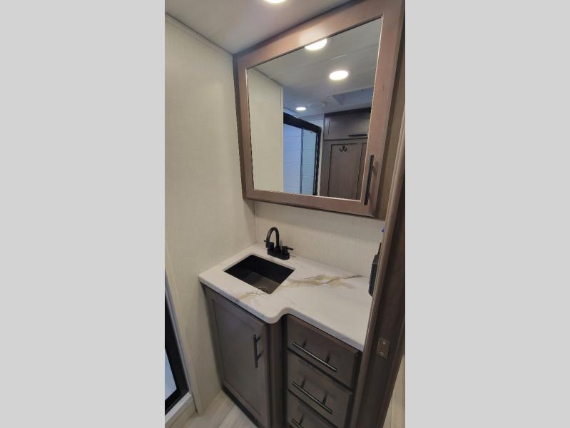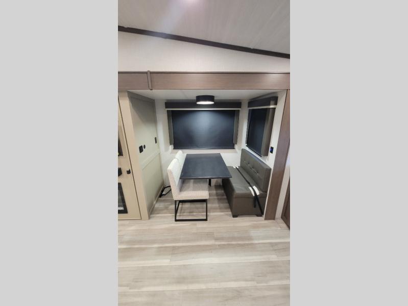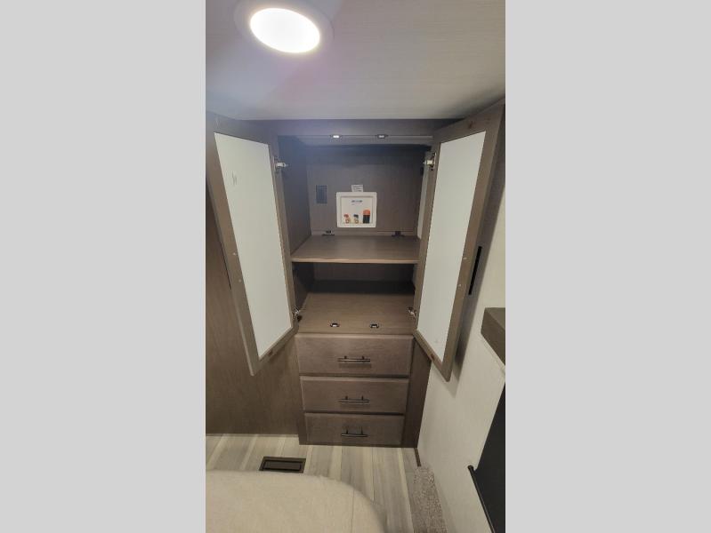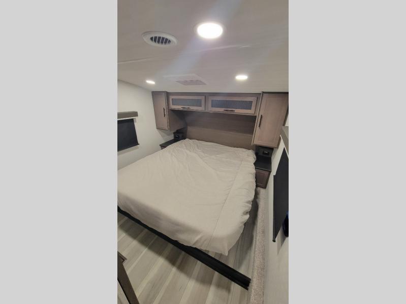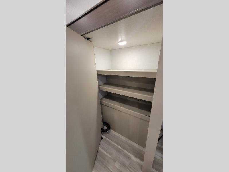 Time spent at the campground in this fifth wheel will be time well spent! Once you arrive, you can unload the unobstructed pass-thru storage, put out the two power awnings, and grab a cold drink from the outdoor mini refrigerator. Head inside to relax on the tri-fold sleeper sofa or theater seating across from the LED HDTV. The rear kitchen includes everything you need to make meals each day, including a pull-out countertop for more space plus a pantry and 12V refrigerator for food storage. The full bath with a 30" x 36" shower will let you freshen up before bed, and speaking of bedtime, the king bed in the front private bedroom is sure to bring a great night's rest. There are also dual wardrobes and nightstands here for your things, plus a third wardrobe with washer and dryer prep if you want to add these appliances.