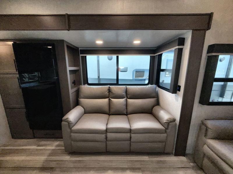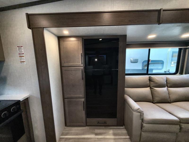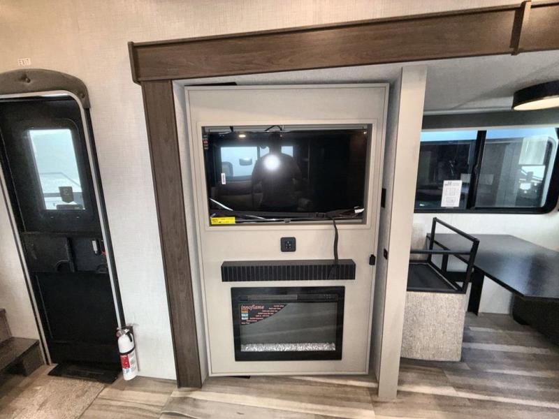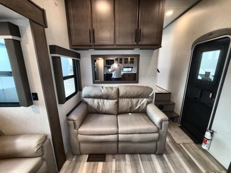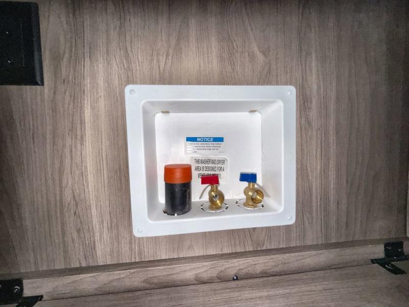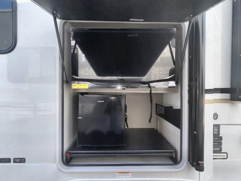 Time spent at the campground in this fifth wheel will be time well spent! Once you arrive, you can unload the unobstructed pass-thru storage, put out the two power awnings, and grab a cold drink from the outdoor mini refrigerator. Head inside to relax on the tri-fold sleeper sofa or theater seating across from the LED HDTV. The rear kitchen includes everything you need to make meals each day, including a pull-out countertop for more space plus a pantry and 12V refrigerator for food storage. The full bath with a 30" x 36" shower will let you freshen up before bed, and speaking of bedtime, the king bed in the front private bedroom is sure to bring a great night's rest. There are also dual wardrobes and nightstands here for your things, plus a third wardrobe with washer and dryer prep if you want to add these appliances.