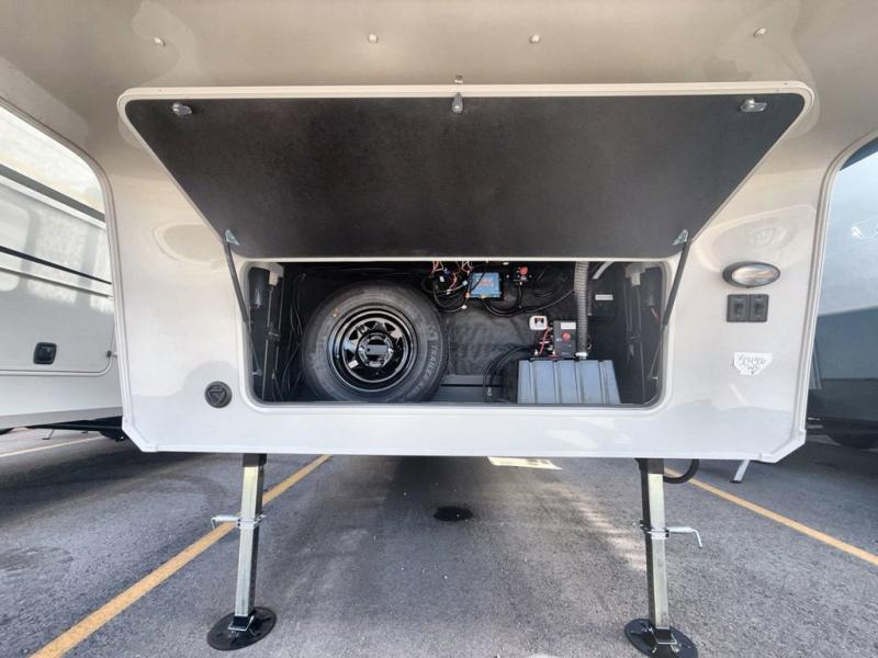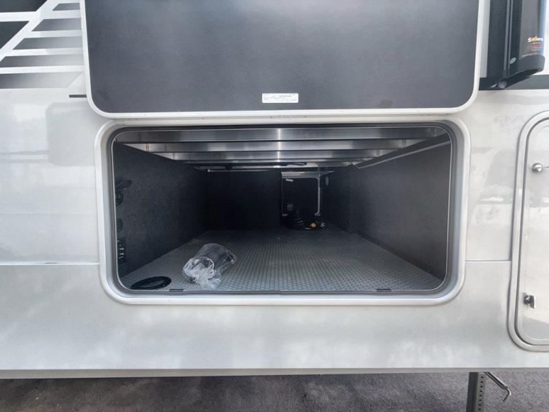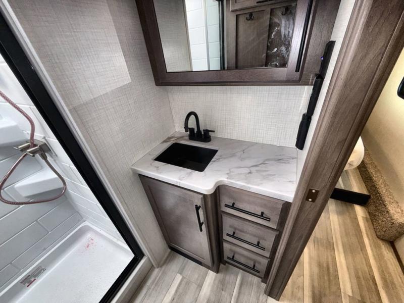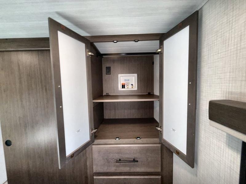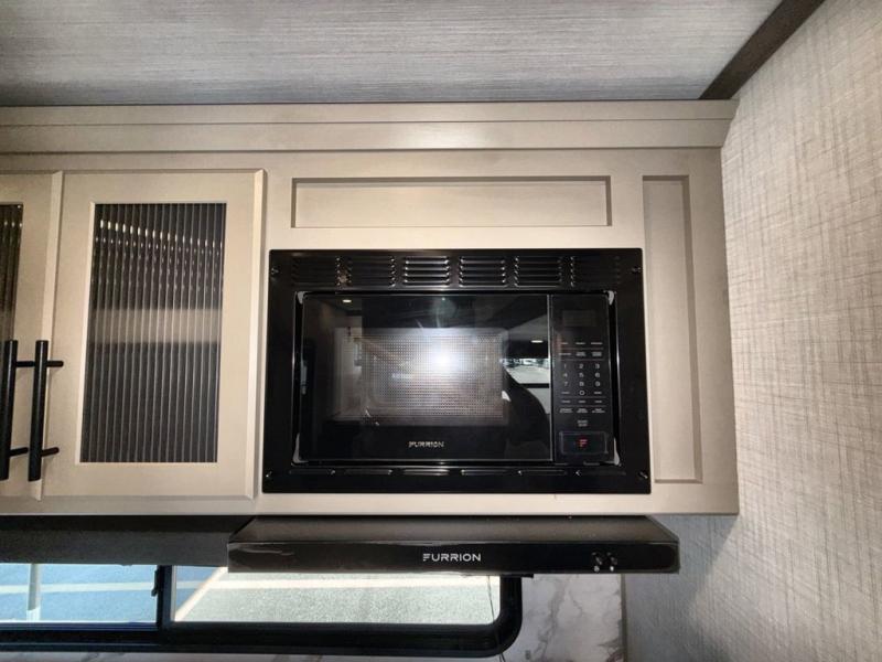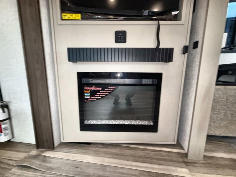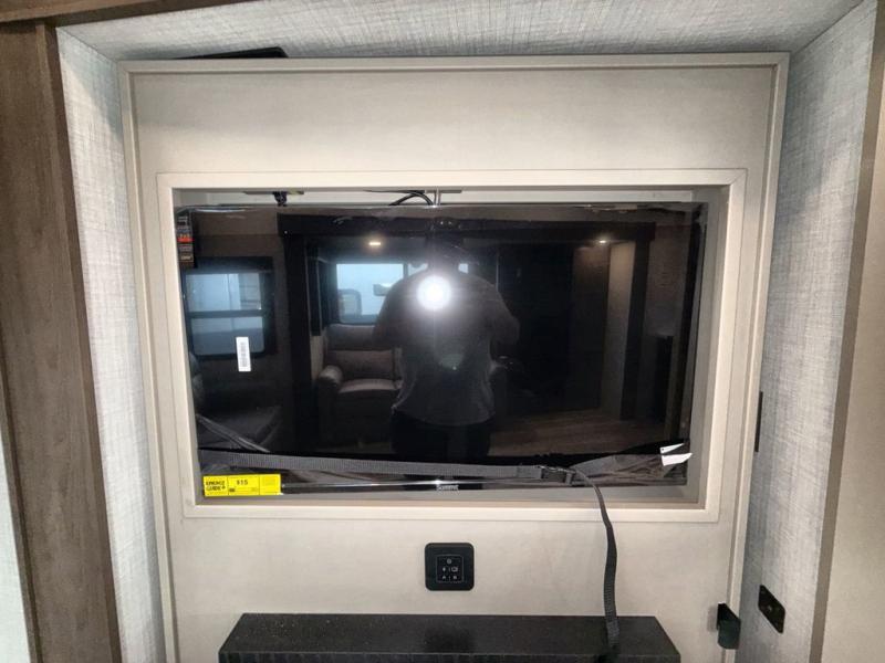 Time spent at the campground in this fifth wheel will be time well spent! Once you arrive, you can unload the unobstructed pass-thru storage, put out the two power awnings, and grab a cold drink from the outdoor mini refrigerator. Head inside to relax on the tri-fold sleeper sofa or theater seating across from the LED HDTV. The rear kitchen includes everything you need to make meals each day, including a pull-out countertop for more space plus a pantry and 12V refrigerator for food storage. The full bath with a 30" x 36" shower will let you freshen up before bed, and speaking of bedtime, the king bed in the front private bedroom is sure to bring a great night's rest. There are also dual wardrobes and nightstands here for your things, plus a third wardrobe with washer and dryer prep if you want to add these appliances.