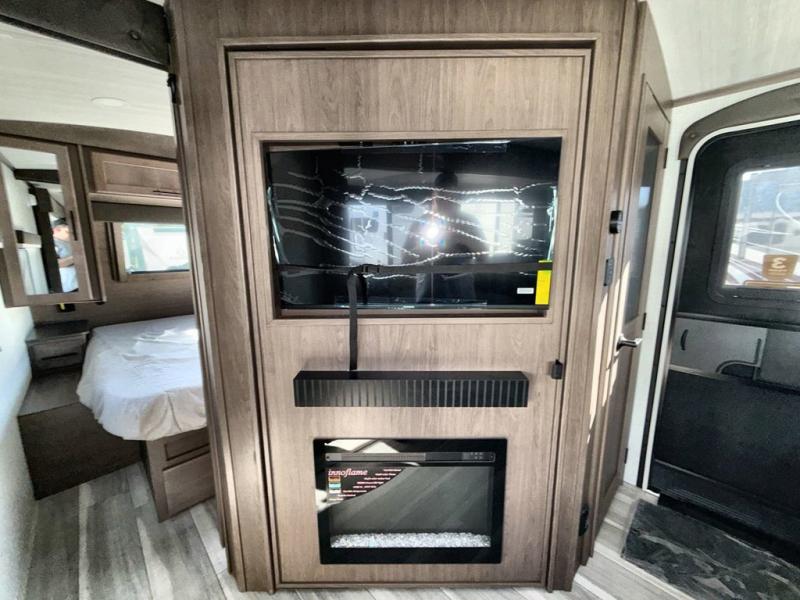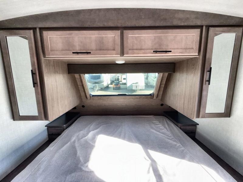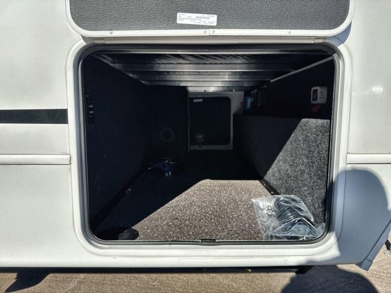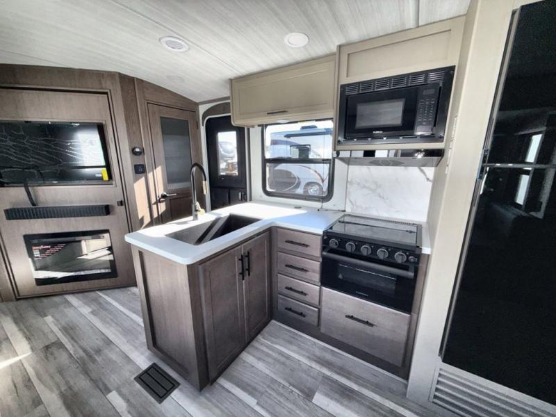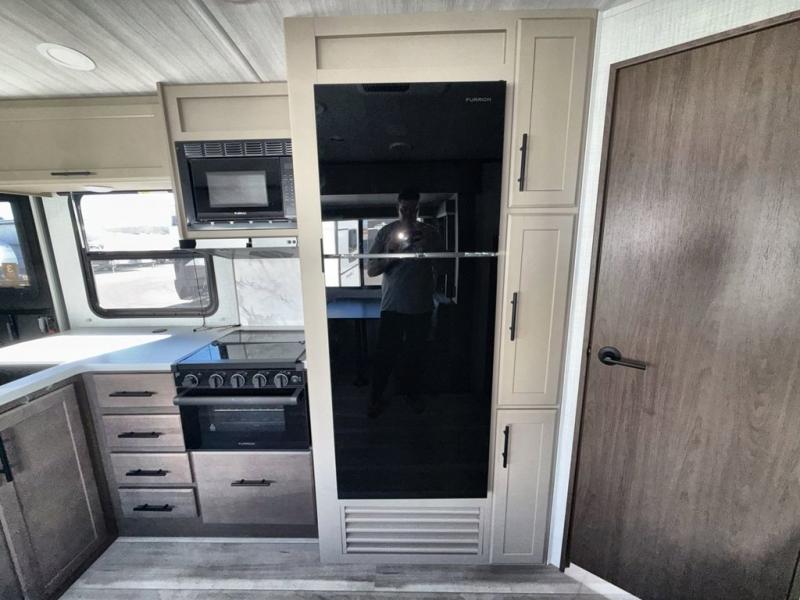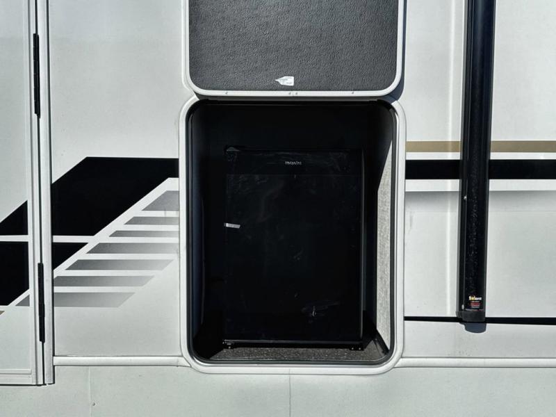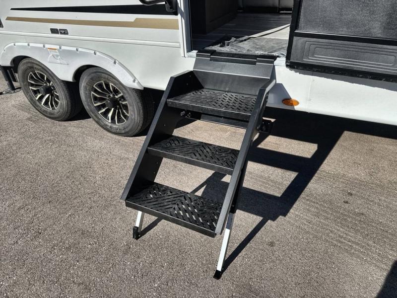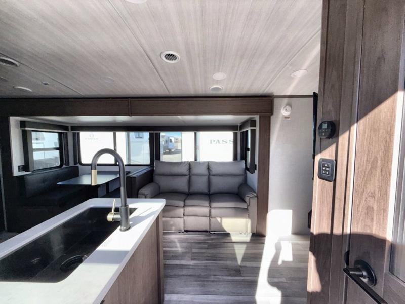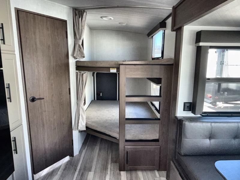With dual entry doors in this travel trailer, you can enter in through the main living area or the full bath for convenience! Once inside, the sleeper sofa and booth dinette provide places to relax, eat, and play games, plus there is an entertainment center with hidden storage behind to keep movies organized. A full kitchen with a three burner cooktop and 12V refrigerator will allow you to cook and store food, or you can head outdoors to use the outdoor kitchen prep area. There is also drop-frame storage outside for fishing poles and hiking gear, and the 21' electric awning provides shade as you relax. When it's time to call it a night, the king bed in the front private bedroom is sure to bring comfort, while the little ones take the double-size bunks, and any other guests can sleep on the living room furniture!