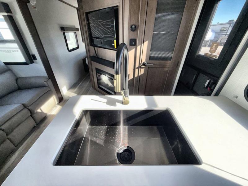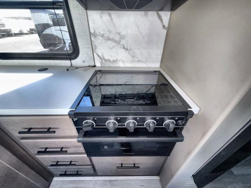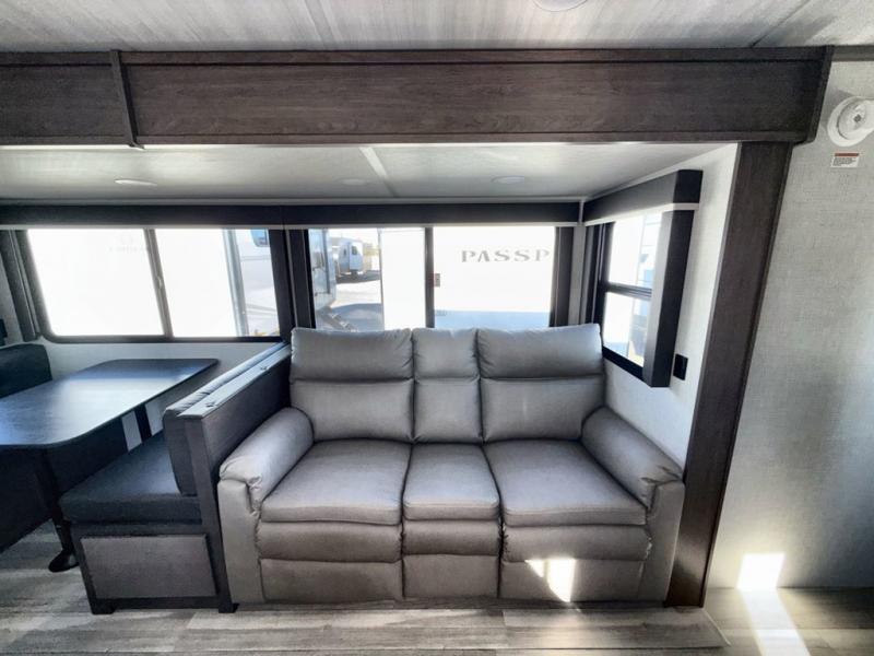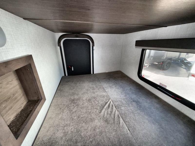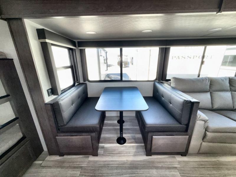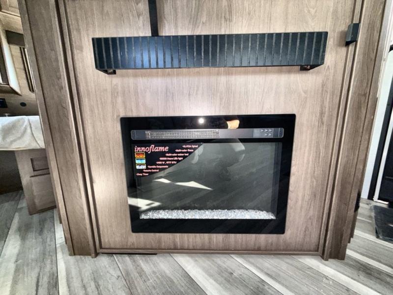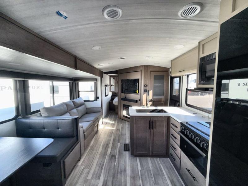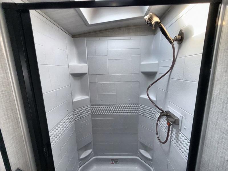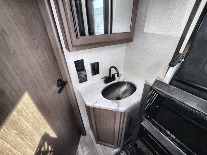 With dual entry doors in this travel trailer, you can enter in through the main living area or the full bath for convenience! Once inside, the sleeper sofa and booth dinette provide places to relax, eat, and play games, plus there is an entertainment center with hidden storage behind to keep movies organized. A full kitchen with a three burner cooktop and 12V refrigerator will allow you to cook and store food, or you can head outdoors to use the outdoor kitchen prep area. There is also drop-frame storage outside for fishing poles and hiking gear, and the 21' electric awning provides shade as you relax. When it's time to call it a night, the king bed in the front private bedroom is sure to bring comfort, while the little ones take the double-size bunks, and any other guests can sleep on the living room furniture!