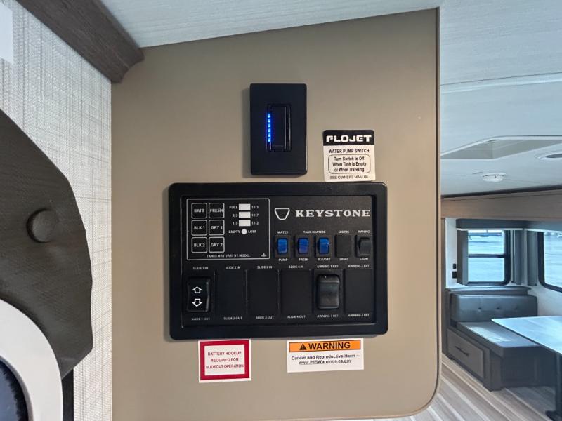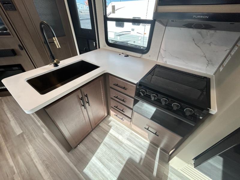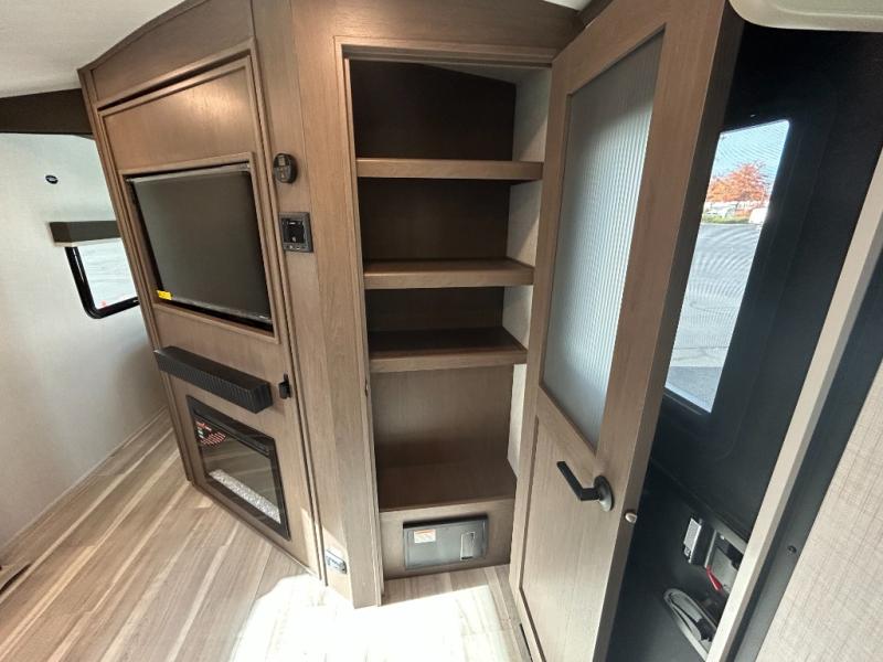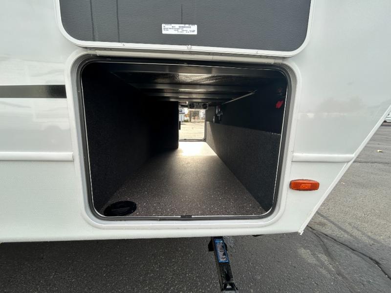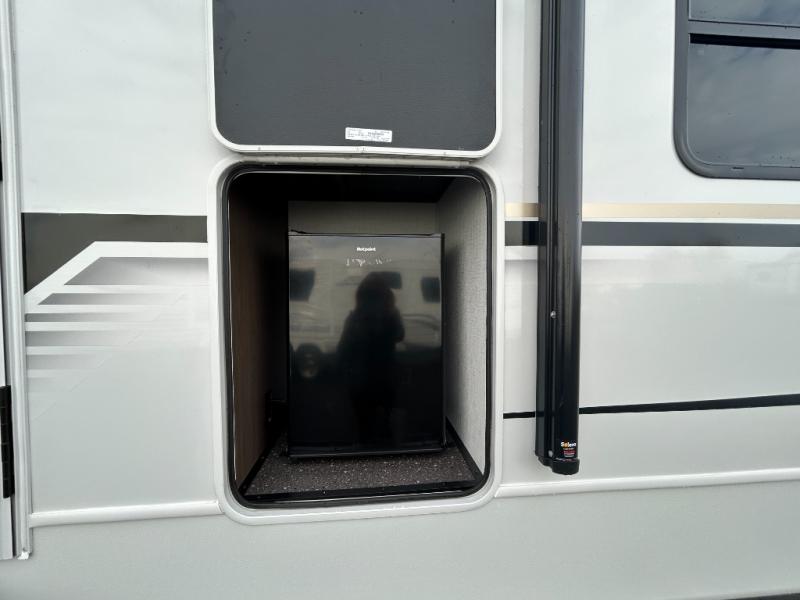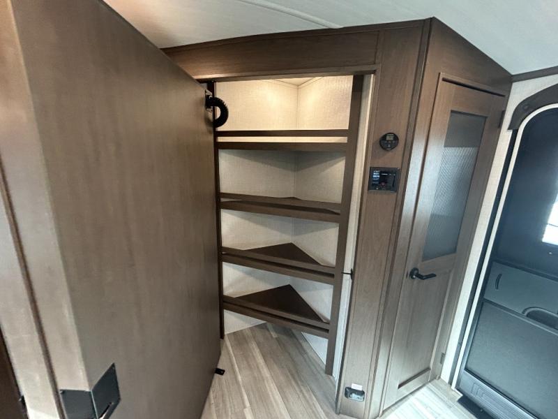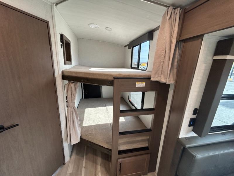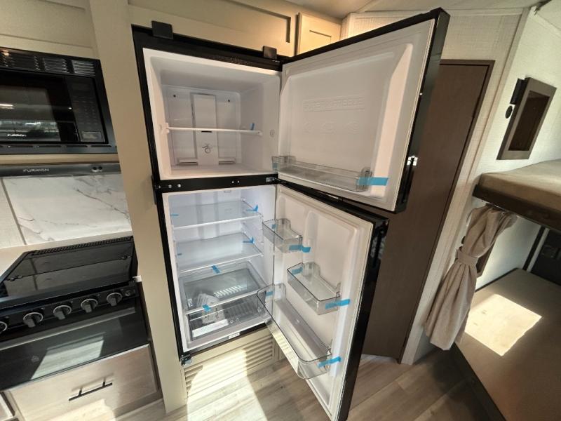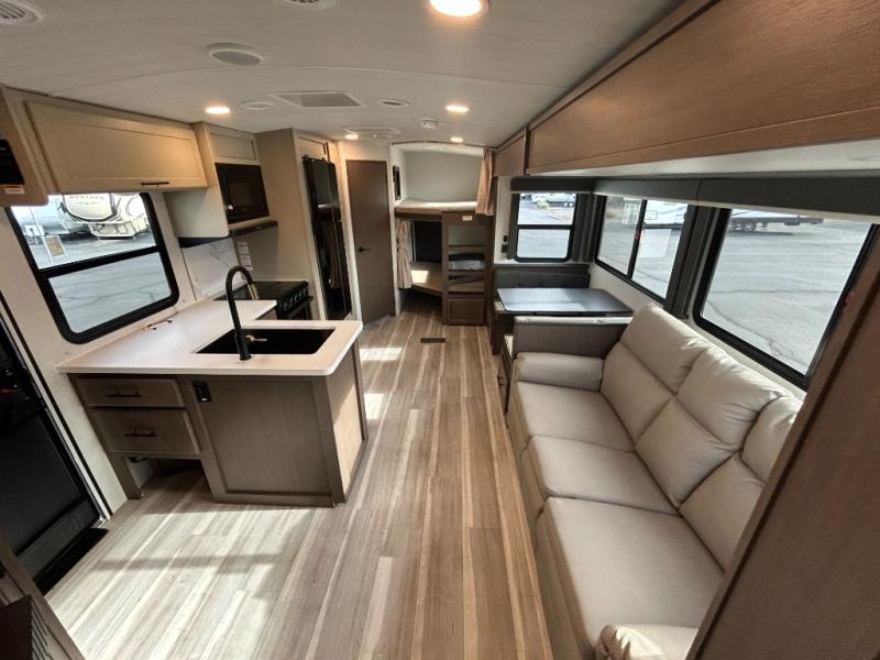 With dual entry doors in this travel trailer, you can enter in through the main living area or the full bath for convenience! Once inside, the sleeper sofa and booth dinette provide places to relax, eat, and play games, plus there is an entertainment center with hidden storage behind to keep movies organized. A full kitchen with a three burner cooktop and 12V refrigerator will allow you to cook and store food, or you can head outdoors to utilize the outdoor kitchen prep area. There is also drop-frame storage outside for fishing poles and hiking gear, and the 21' electric awning provides shade as you relax. When it's time to call it a night, the king bed in the front private bedroom is sure to bring comfort, while the little ones take the double-size bunks, and any other guests can sleep on the living room furniture!