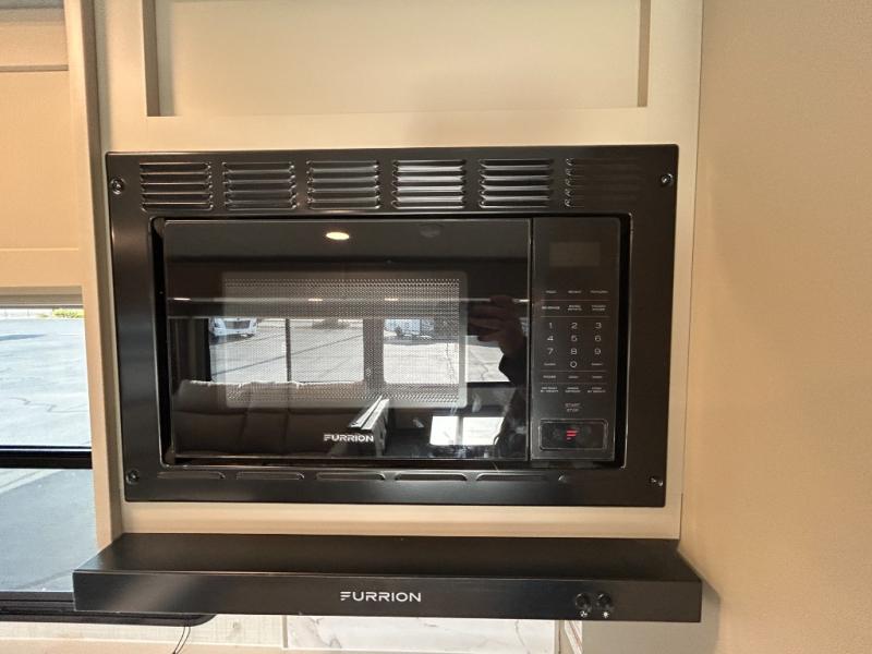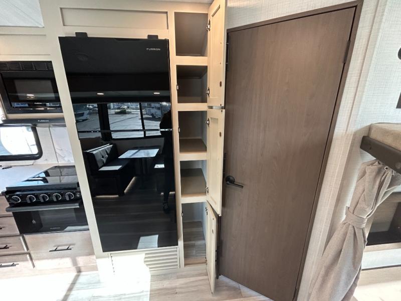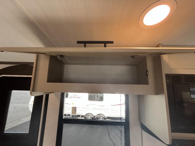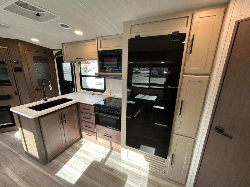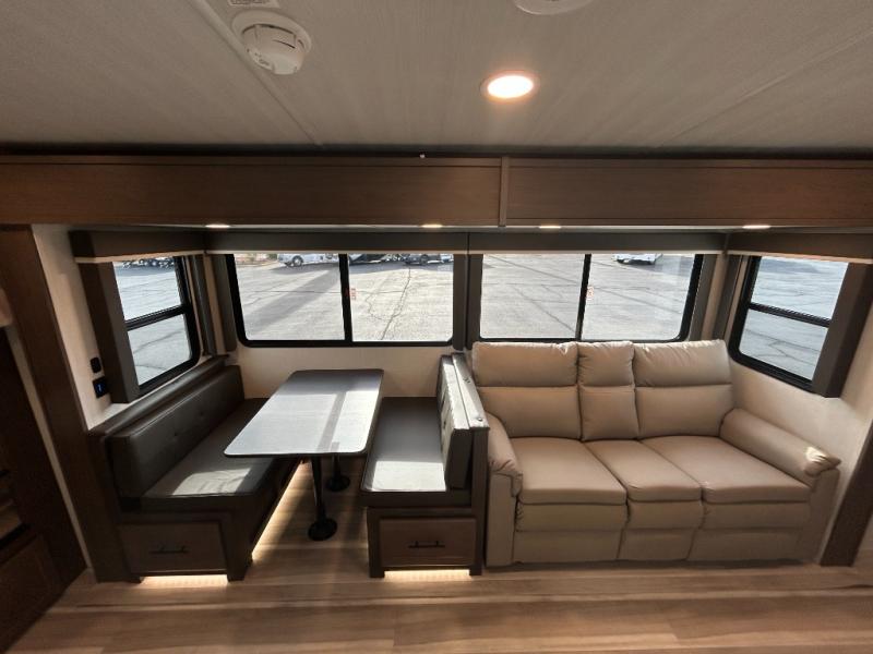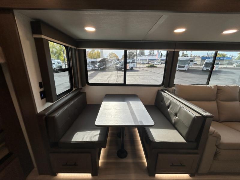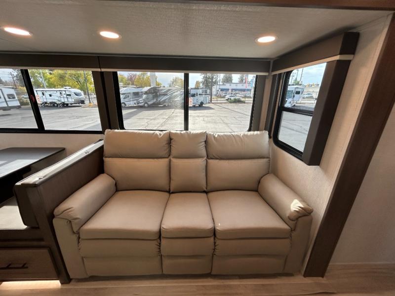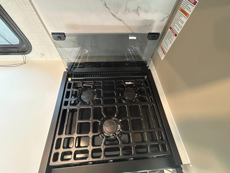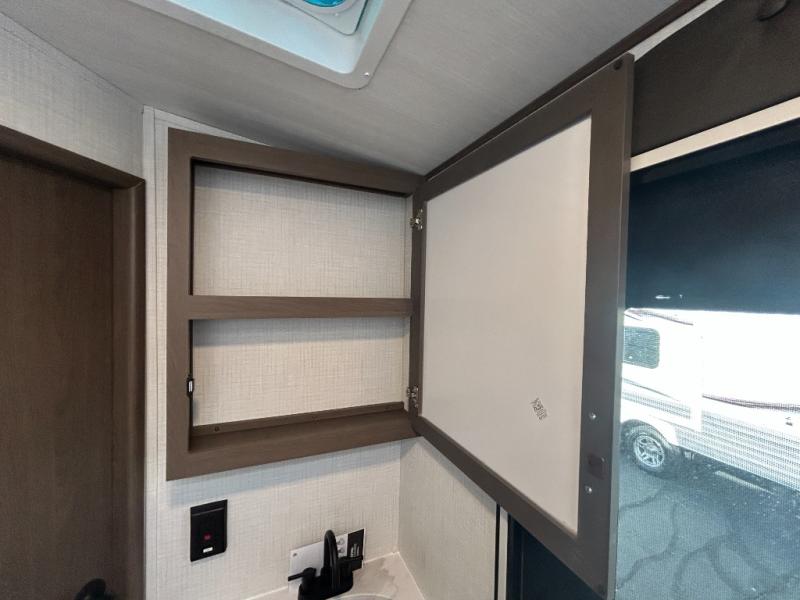 With dual entry doors in this travel trailer, you can enter in through the main living area or the full bath for convenience! Once inside, the sleeper sofa and booth dinette provide places to relax, eat, and play games, plus there is an entertainment center with hidden storage behind to keep movies organized. A full kitchen with a three burner cooktop and 12V refrigerator will allow you to cook and store food, or you can head outdoors to utilize the outdoor kitchen prep area. There is also drop-frame storage outside for fishing poles and hiking gear, and the 21' electric awning provides shade as you relax. When it's time to call it a night, the king bed in the front private bedroom is sure to bring comfort, while the little ones take the double-size bunks, and any other guests can sleep on the living room furniture!