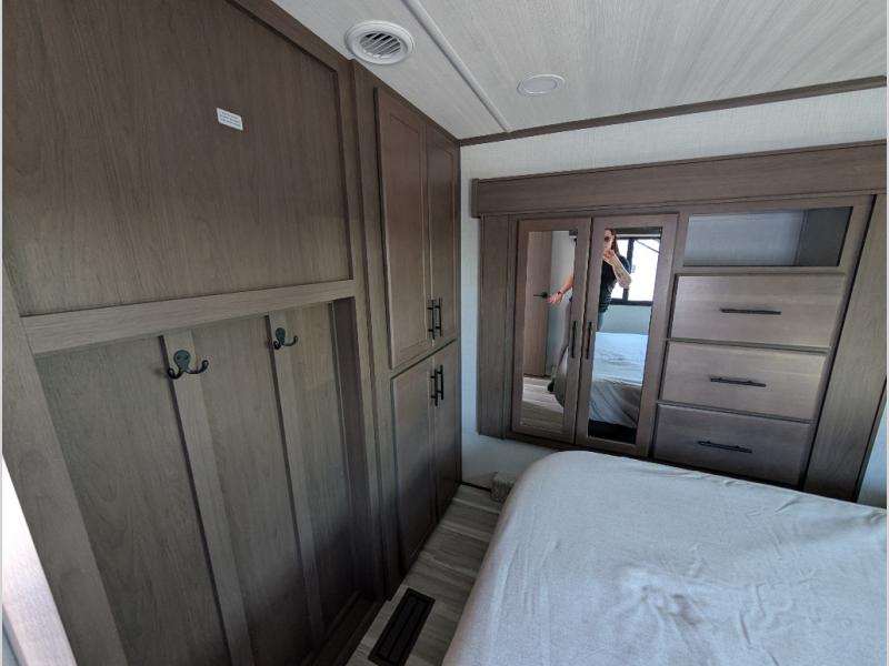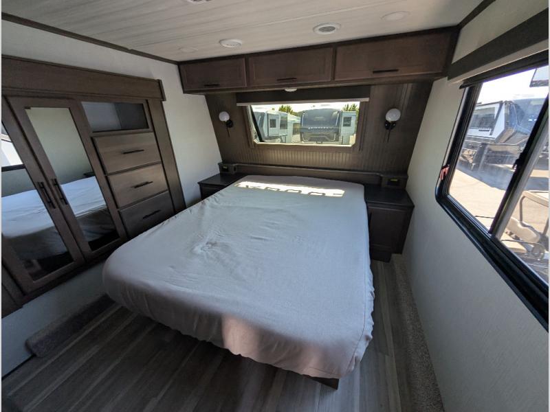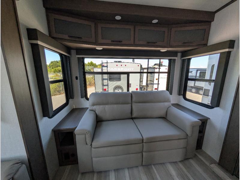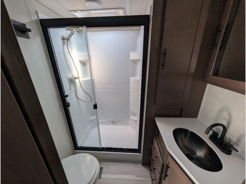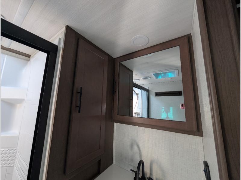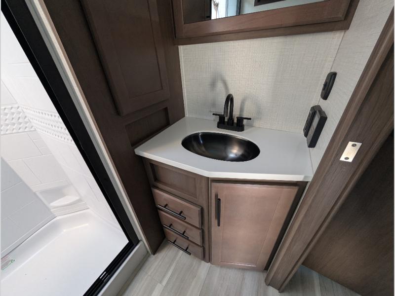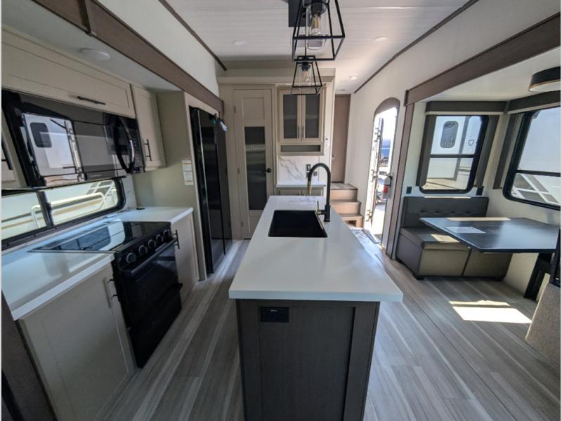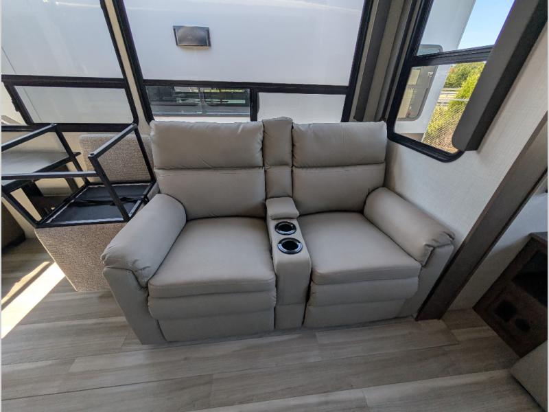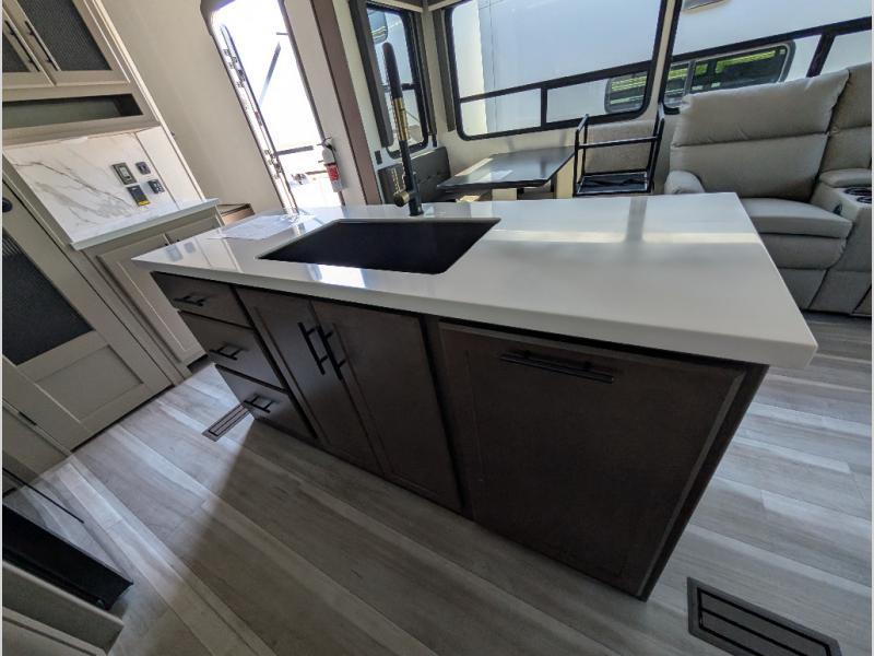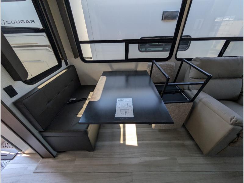 The dual-sink vanity in the full bathroom on this Cougar fifth wheel is what will make your morning routine feel just the same on the road as it does at home! You'll also sleep just as well on the queen-size bed in the front private bedroom, and there is under-bed storage, a full-height wardrobe, and a dresser for all of your personal belongings. As you spend time in the main living area, you'll appreciate having extra space thanks to the set of opposing slides, and the kitchen island will be easy to work around. You'll be able to relax on the tri-fold sleeper sofa and theater seating while you watch the LED HDTV, and the booth dinette is another seating location that can be used for meal time or game nights.