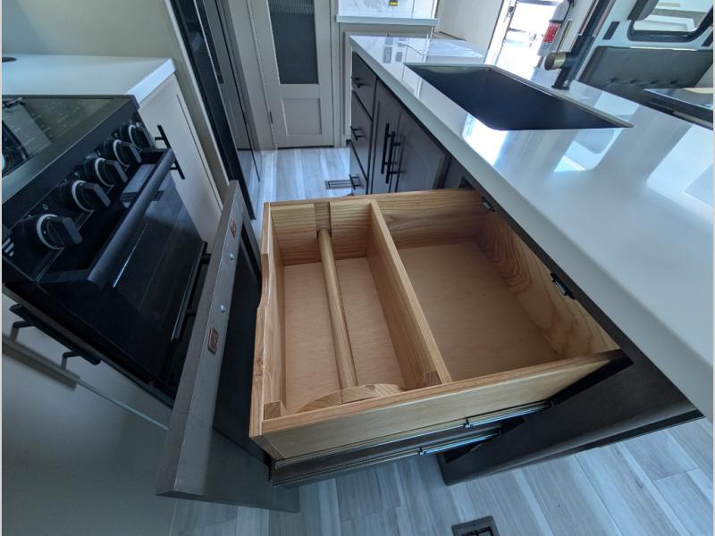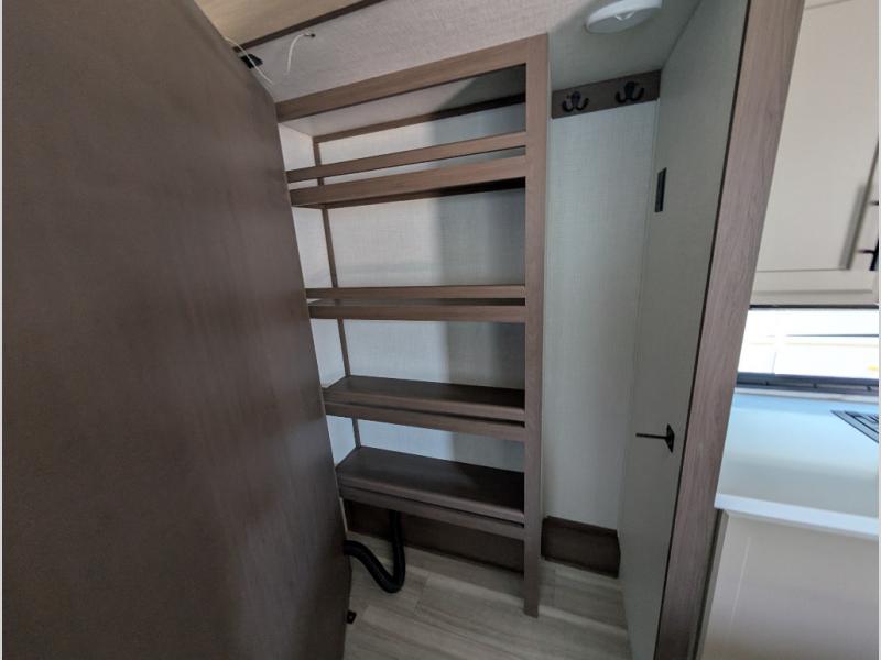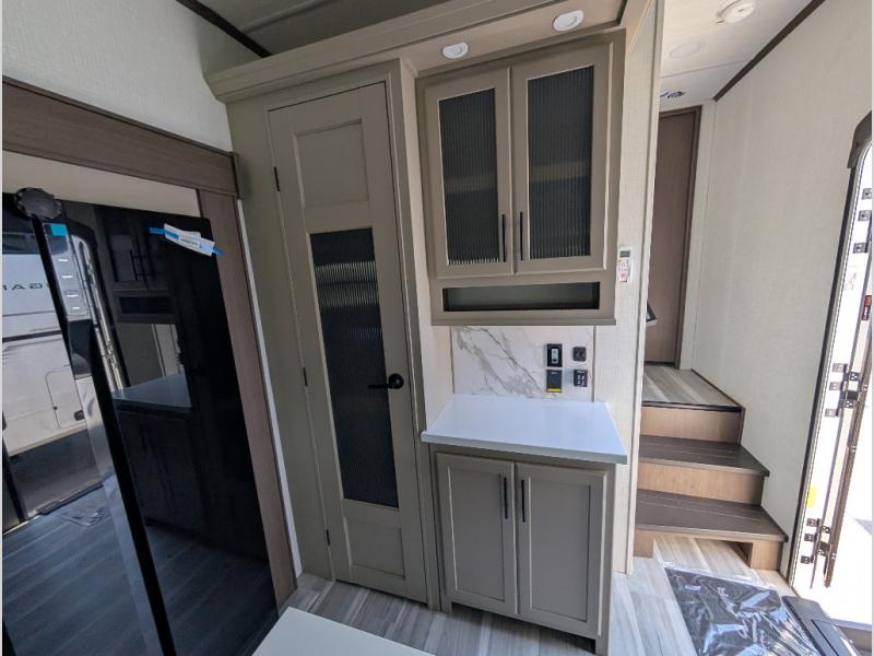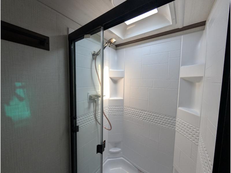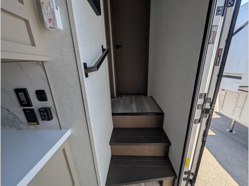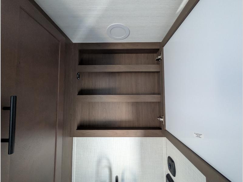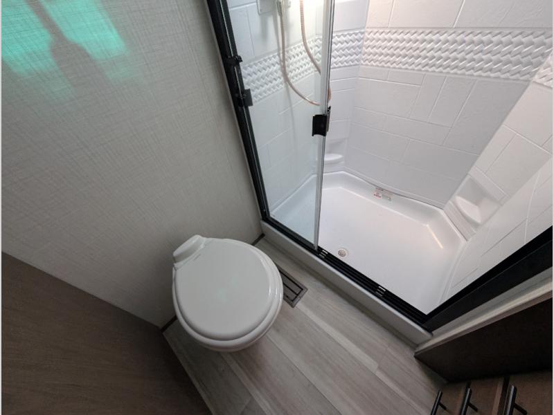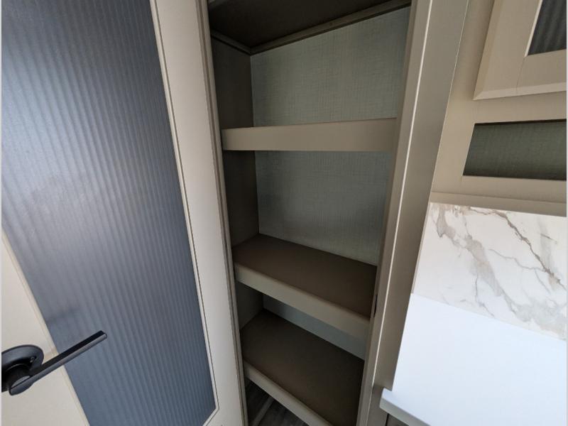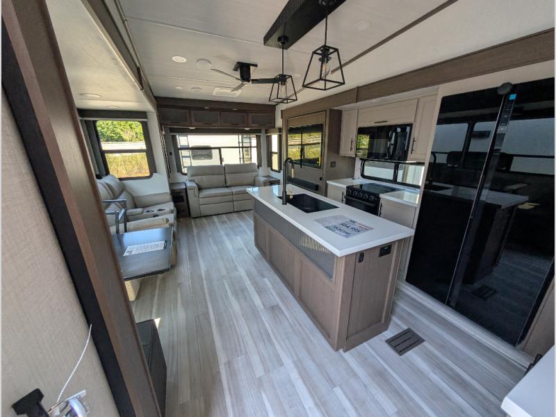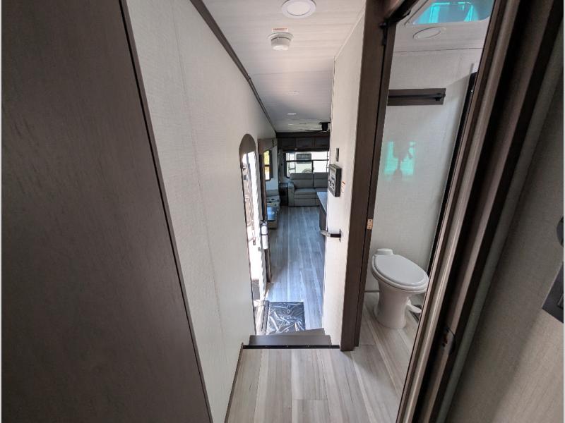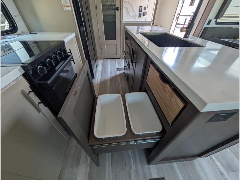 The dual-sink vanity in the full bathroom on this Cougar fifth wheel is what will make your morning routine feel just the same on the road as it does at home! You'll also sleep just as well on the queen-size bed in the front private bedroom, and there is under-bed storage, a full-height wardrobe, and a dresser for all of your personal belongings. As you spend time in the main living area, you'll appreciate having extra space thanks to the set of opposing slides, and the kitchen island will be easy to work around. You'll be able to relax on the tri-fold sleeper sofa and theater seating while you watch the LED HDTV, and the booth dinette is another seating location that can be used for meal time or game nights.