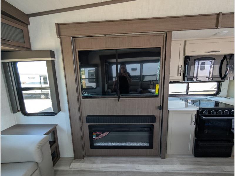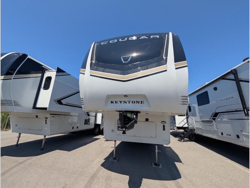 Spend more time having fun and less time worrying about your RV with the Keystone Cougar fifth wheel! These units have all that you will need for excellent vacations. The interior comes with 5/8" one-piece DynaSpan® flooring, tall slide outs for added comfort and head room, night roller shades throughout, and residential, raised-panel hardwood cabinet doors and drawers. You will also enjoy decorative crown molding, a 5,500 BTU electric fireplace with thermostat control and remote, and a Max Air exhaust fan with rain sensor. The exterior is also fully outfitted with a convenience center, friction-hinge entry door, electric four-point auto leveling system, and Lippert SolidStep® on the main entry. There is a full pass-through storage with slam-latch baggage doors, an industry-best 80-gallon fresh tank capacity, a 2" accessory hitch with 300-LB storage capacity, and an outside shower.
