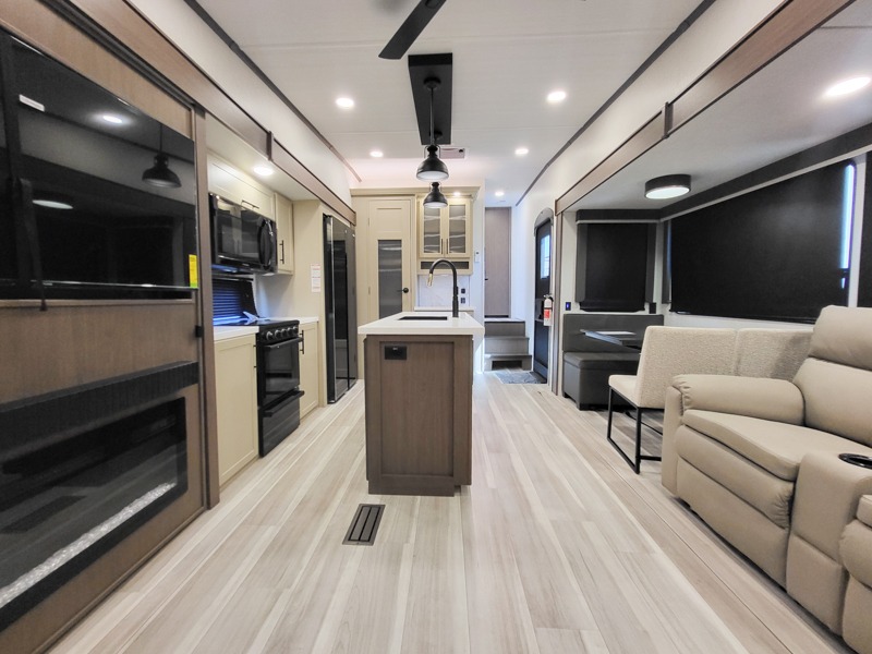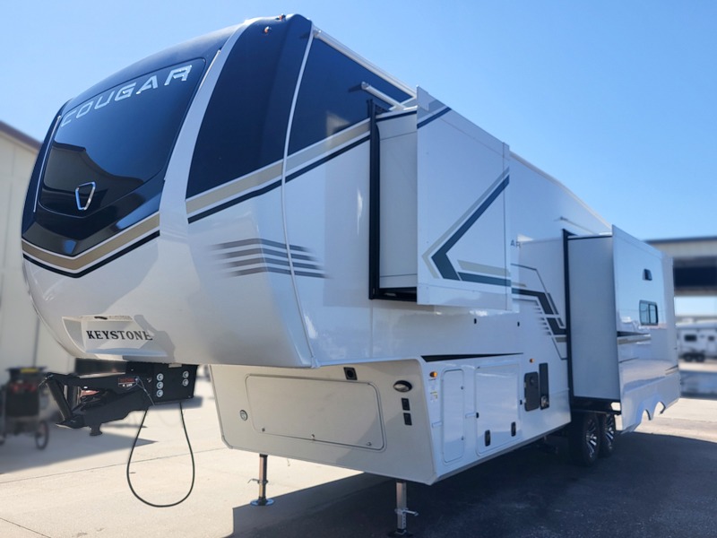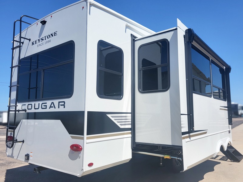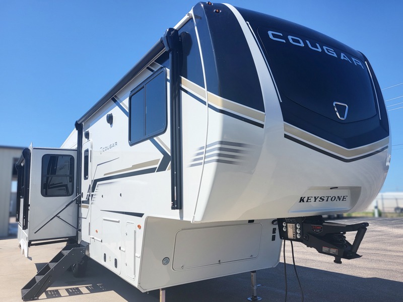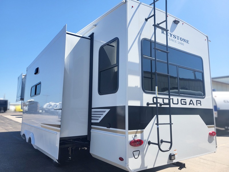 Spend more time having fun and less time worrying about your RV with the Keystone Cougar fifth wheel! These units have all that you will need for excellent vacations. The interior comes with 5/8" one-piece DynaSpan® flooring, tall slide outs for added comfort and head room, night roller shades throughout, and residential, raised-panel hardwood cabinet doors and drawers. You will also enjoy decorative crown molding, a 5,500 BTU electric fireplace with thermostat control and remote, and a Max Air exhaust fan with rain sensor. The exterior is also fully outfitted with a convenience center, friction-hinge entry door, electric four-point auto leveling system, and Lippert SolidStep® on the main entry. Each model is available with the optional Hero Edition. By choosing this edition, you can help support our nation's heros and their families by contributing to the Wounded Warrior Project. This optional package features an industry exclusive full-body paint matte finish, frameless windows, a glass entry door, blackout rims, and green LED exterior accent lighting; see dealer for more details!