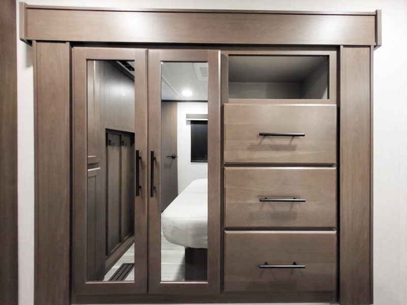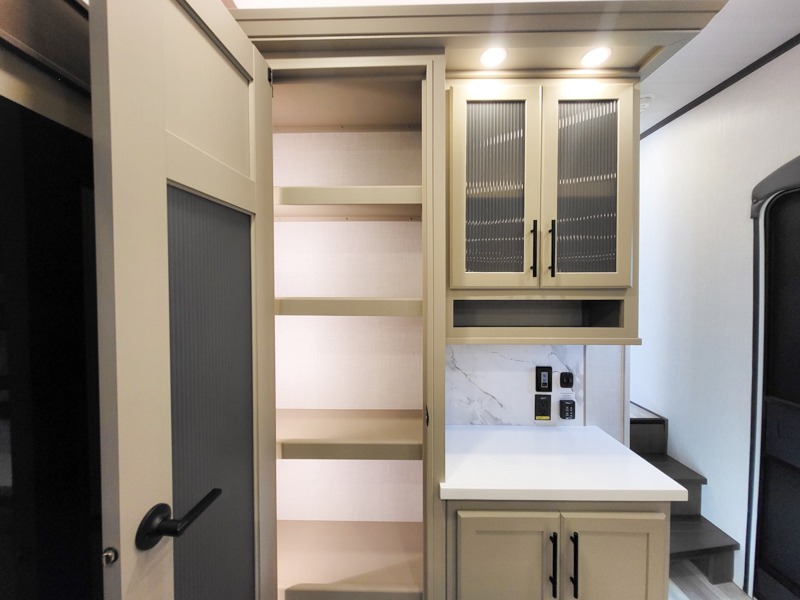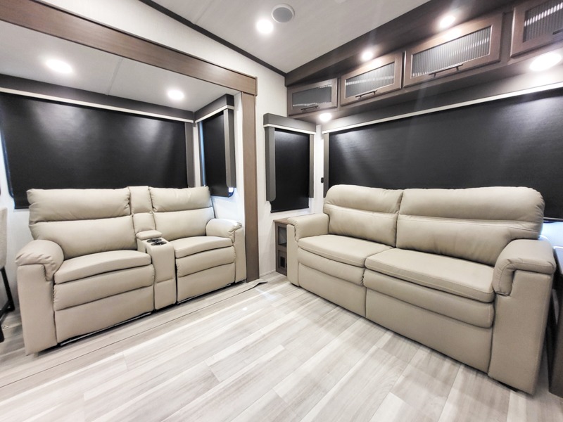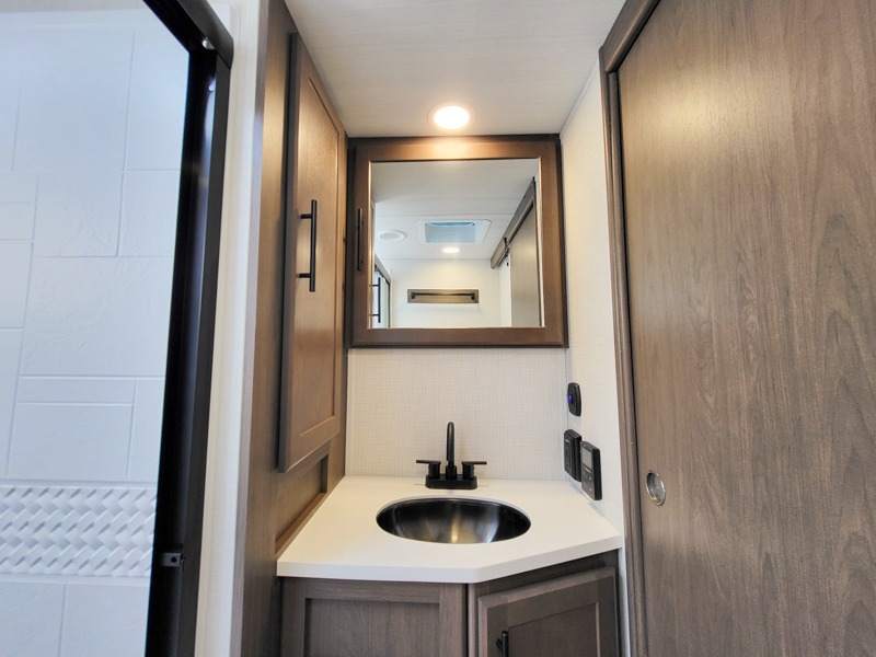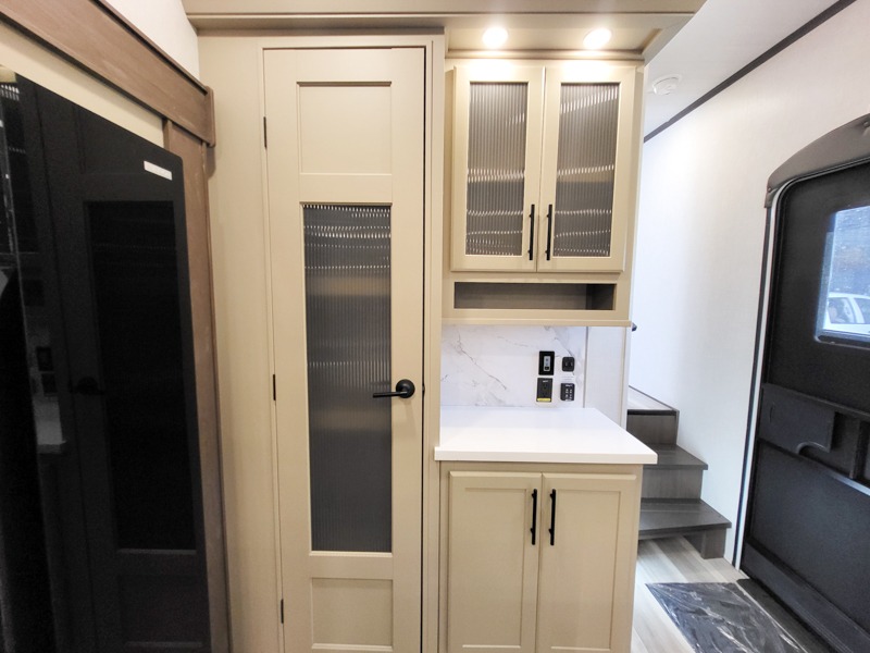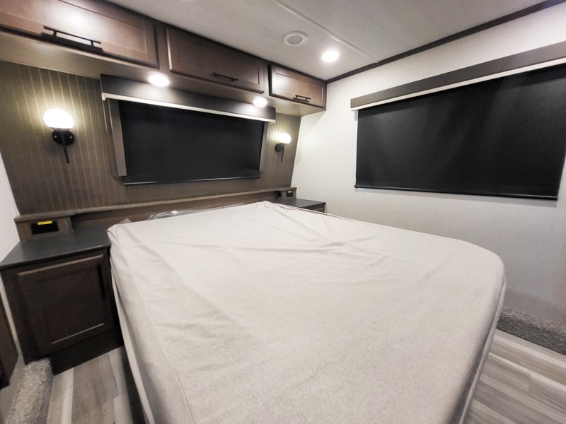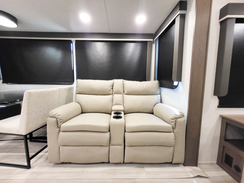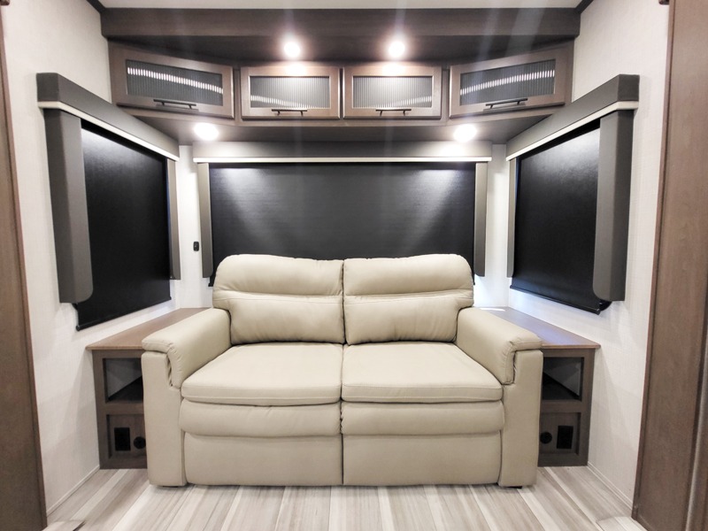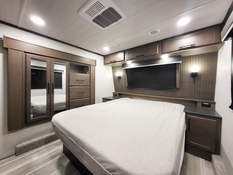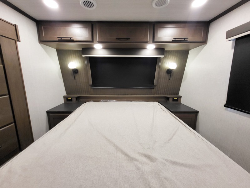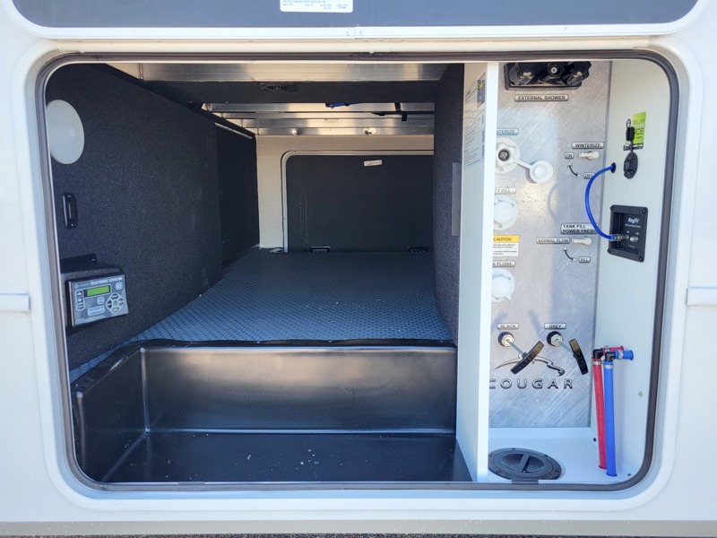 Gain some freedom to travel with this Cougar fifth wheel! You will be oh-so comfortable in the front private bedroom as you sleep on the queen-size bed, and the wardrobe slide will provide you with clothing storage. You'll be right next to the full bathroom while you're in the bedroom, so you can easily step inside the bathroom for a quick rinse in the 30" x 40" shower. The main living area offers you more space with its opposing slides, and you'll be able to get comfortable each evening on the tri-fold sleeper sofa and theater seating, or play a game at the free-standing dinette with an ottoman. There is also a pivoting entertainment door with a pantry and cordless vacuum prep!
