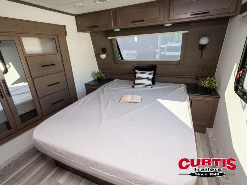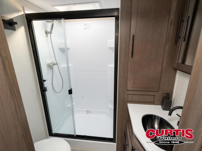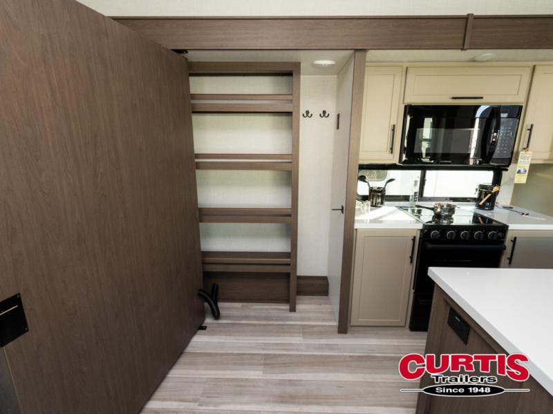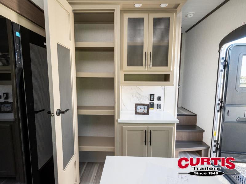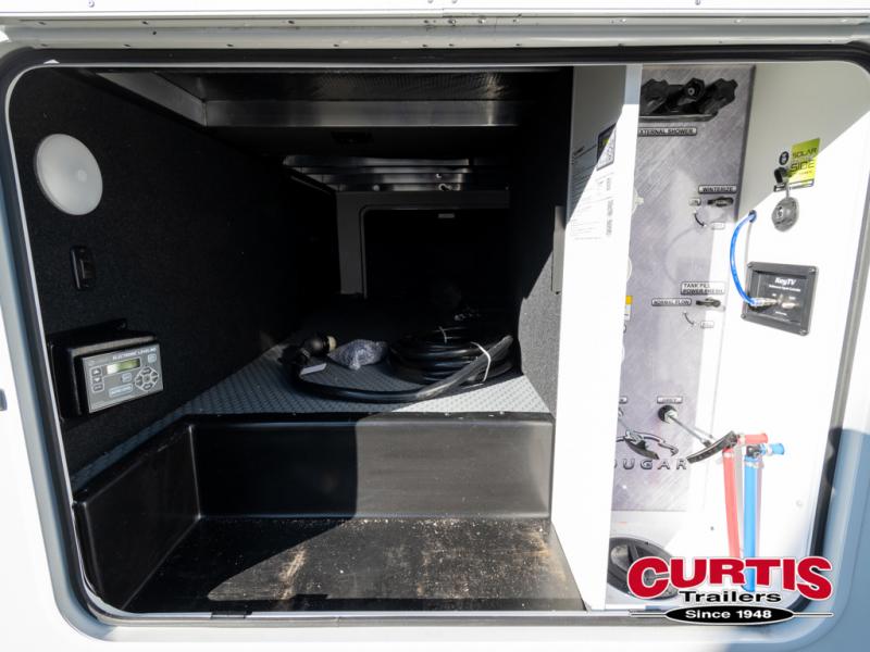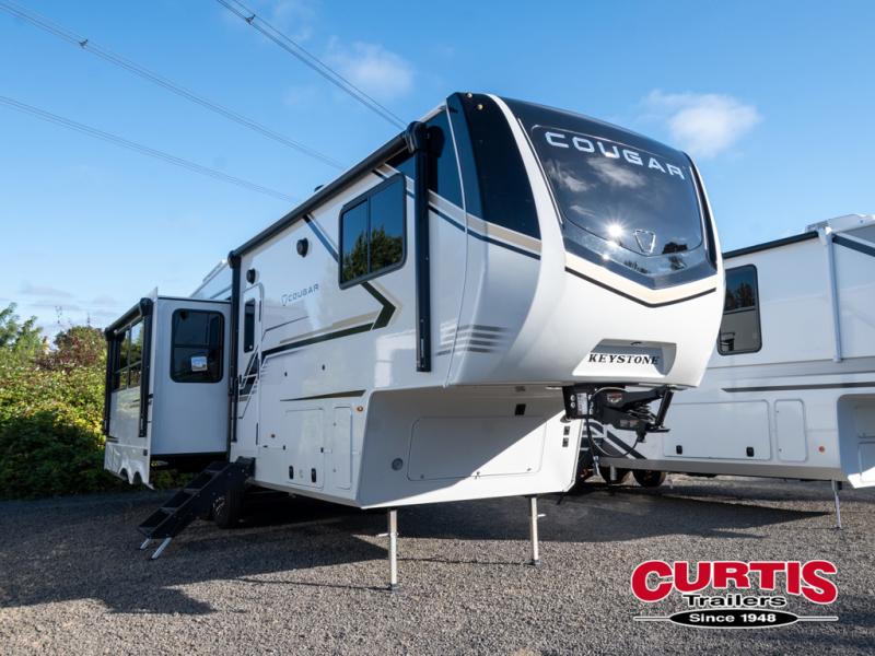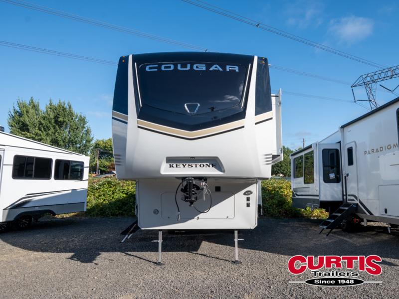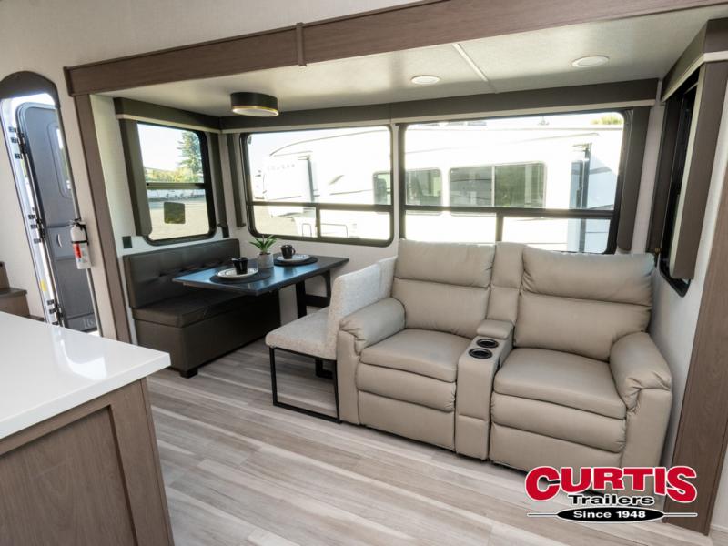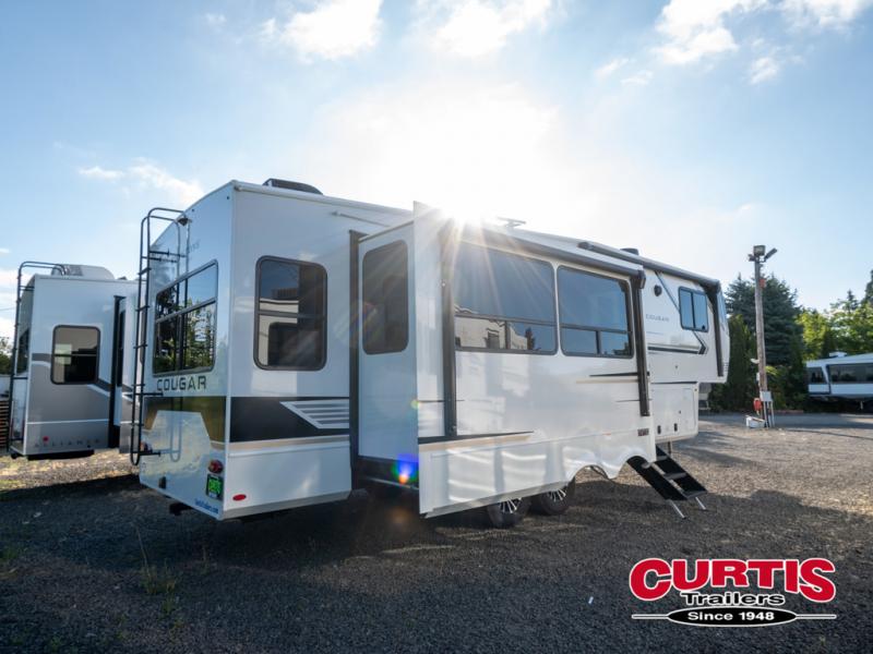 Gain some freedom to travel with this Cougar fifth wheel! You will be oh-so comfortable in the front private bedroom as you sleep on the queen-size bed, and the wardrobe slide will provide you with clothing storage. You'll be right next to the full bathroom while you're in the bedroom, so you can easily step inside the bathroom for a quick rinse in the 30" x 40" shower. The main living area offers you more space with its opposing slides, and you'll be able to get comfortable each evening on the tri-fold sleeper sofa and theater seating, or play a game at the booth dinette. There is also a pivoting entertainment door with a pantry and cordless vacuum prep!