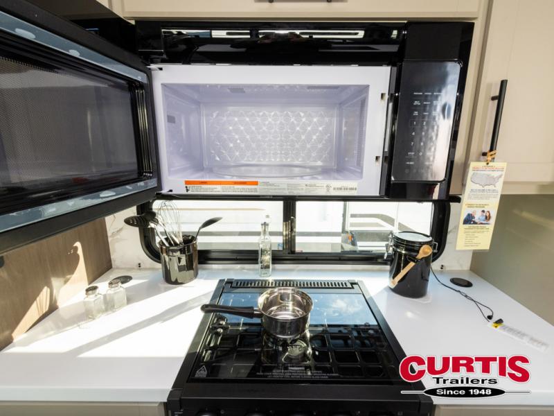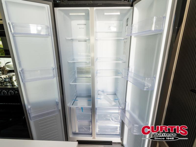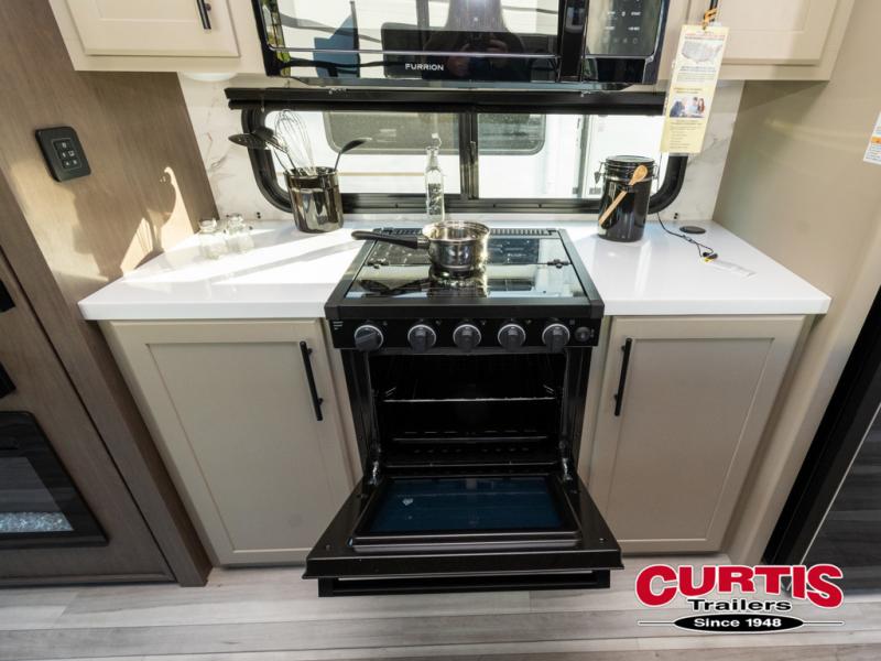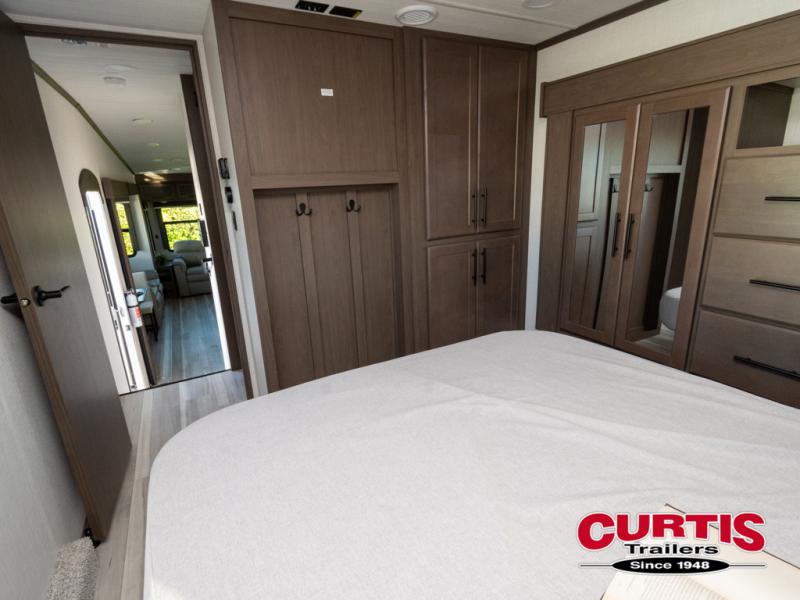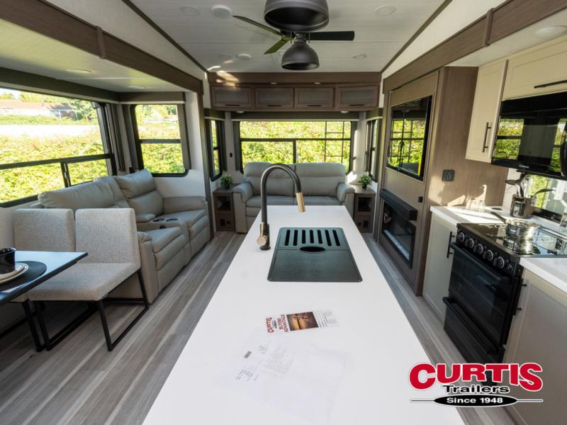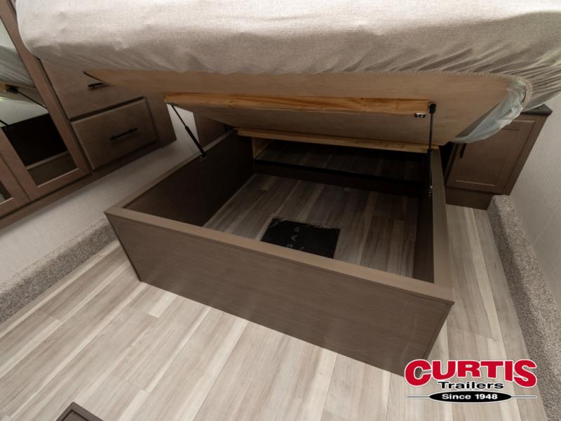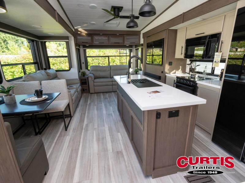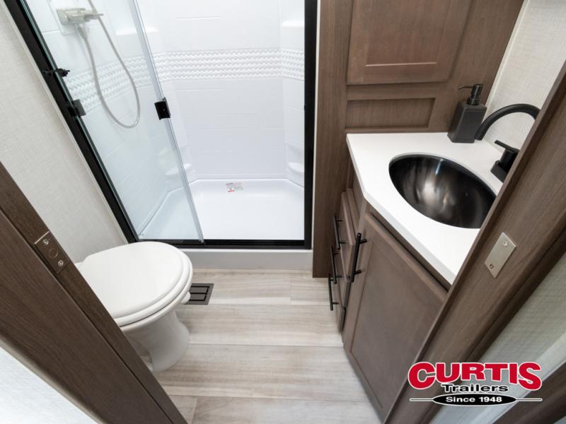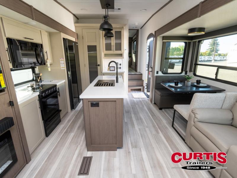 Gain some freedom to travel with this Cougar fifth wheel! You will be oh-so comfortable in the front private bedroom as you sleep on the queen-size bed, and the wardrobe slide will provide you with clothing storage. You'll be right next to the full bathroom while you're in the bedroom, so you can easily step inside the bathroom for a quick rinse in the 30" x 40" shower. The main living area offers you more space with its opposing slides, and you'll be able to get comfortable each evening on the tri-fold sleeper sofa and theater seating, or play a game at the booth dinette. There is also a pivoting entertainment door with a pantry and cordless vacuum prep!