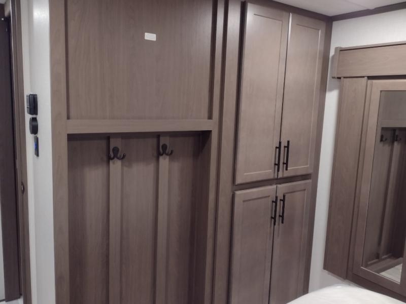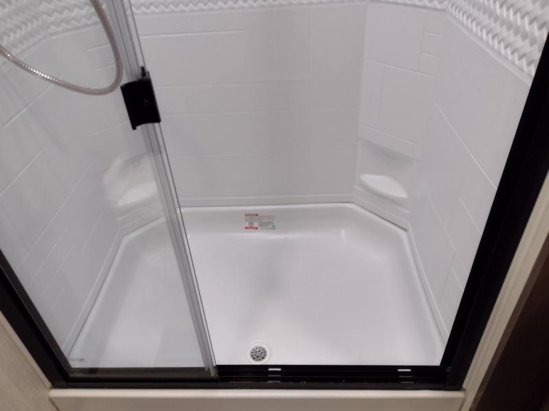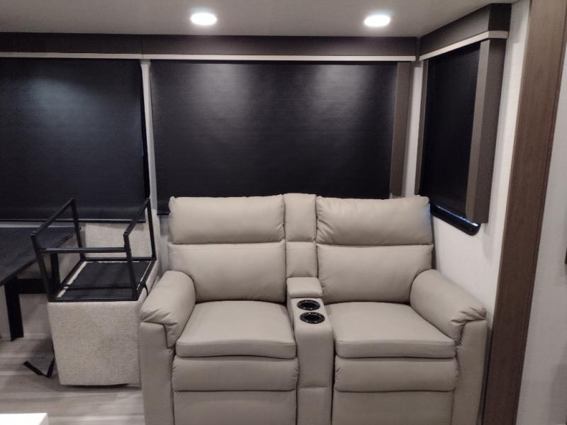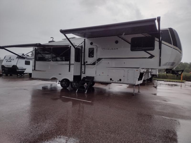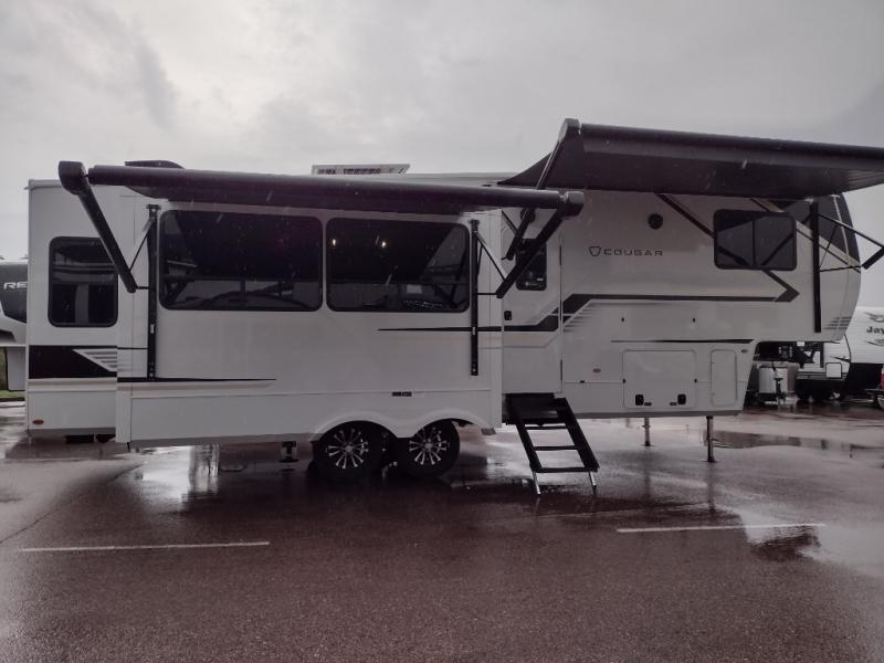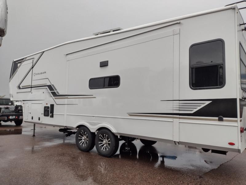 Gain some freedom to travel with this Cougar fifth wheel! You will be oh-so comfortable in the front private bedroom as you sleep on the queen-size bed, and the wardrobe slide will provide you with clothing storage. You'll be right next to the full bathroom while you're in the bedroom, so you can easily step inside the bathroom for a quick rinse in the 30" x 40" shower. The main living area offers you more space with its opposing slides, and you'll be able to get comfortable each evening on the tri-fold sleeper sofa and theater seating, or play a game at the booth dinette. There is also a pivoting entertainment door with a pantry and cordless vacuum prep!