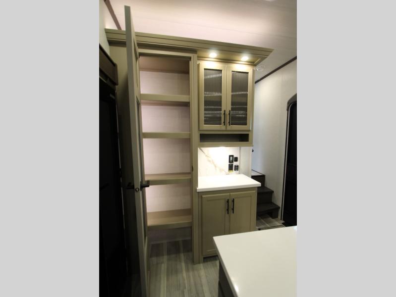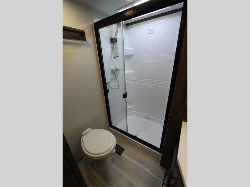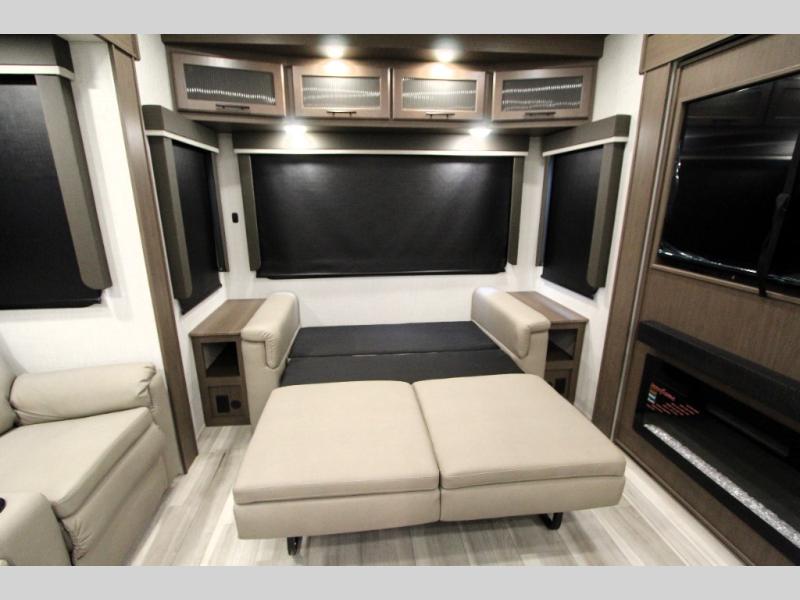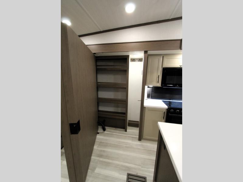 Gain some freedom to travel with this Cougar fifth wheel! You will be oh-so comfortable in the front private bedroom as you sleep on the queen-size bed, and the wardrobe slide will provide you with clothing storage. You'll be right next to the full bathroom while you're in the bedroom, so you can easily step inside the bathroom for a quick rinse in the 30" x 40" shower. The main living area offers you more space with its opposing slides, and you'll be able to get comfortable each evening on the tri-fold sleeper sofa and theater seating, or play a game at the booth dinette. There is also a pivoting entertainment door with a pantry and cordless vacuum prep!