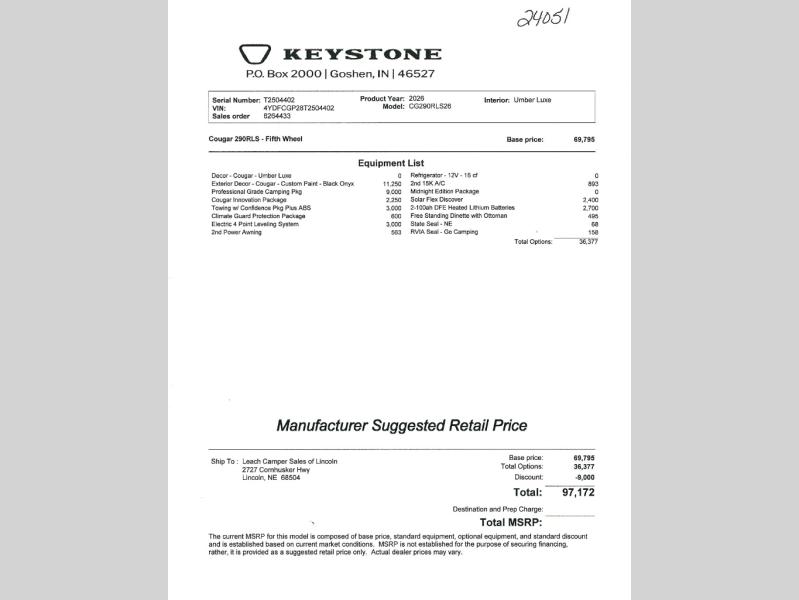 New 2026 Keystone RV Cougar 290RLS Fifth Wheel