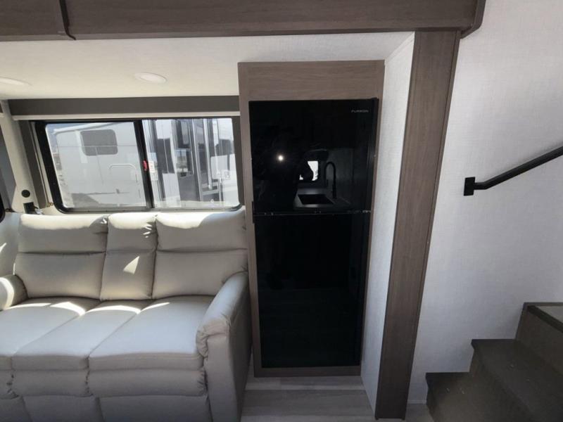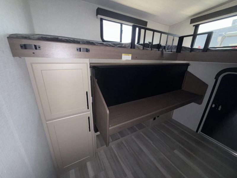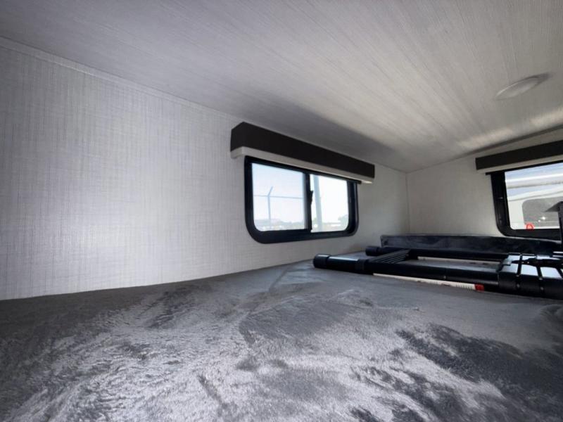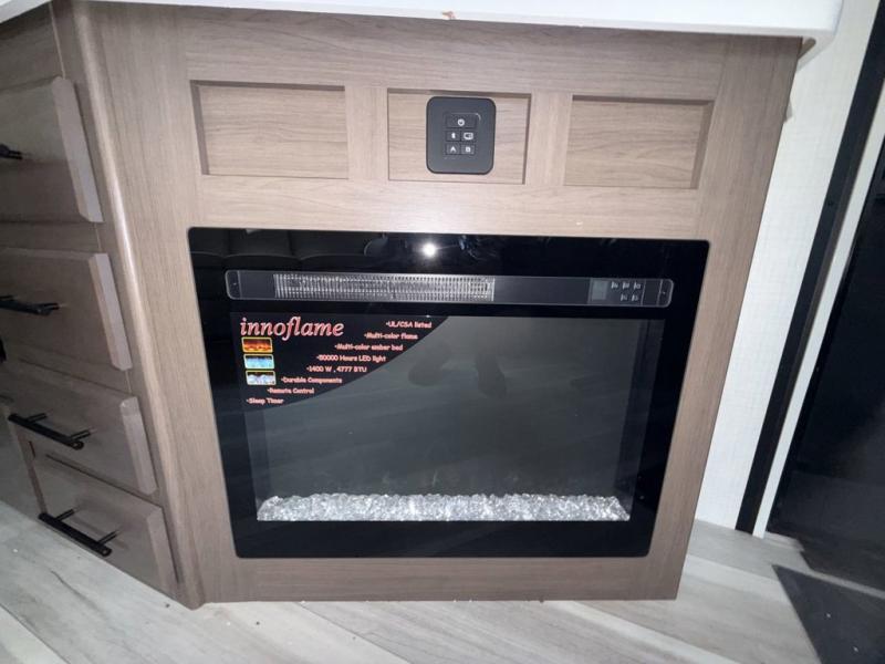 If you're needing additional sleeping space or a place to work on the road, take a look at this fifth wheel! The bunkhouse includes three bunks, and the lower bunk can swing up so you can work at the desk. There is also an exterior cargo door here so you can pack luggage right into the bunkhouse. You will have your own private bedroom up front with a walk-around queen bed, a wardrobe slide, plus dual wardrobes and nightstands. The main living area will be a favorite hangout spot with its tri-fold sofa, L-shaped dinette with an ottoman, plus an LED HDTV. You even have a fireplace for a more at-home feel. This model also includes a 20' power awning and an exterior mini refrigerator for cold drinks!