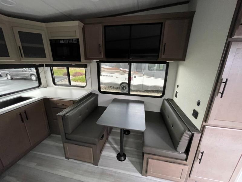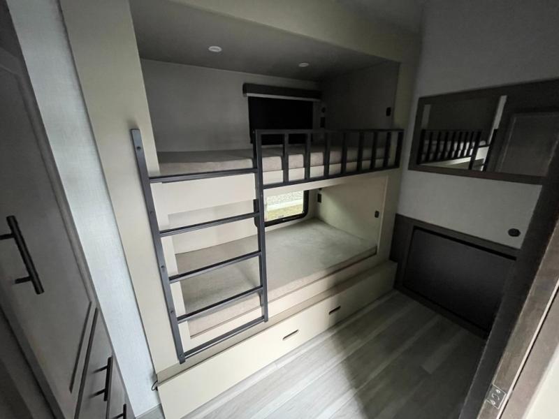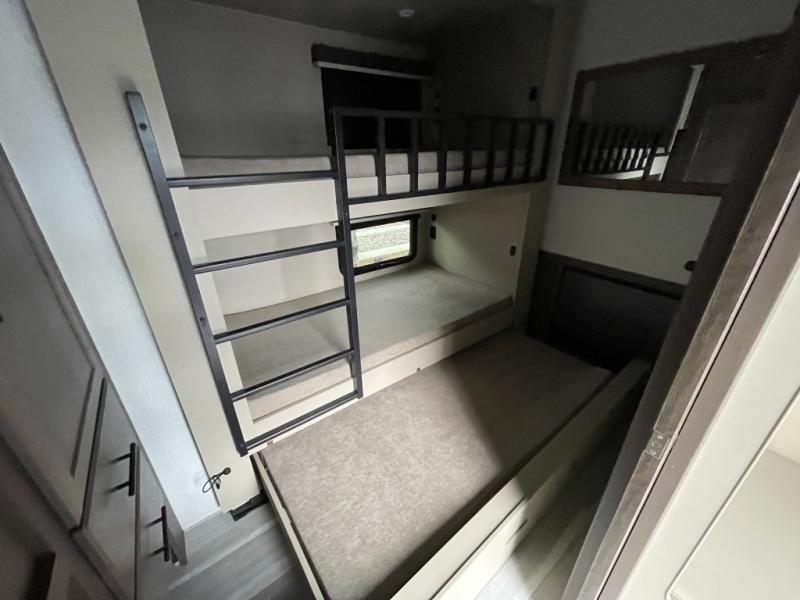 The whole crew will love camping trips in this spacious fifth wheel! From the front bedroom with a walk-around king bed to the rear kitchen with ample counter space, this is something for everyone. A middle bunkroom includes built-in bunk beds with a lower trundle bed and a flip-up table if some work needs done. Once your meals are made, you can dine at the booth dinette, relax on the sofa, or head outdoors to enjoy the power awnings. The full bath is towards the front near the bedroom for convenience. Here, you'll find a king bed, dual nightstands, plus a wardrobe with washer and dryer prep if you choose to add these appliances!