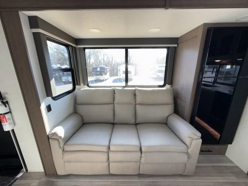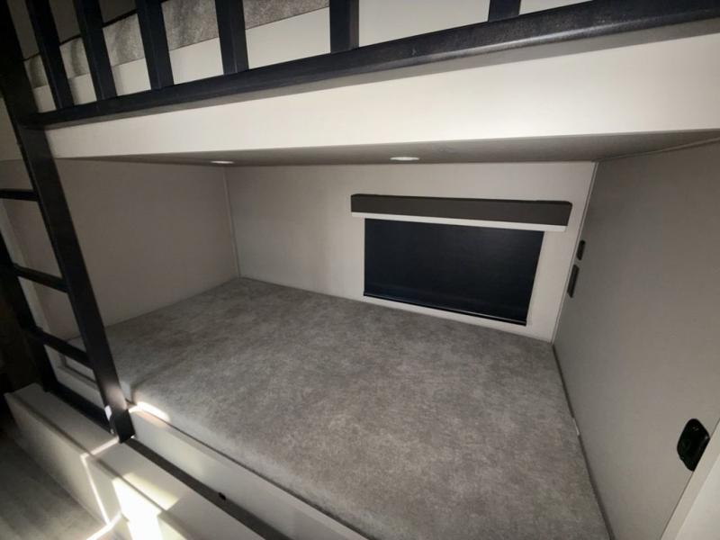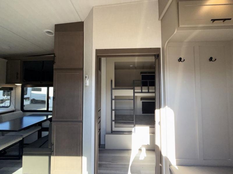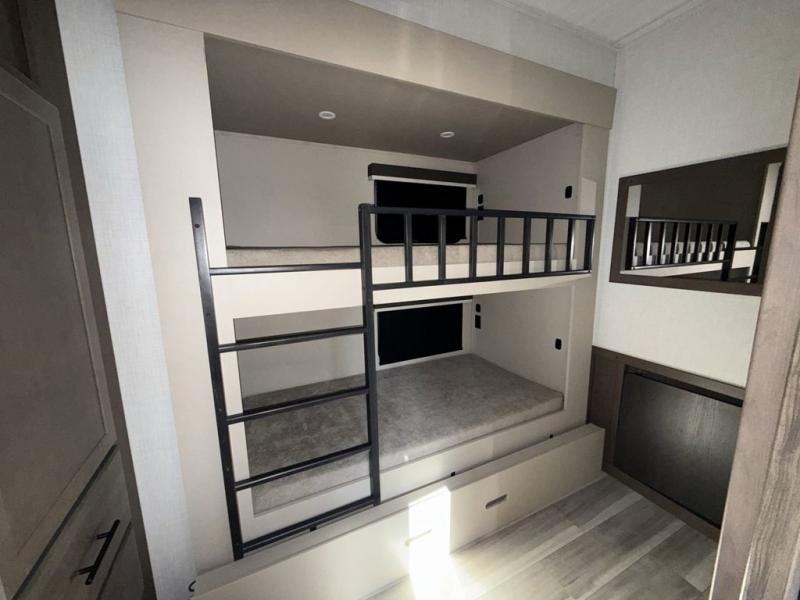 If you're needing additional sleeping space or a place to work on the road, take a look at this fifth wheel! The bunkhouse includes three bunks, and the lower bunk can swing up so you can work at the desk. There is also an exterior cargo door here so you can pack luggage right into the bunkhouse. You will have your own private bedroom up front with a walk-around queen bed, a wardrobe slide, plus dual wardrobes and nightstands. The main living area will be a favorite hangout spot with its tri-fold sofa, L-shaped dinette with an ottoman, plus an LED HDTV. You even have a fireplace for a more at-home feel. This model also includes a 20' power awning and an exterior mini refrigerator for cold drinks!