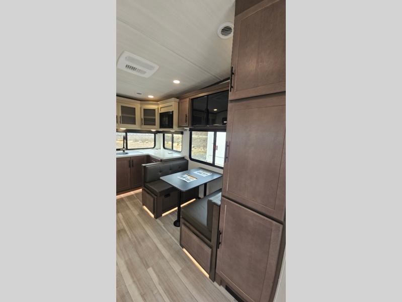 The whole crew will love camping trips in this spacious fifth wheel! From the front bedroom with a walk-around king bed to the rear kitchen with ample counter space, this is something for everyone. A middle bunkroom includes built-in bunk beds with a lower trundle bed and a flip-up table if some work needs done. Once your meals are made, you can dine at the booth dinette, relax on the sofa, or head outdoors to enjoy the power awnings. The full bath is towards the front near the bedroom for convenience. Here, you'll find a king bed, dual nightstands, plus a wardrobe with washer and dryer prep if you choose to add these appliances!