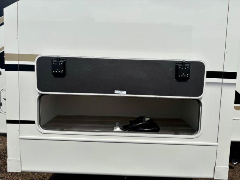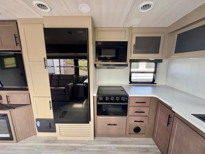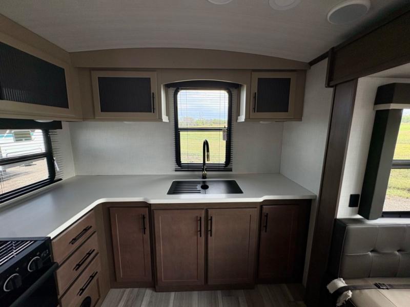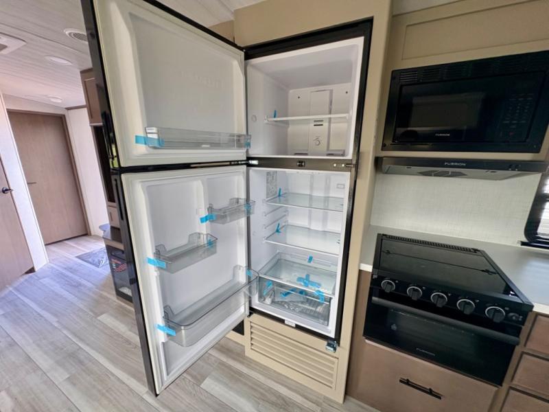 How does a queen bed slide with an optional king bed in the master suite sound? With this Cougar Half-Ton travel trailer, you'll have extra floor space and a full-width wardrobe allowing you to stay at your favorite campsite for long periods of time. The second slide located in the main living and kitchen area opens up this space for you to enjoy time spent inside just as much as outdoor adventures. The furniture even doubles as sleeping space for the kids or overnight guests. The rear kitchen layout is a convenience, and you will appreciate all the counter space for preparing and serving meals. You will find hidden storage behind the entertainment center, and next to the entertainment center is a pantry where you can store your favorite snacks.