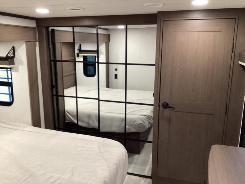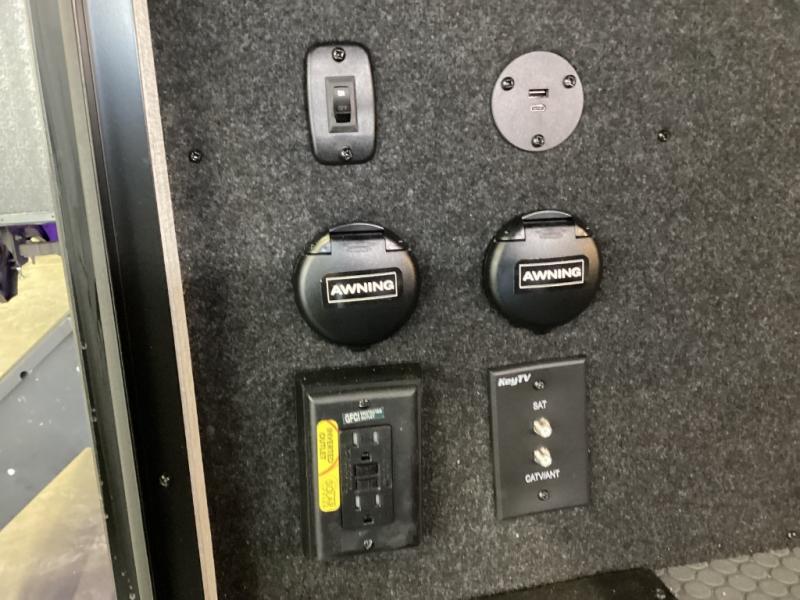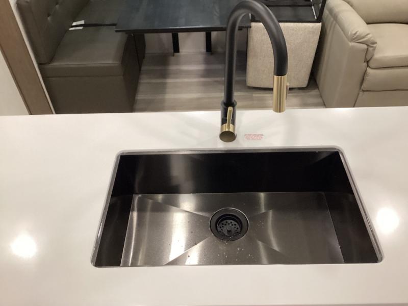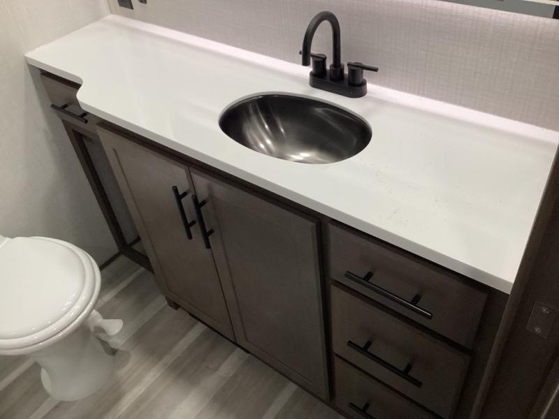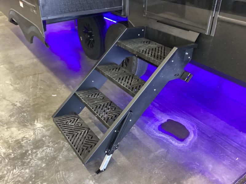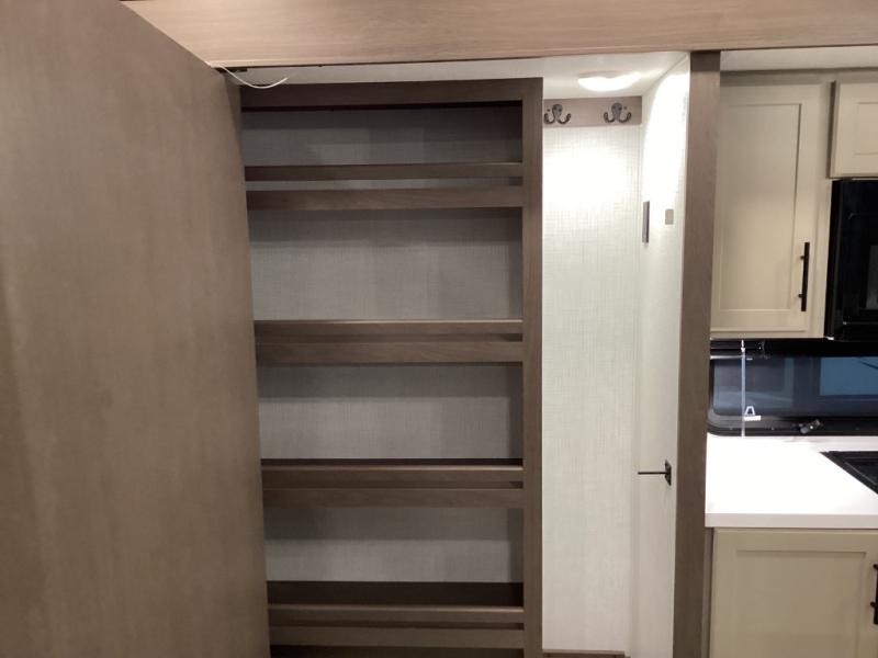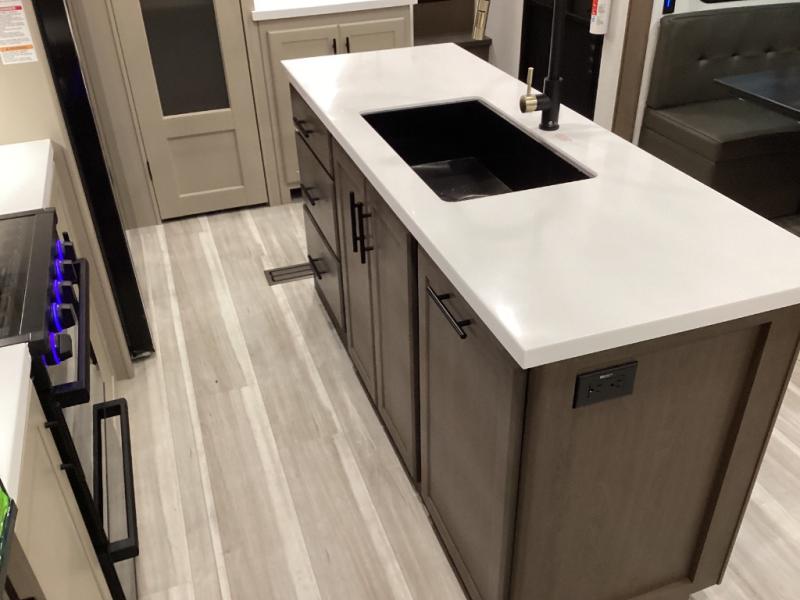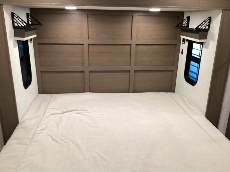 Design-forward touches like hardwood cabinets, Max Air ventilation, LED lighting, soft-close doors, electric auto-leveling, pass-through storage, power awnings, and solar prep—built for modern RV life