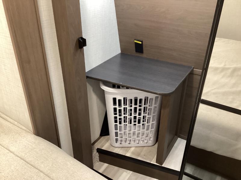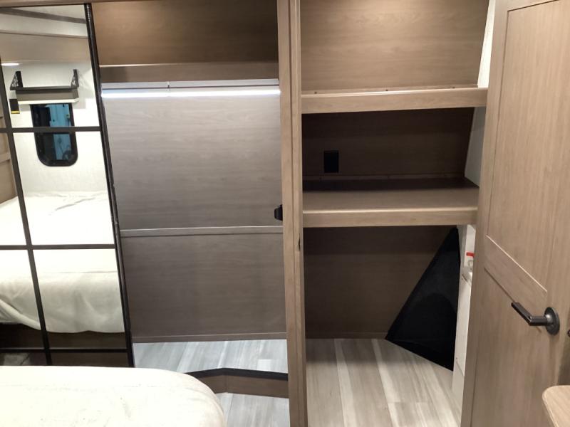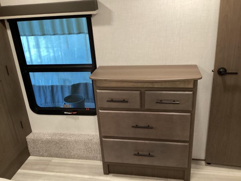 Sleep soundly on a queen bed slide-out with plenty of storage options in the wardrobe, dresser, and under-bed space -