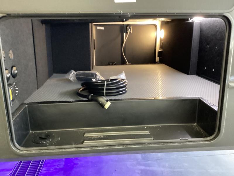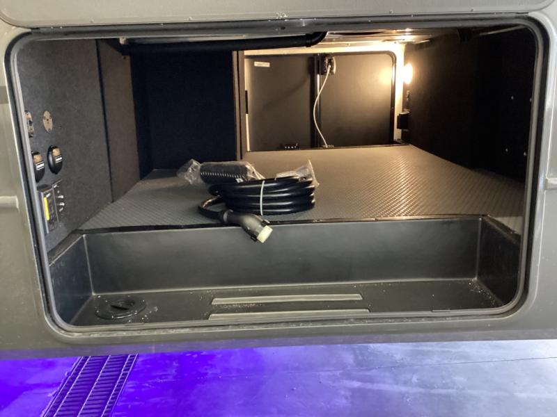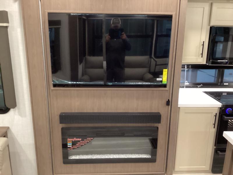 Relax in style on theater seating or a tri-fold sofa, with a fireplace and TV making this a true living room on wheels. -