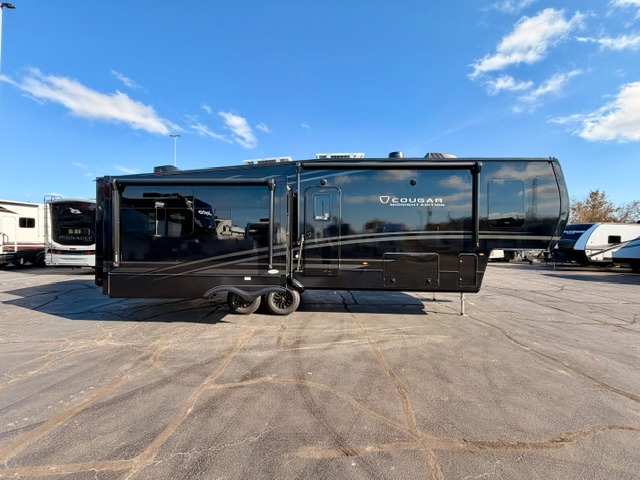 Spend more time having fun and less time worrying about your RV with the Keystone Cougar fifth wheel! These units have all that you will need for excellent vacations. The interior comes hardwood cabinet doors, solid surface kitchen countertops, an Oxygenics shower head and hose, plus a Vent-All window system. You will also appreciate the 12V charging stations throughout, the dual zone Bluetooth audio system, and the on-demand water heater for added comfort. The exterior is also fully outfitted with a convenience center, MaxTurn technology, Lippert axles with anti-lock braking system, and a Curt Road Armor shock absorbing equalizer for smooth towing. Each model is available with the optional Hero Edition. By choosing this edition, you can help support our nation's heros and their families by contributing to the Wounded Warrior Project. This optional package features an industry exclusive full-body paint matte finish, frameless windows, a glass entry door, blackout rims, and green LED exterior accent lighting; see dealer for more details!