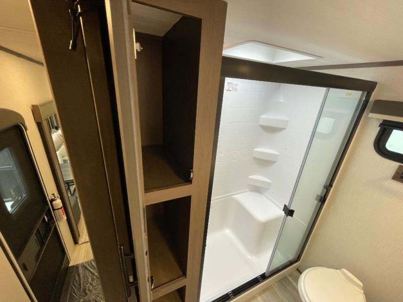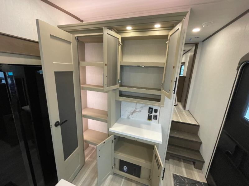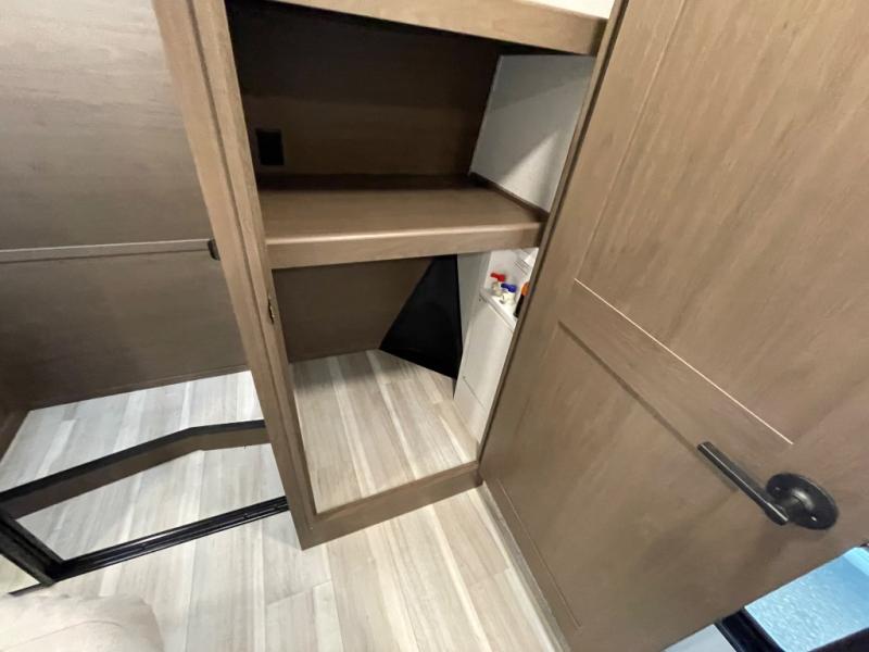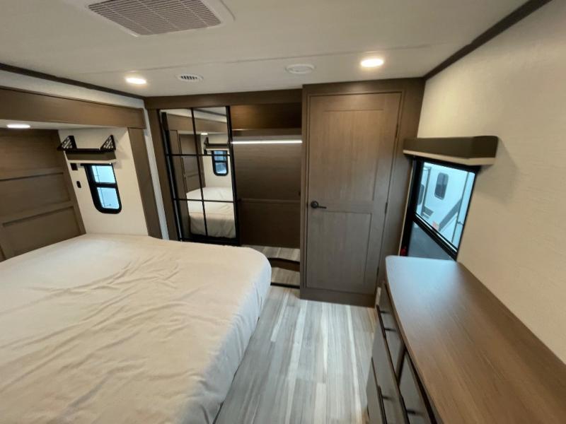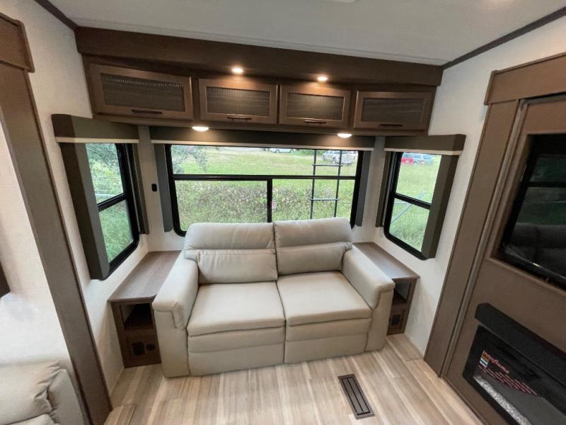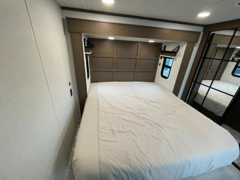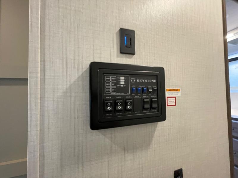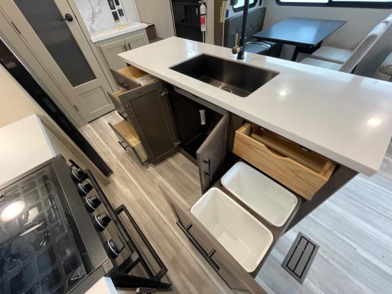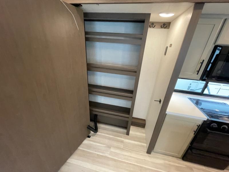 The dual opposing slides in the combined kitchen and living area will give you an open floorplan! You'll sleep on the queen-size bed in the front private bedroom, and there is under-bed storage, a full-height wardrobe, and a dresser with hidden storage for all of your personal belongings. As you spend time in the main living area, you'll appreciate having extra space thanks to the set of opposing slides, and the kitchen island will be easy to work around. You'll be able to relax on the tri-fold sleeper sofa and theater seating while you watch the LED HDTV with an pivoting entertainment door and hidden pantry. There is also a booth dinette with storage drawers, convenient shoe storage right as you enter the unit, and an exterior unobstructed pass-thru storage so nothing gets left behind.