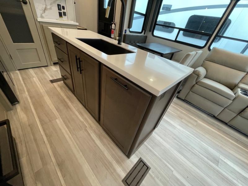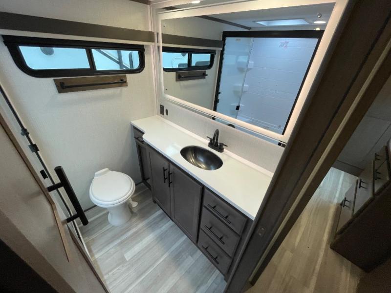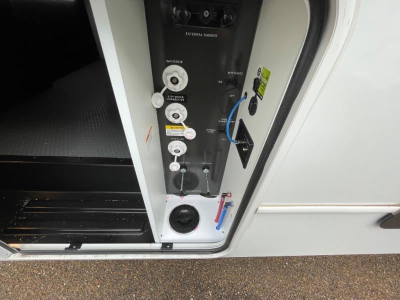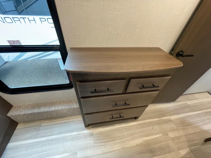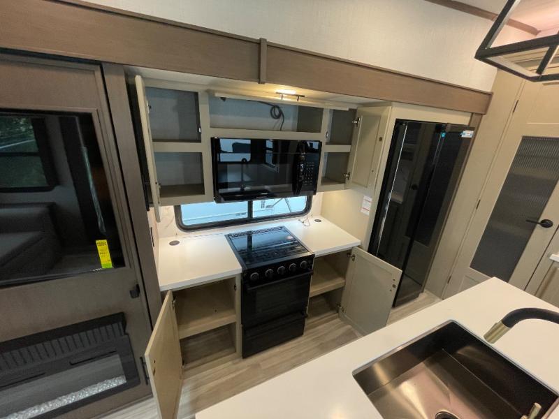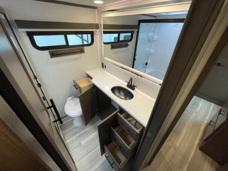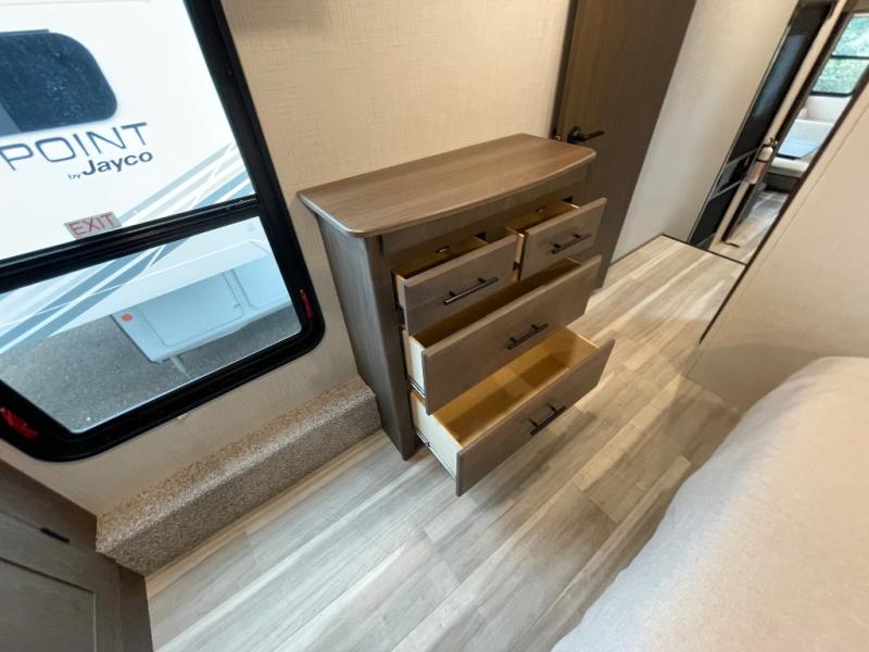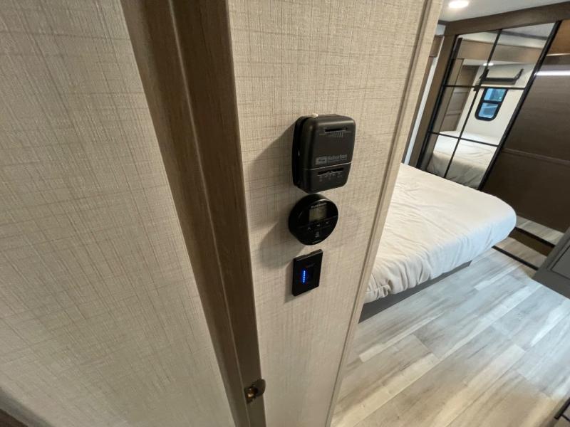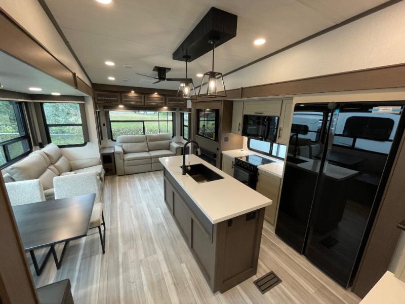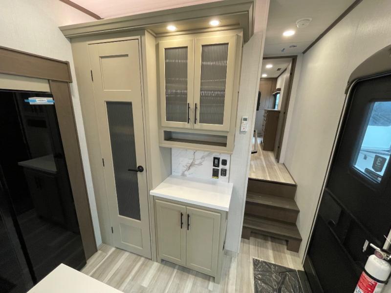 The dual opposing slides in the combined kitchen and living area will give you an open floorplan! You'll sleep on the queen-size bed in the front private bedroom, and there is under-bed storage, a full-height wardrobe, and a dresser with hidden storage for all of your personal belongings. As you spend time in the main living area, you'll appreciate having extra space thanks to the set of opposing slides, and the kitchen island will be easy to work around. You'll be able to relax on the tri-fold sleeper sofa and theater seating while you watch the LED HDTV with an pivoting entertainment door and hidden pantry. There is also a booth dinette with storage drawers, convenient shoe storage right as you enter the unit, and an exterior unobstructed pass-thru storage so nothing gets left behind.