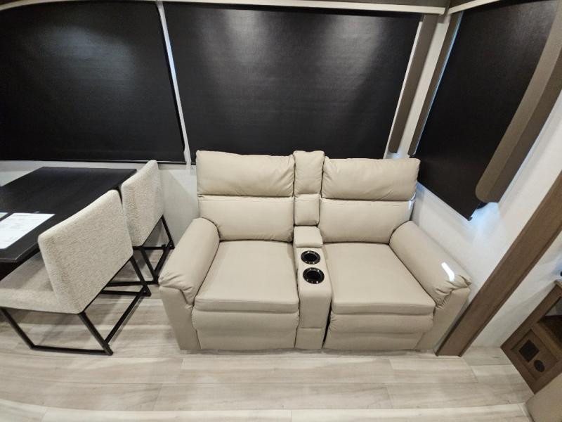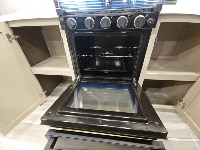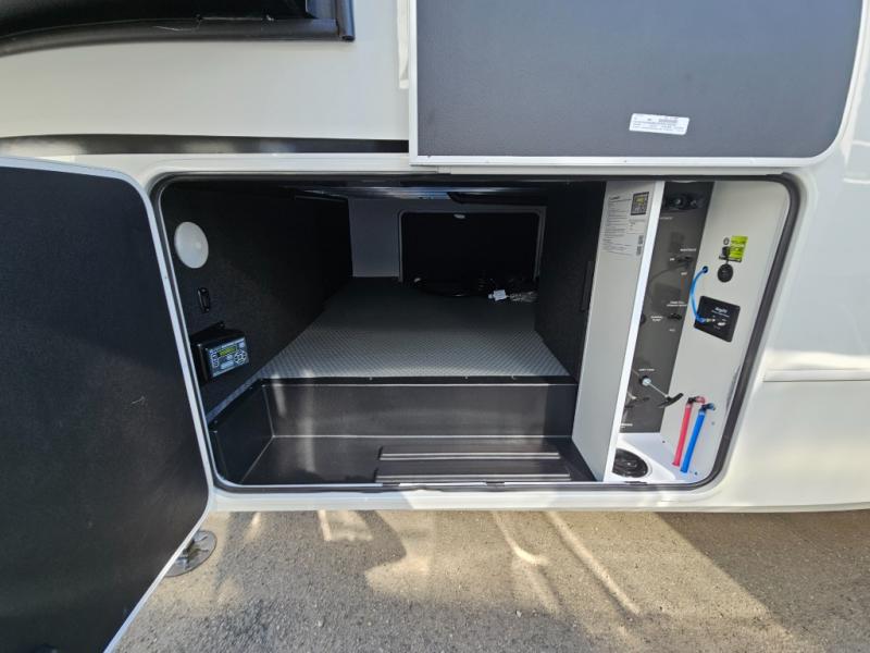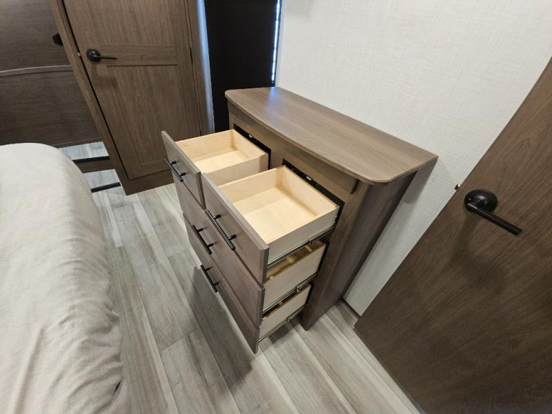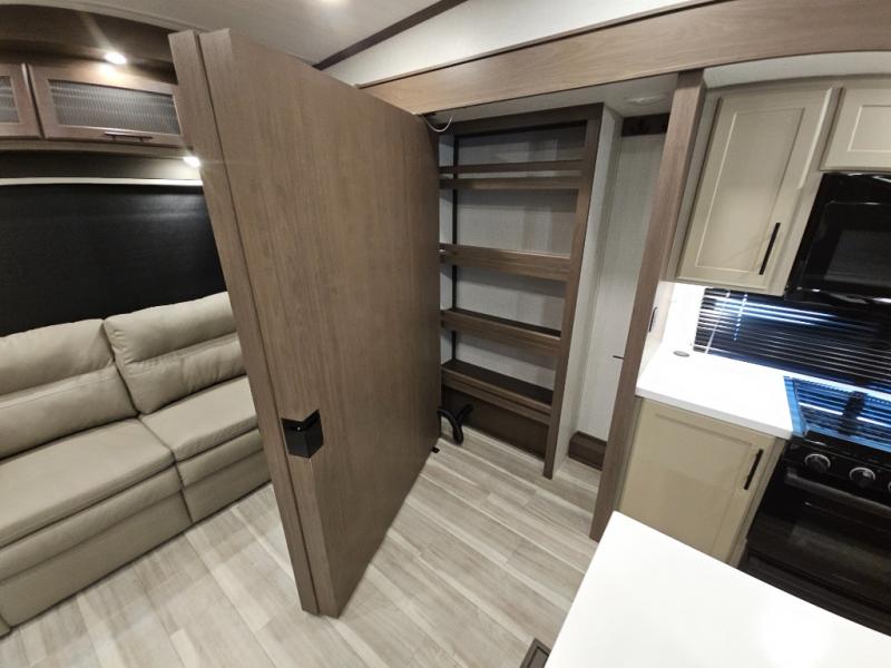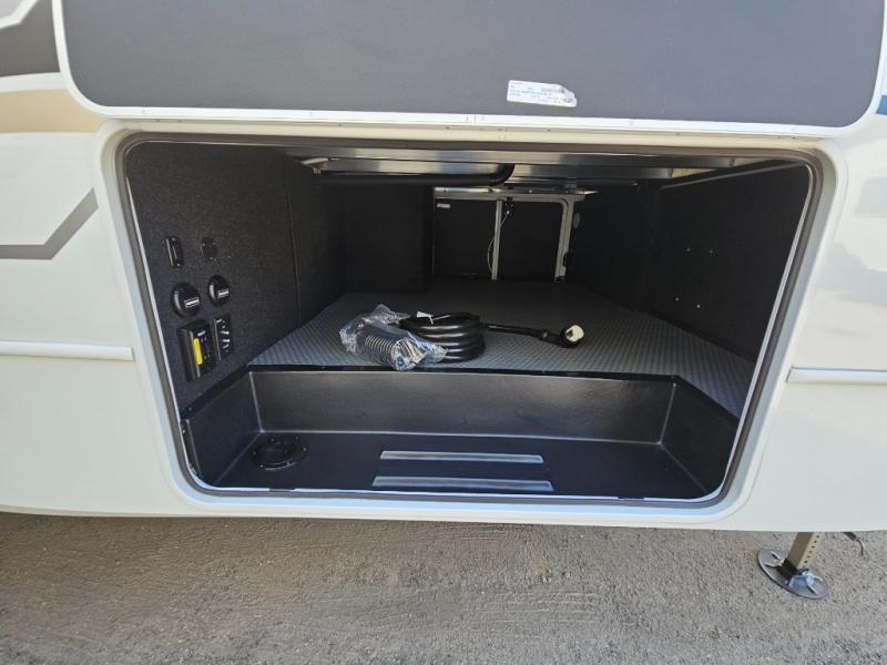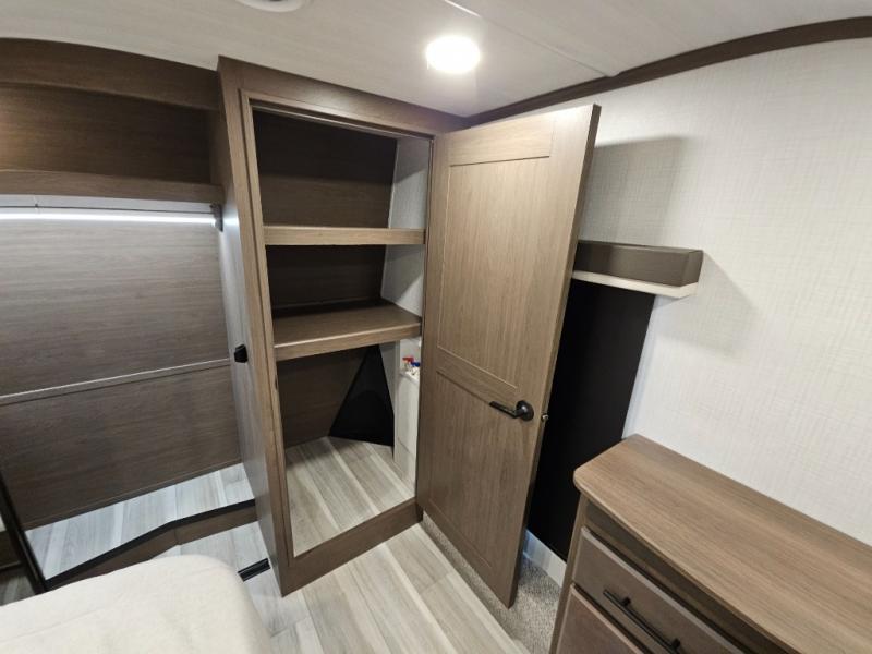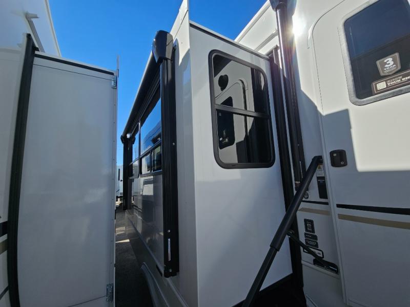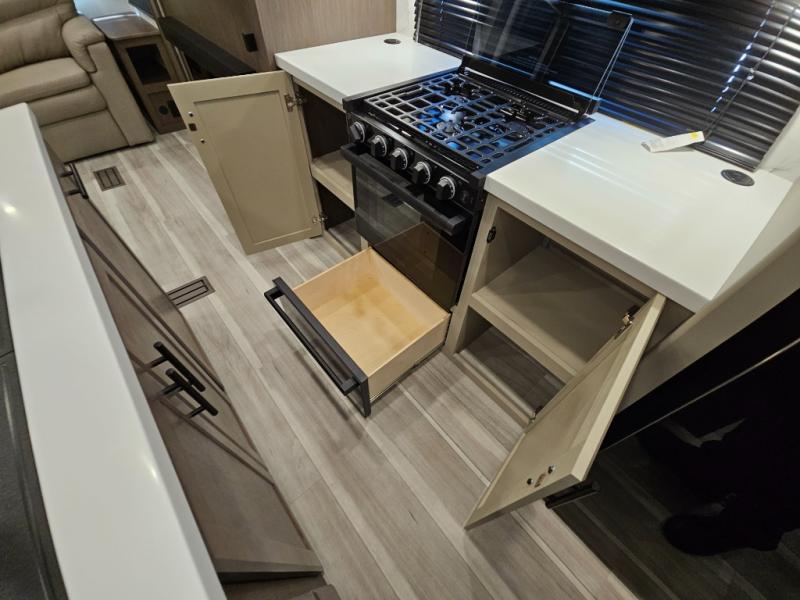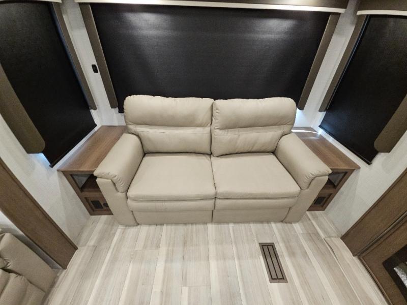 The dual opposing slides in the combined kitchen and living area will give you an open floorplan! You'll sleep on the queen-size bed in the front private bedroom, and there is under-bed storage, a full-height wardrobe, and a dresser with hidden storage for all of your personal belongings. As you spend time in the main living area, you'll appreciate having extra space thanks to the set of opposing slides, and the kitchen island will be easy to work around. You'll be able to relax on the tri-fold sleeper sofa and theater seating while you watch the LED HDTV with an pivoting entertainment door and hidden pantry. There is also a booth dinette with storage drawers, convenient shoe storage right as you enter the unit, and an exterior unobstructed pass-thru storage so nothing gets left behind.