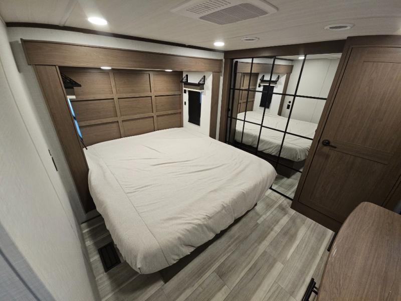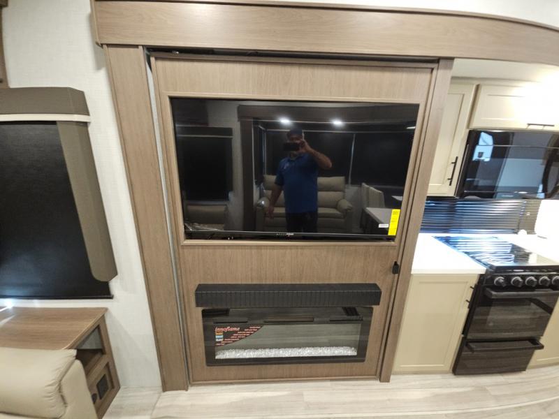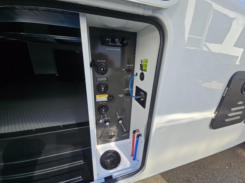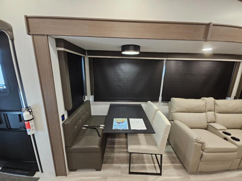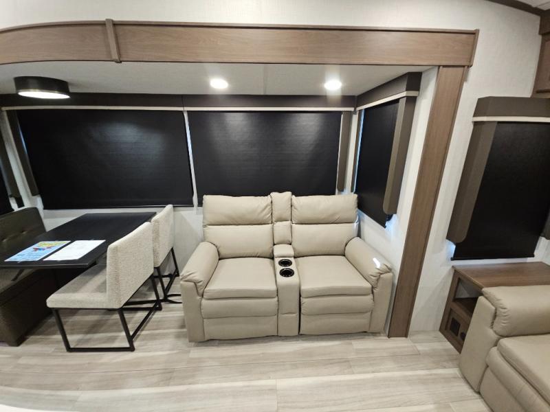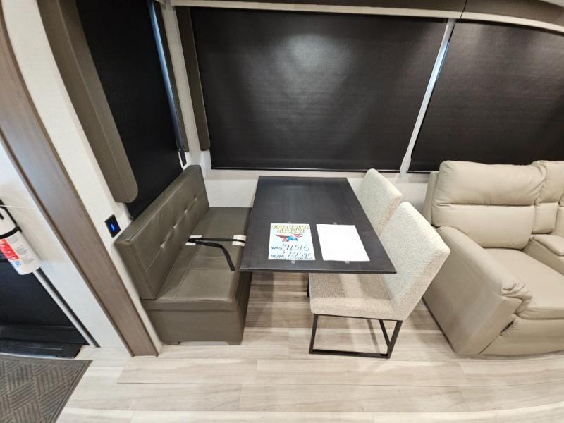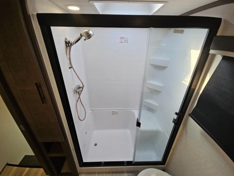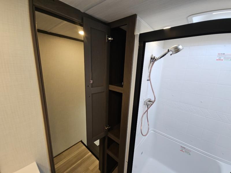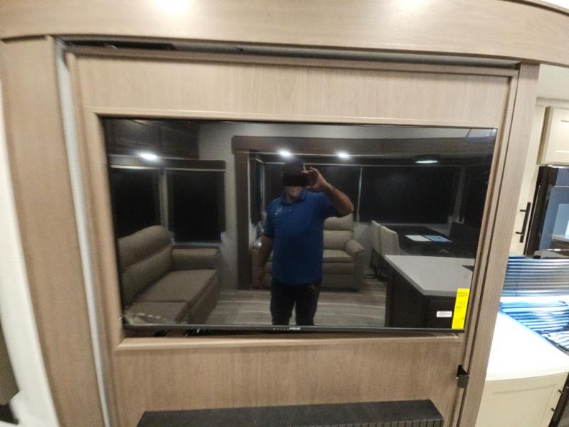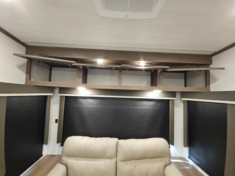 The dual opposing slides in the combined kitchen and living area will give you an open floorplan! You'll sleep on the queen-size bed in the front private bedroom, and there is under-bed storage, a full-height wardrobe, and a dresser with hidden storage for all of your personal belongings. As you spend time in the main living area, you'll appreciate having extra space thanks to the set of opposing slides, and the kitchen island will be easy to work around. You'll be able to relax on the tri-fold sleeper sofa and theater seating while you watch the LED HDTV with an pivoting entertainment door and hidden pantry. There is also a booth dinette with storage drawers, convenient shoe storage right as you enter the unit, and an exterior unobstructed pass-thru storage so nothing gets left behind.