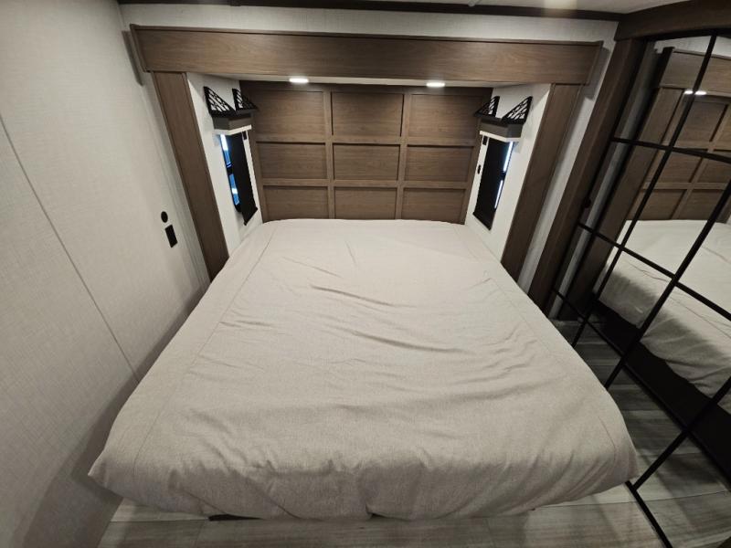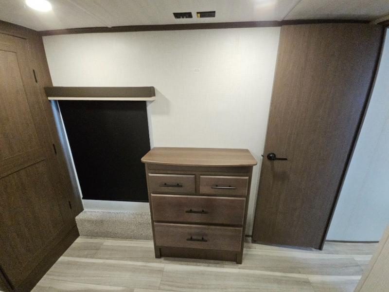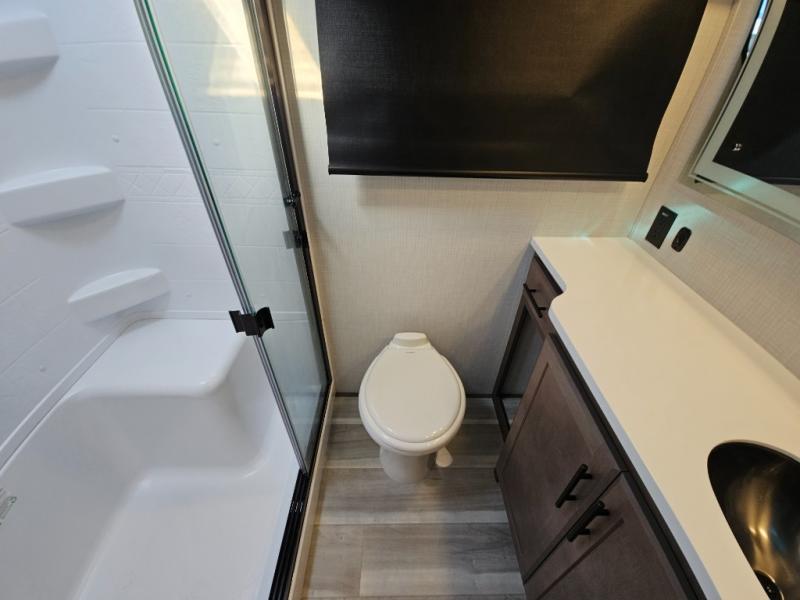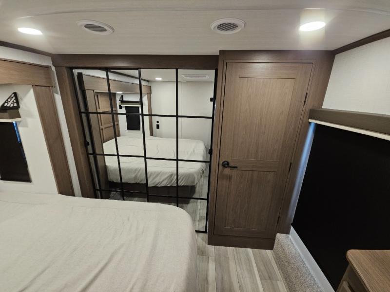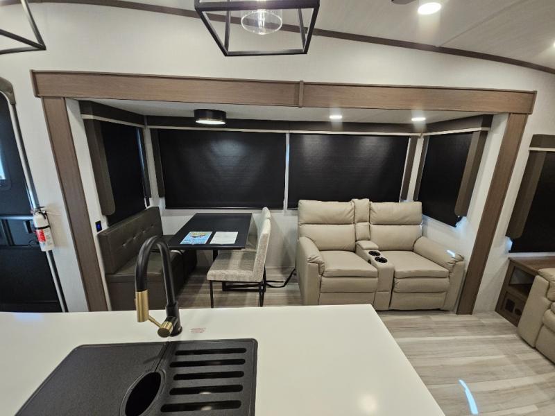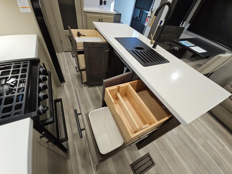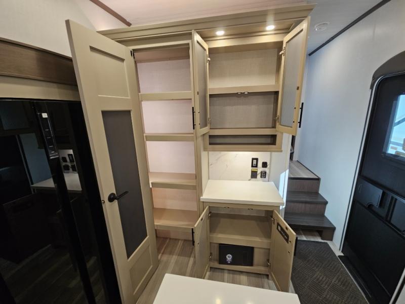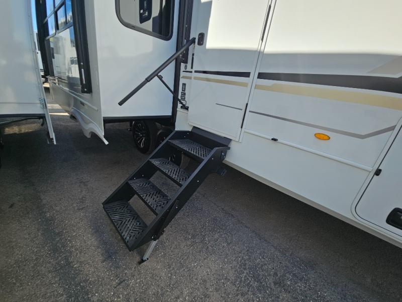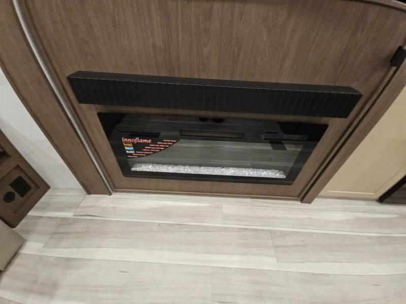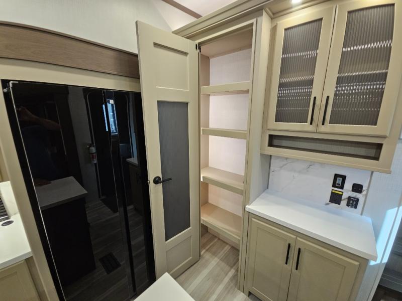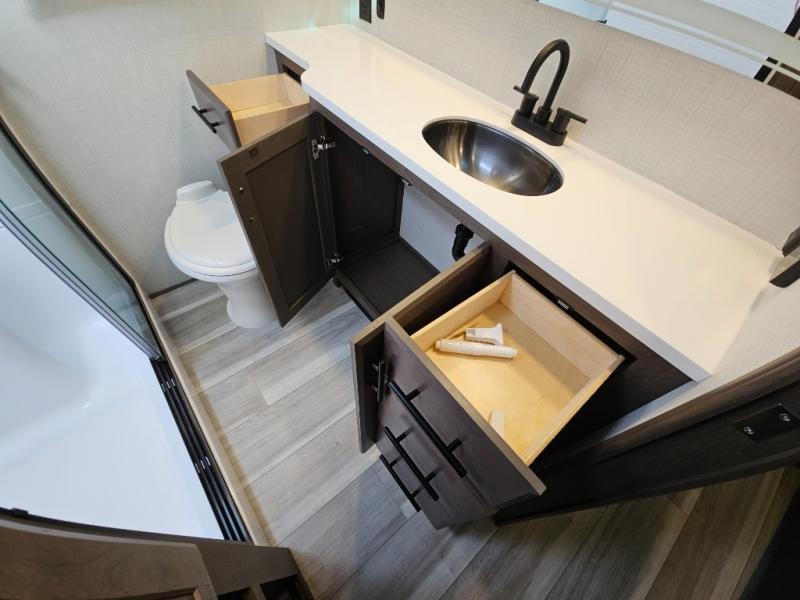 The dual opposing slides in the combined kitchen and living area will give you an open floorplan! You'll sleep on the queen-size bed in the front private bedroom, and there is under-bed storage, a full-height wardrobe, and a dresser with hidden storage for all of your personal belongings. As you spend time in the main living area, you'll appreciate having extra space thanks to the set of opposing slides, and the kitchen island will be easy to work around. You'll be able to relax on the tri-fold sleeper sofa and theater seating while you watch the LED HDTV with an pivoting entertainment door and hidden pantry. There is also a booth dinette with storage drawers, convenient shoe storage right as you enter the unit, and an exterior unobstructed pass-thru storage so nothing gets left behind.
