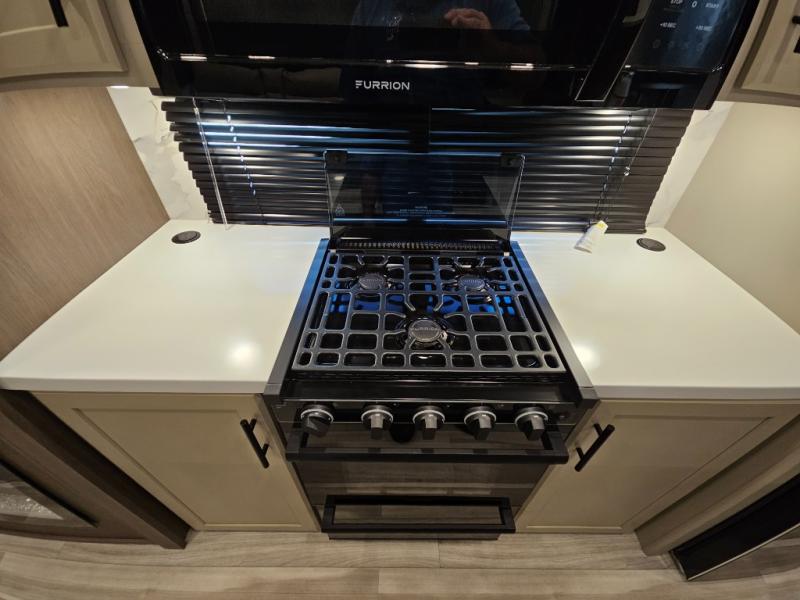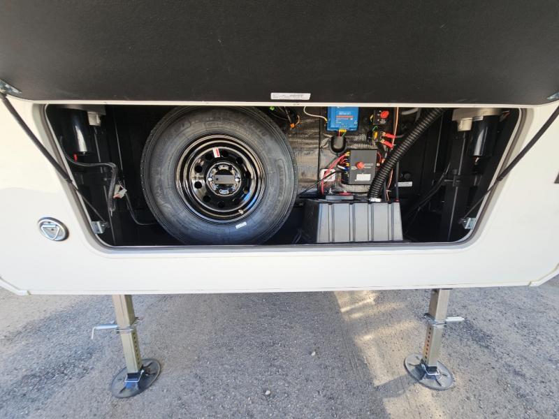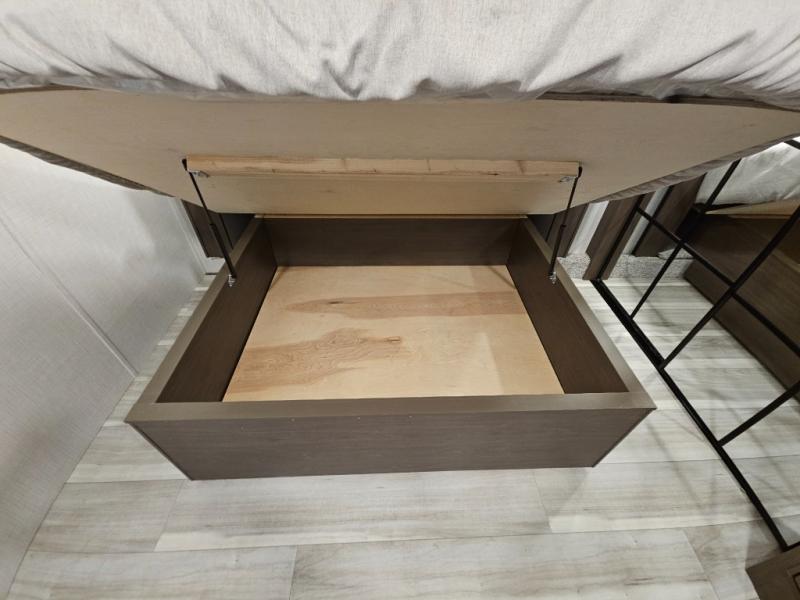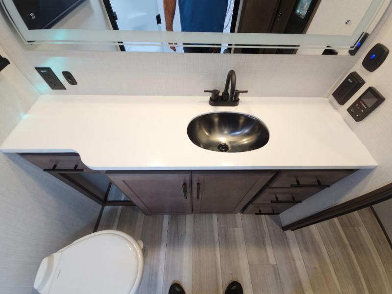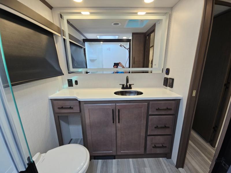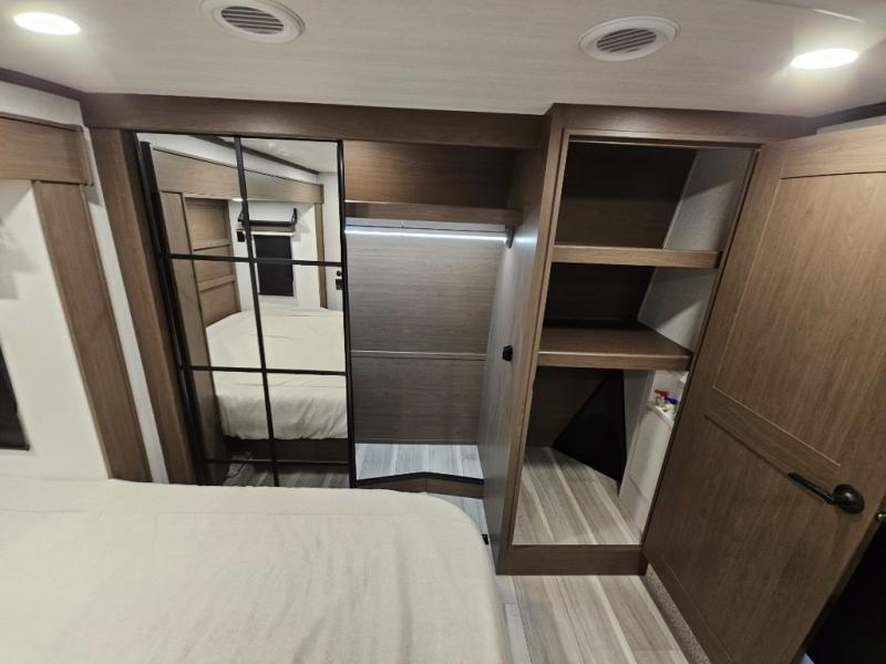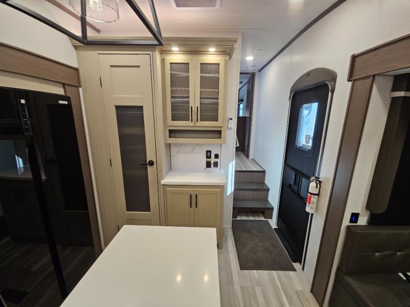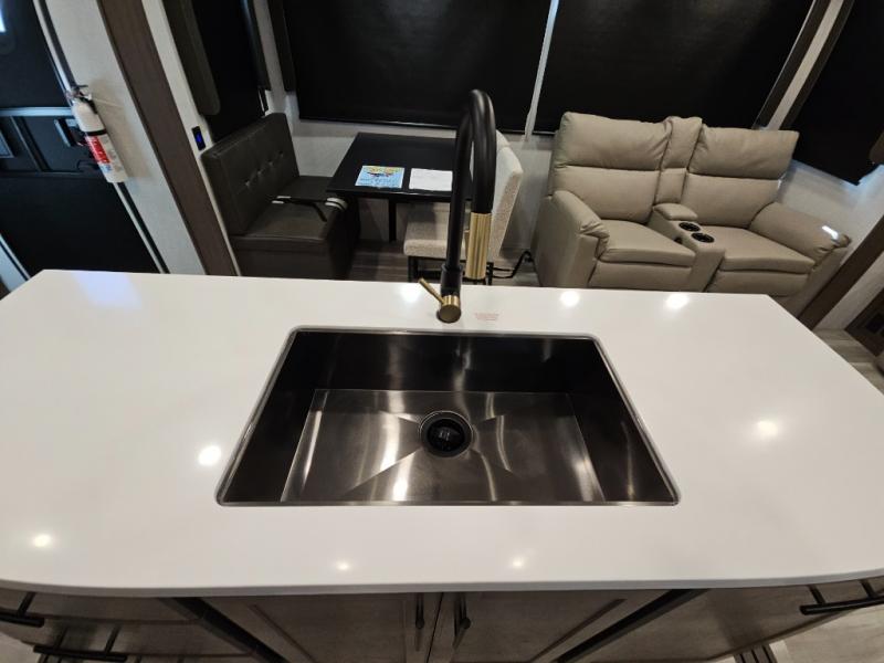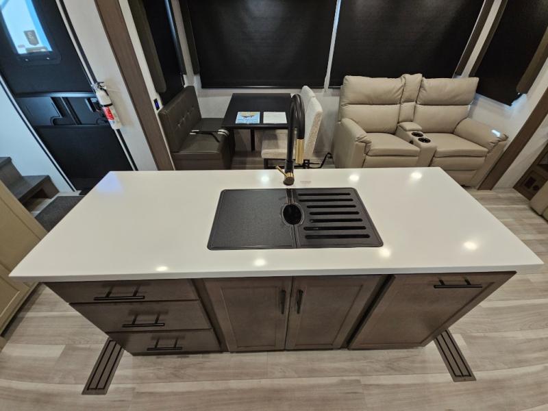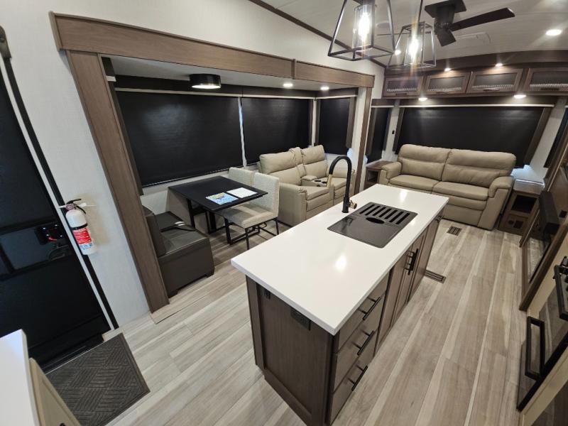 The dual opposing slides in the combined kitchen and living area will give you an open floorplan! You'll sleep on the queen-size bed in the front private bedroom, and there is under-bed storage, a full-height wardrobe, and a dresser with hidden storage for all of your personal belongings. As you spend time in the main living area, you'll appreciate having extra space thanks to the set of opposing slides, and the kitchen island will be easy to work around. You'll be able to relax on the tri-fold sleeper sofa and theater seating while you watch the LED HDTV with an pivoting entertainment door and hidden pantry. There is also a booth dinette with storage drawers, convenient shoe storage right as you enter the unit, and an exterior unobstructed pass-thru storage so nothing gets left behind.
