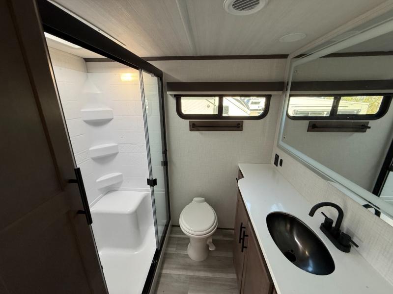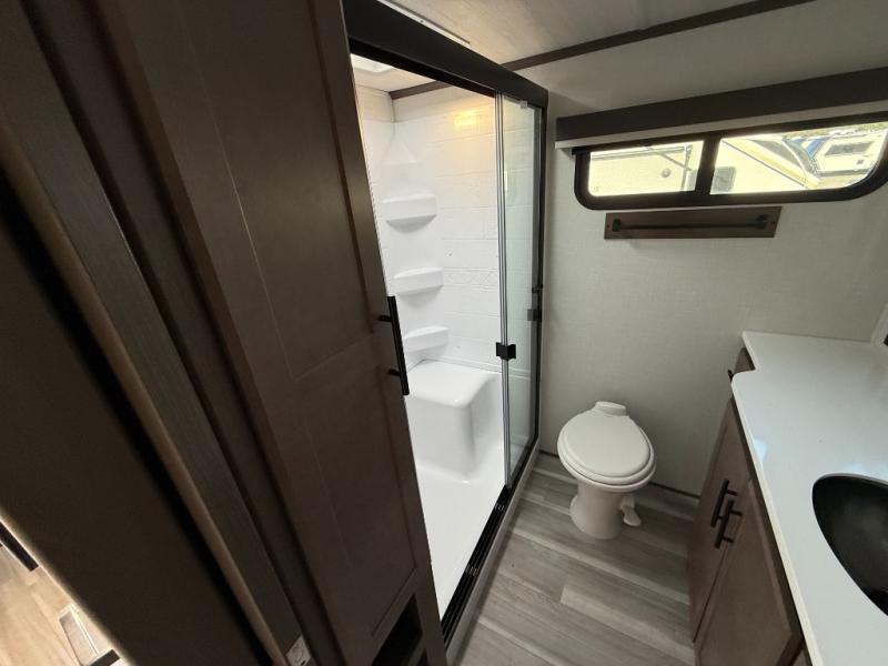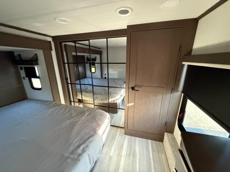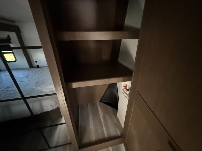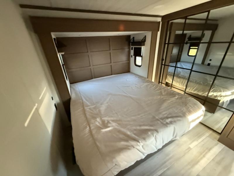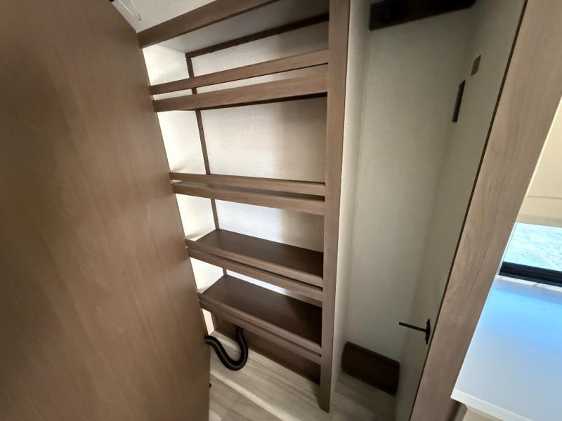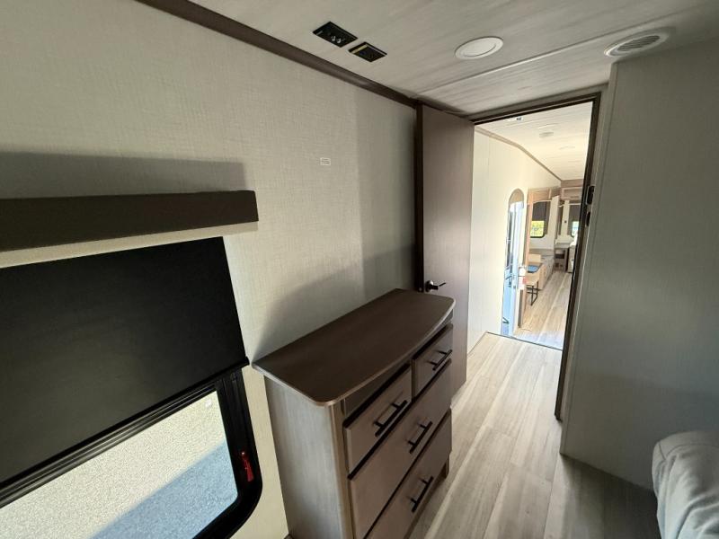 The dual opposing slides in the combined kitchen and living area will give you an open floorplan! You'll sleep on the queen-size bed in the front private bedroom, and there is under-bed storage, a full-height wardrobe, and a dresser with hidden storage for all of your personal belongings. As you spend time in the main living area, you'll appreciate having extra space thanks to the set of opposing slides, and the kitchen island will be easy to work around. You'll be able to relax on the tri-fold sleeper sofa and theater seating while you watch the LED HDTV with an pivoting entertainment door and hidden pantry. There is also a booth dinette with storage drawers, convenient shoe storage right as you enter the unit, and an exterior unobstructed pass-thru storage so nothing gets left behind.