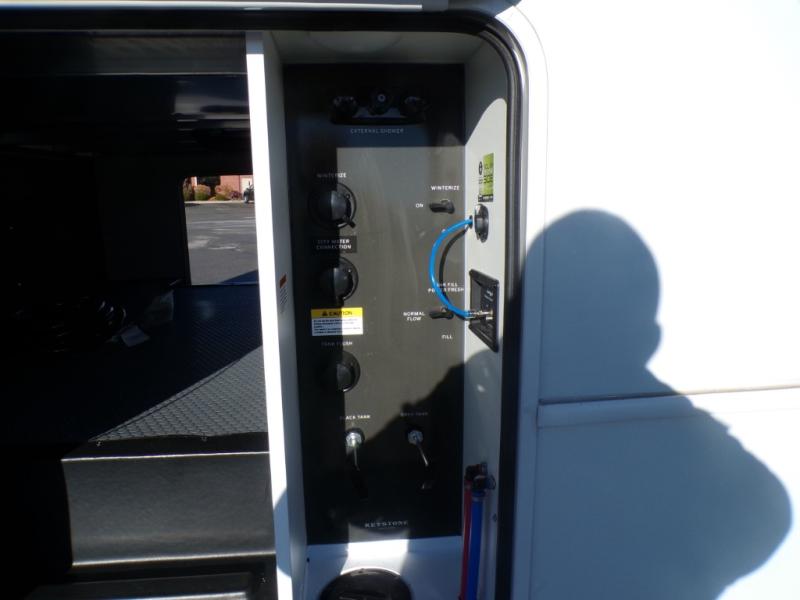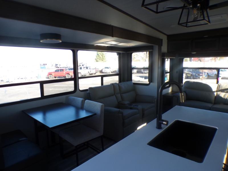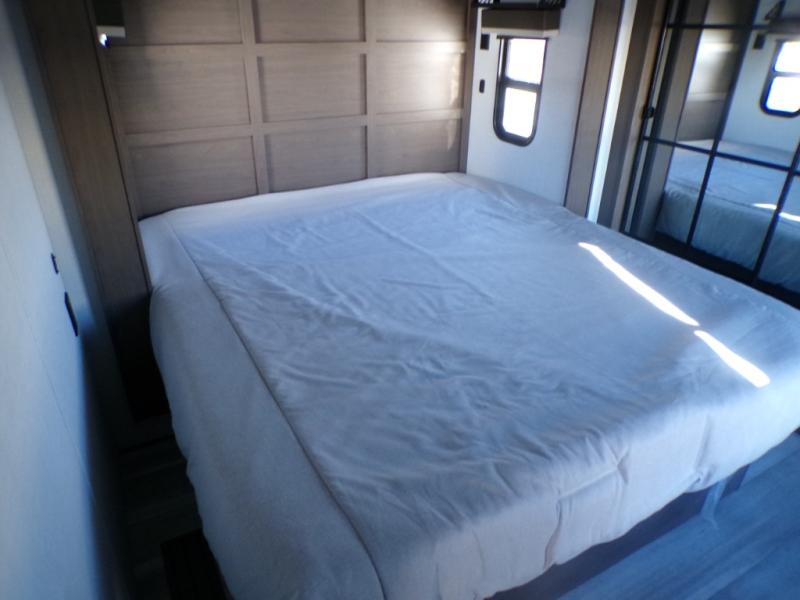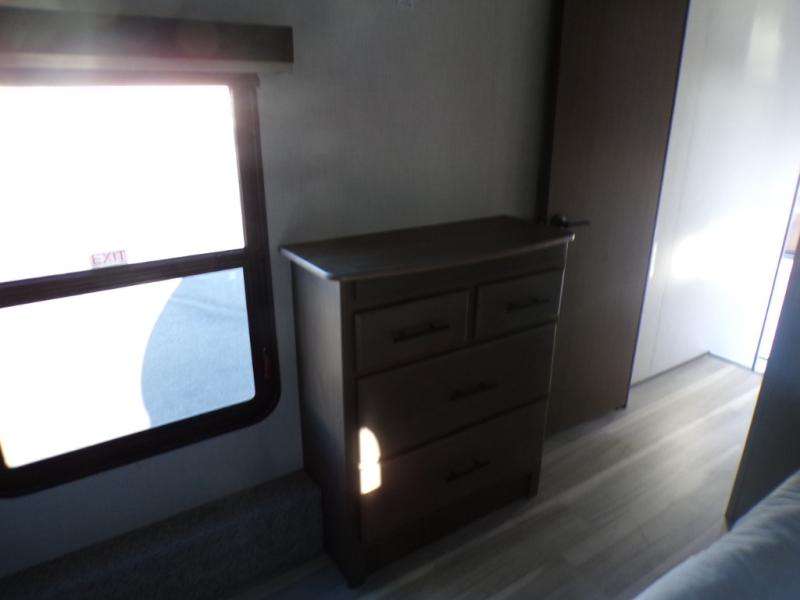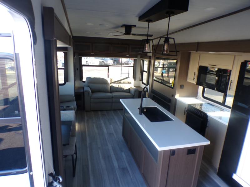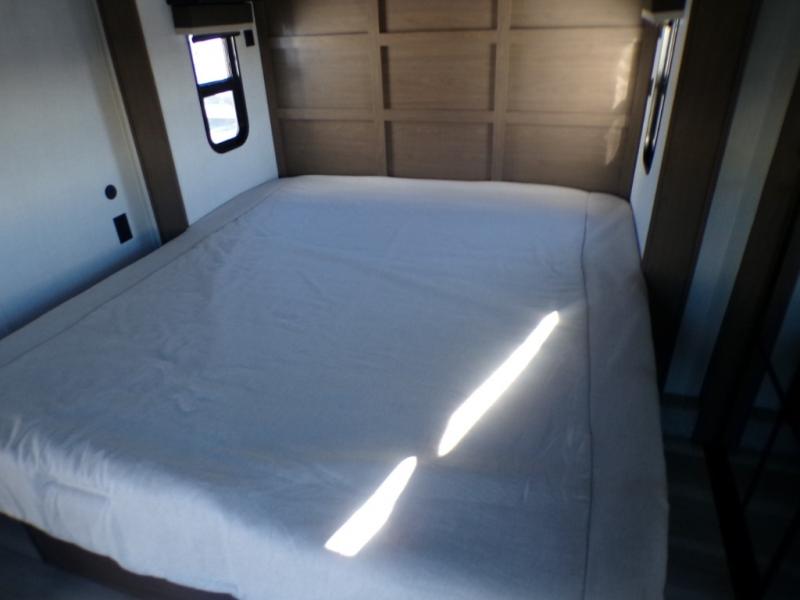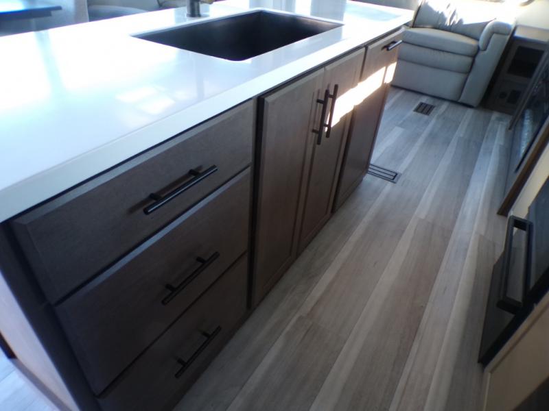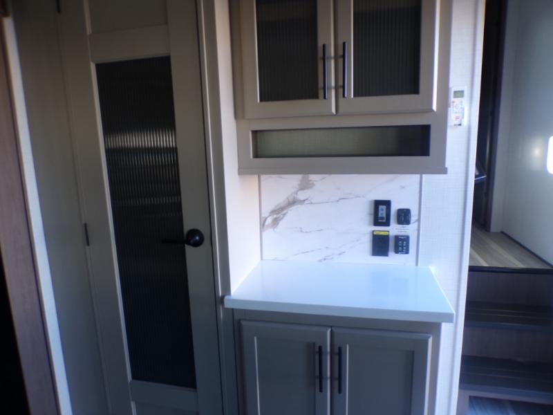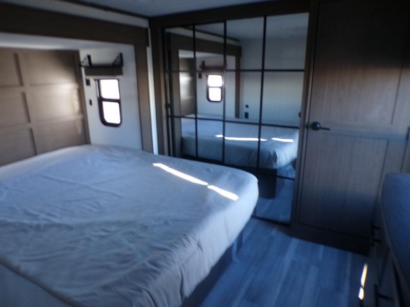 The dual opposing slides in the combined kitchen and living area will give you an open floorplan! You'll sleep on the queen-size bed in the front private bedroom, and there is under-bed storage, a full-height wardrobe, and a dresser with hidden storage for all of your personal belongings. As you spend time in the main living area, you'll appreciate having extra space thanks to the set of opposing slides, and the kitchen island will be easy to work around. You'll be able to relax on the tri-fold sleeper sofa and theater seating while you watch the LED HDTV with an pivoting entertainment door and hidden pantry. There is also a booth dinette with storage drawers, convenient shoe storage right as you enter the unit, and an exterior unobstructed pass-thru storage so nothing gets left behind.